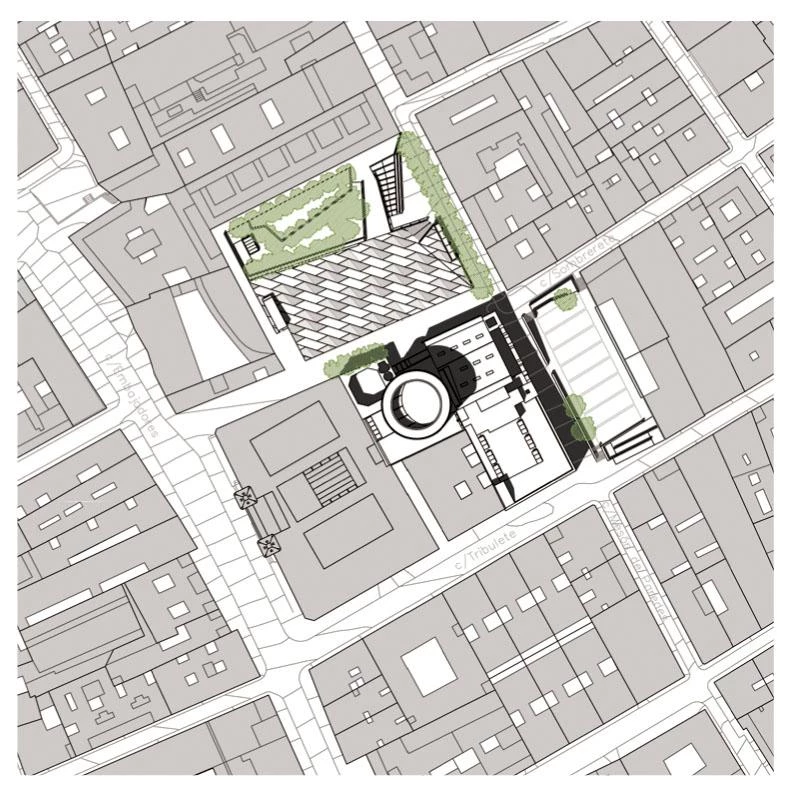On december of 2001, Madrid’s Lavapiés quarter celebrated the inauguration of Agustín Lara square, remodelled after the winning project of a competition convened by the Gerencia Municipal de Urbanismo. The program buried a four-level parking lot and spanned a two-level unevenness, concentrating the ramps and a stairway on the side of Mesón de Paredes street. Different materials separated one area from another: granite in the circulations, concrete paving in the tree-lined area and Portuguese black and white paving, in the shape of giant rhombi, in the central space. Presiding the southern side of this plaza are the Escuelas Pías de San Fernando, which had survived a neglect of over seventy years, since the fire of 1936. Their restoration concludes now – second phase of the project for the recovery of the area –, comprising the adaptation of the church as a library and the construction of a lecture hall for the Universidad Nacional de Educación a Distancia.