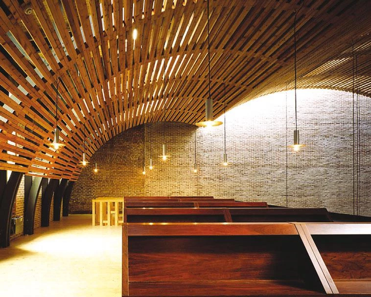 The facade of the lecture hall, aligned with the church wall, has large pine wood openings along one brick wall. A freestanding staircase of treated wood and steel links the classrooms with the library.