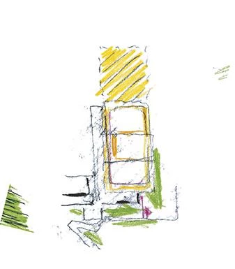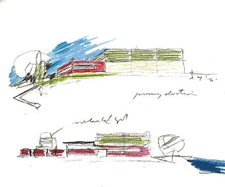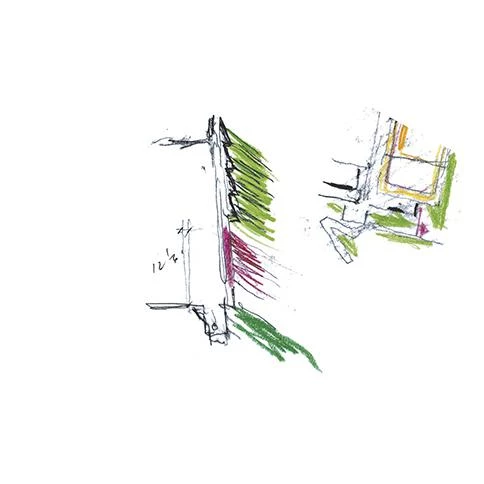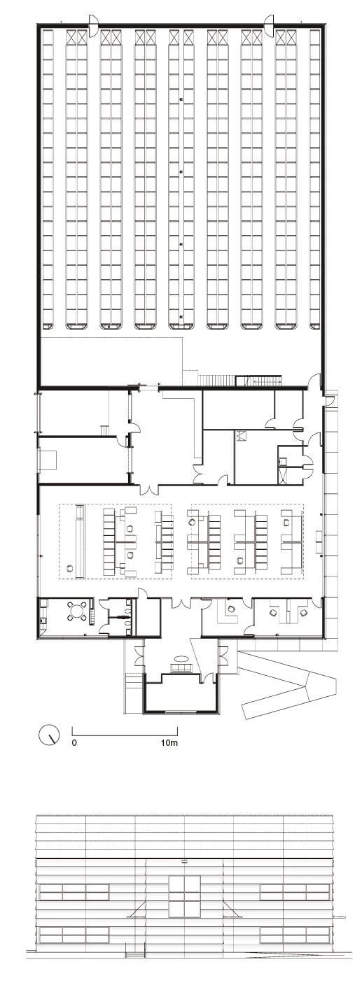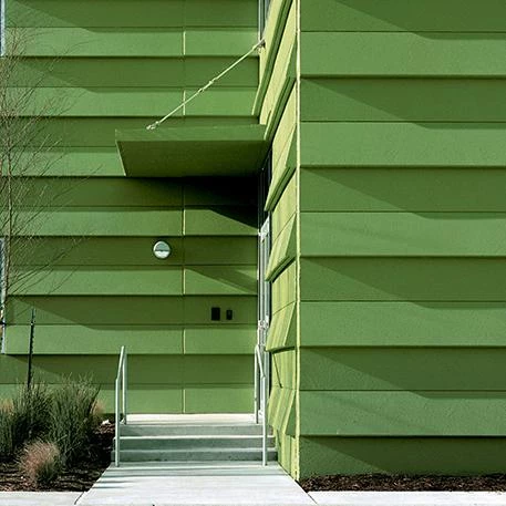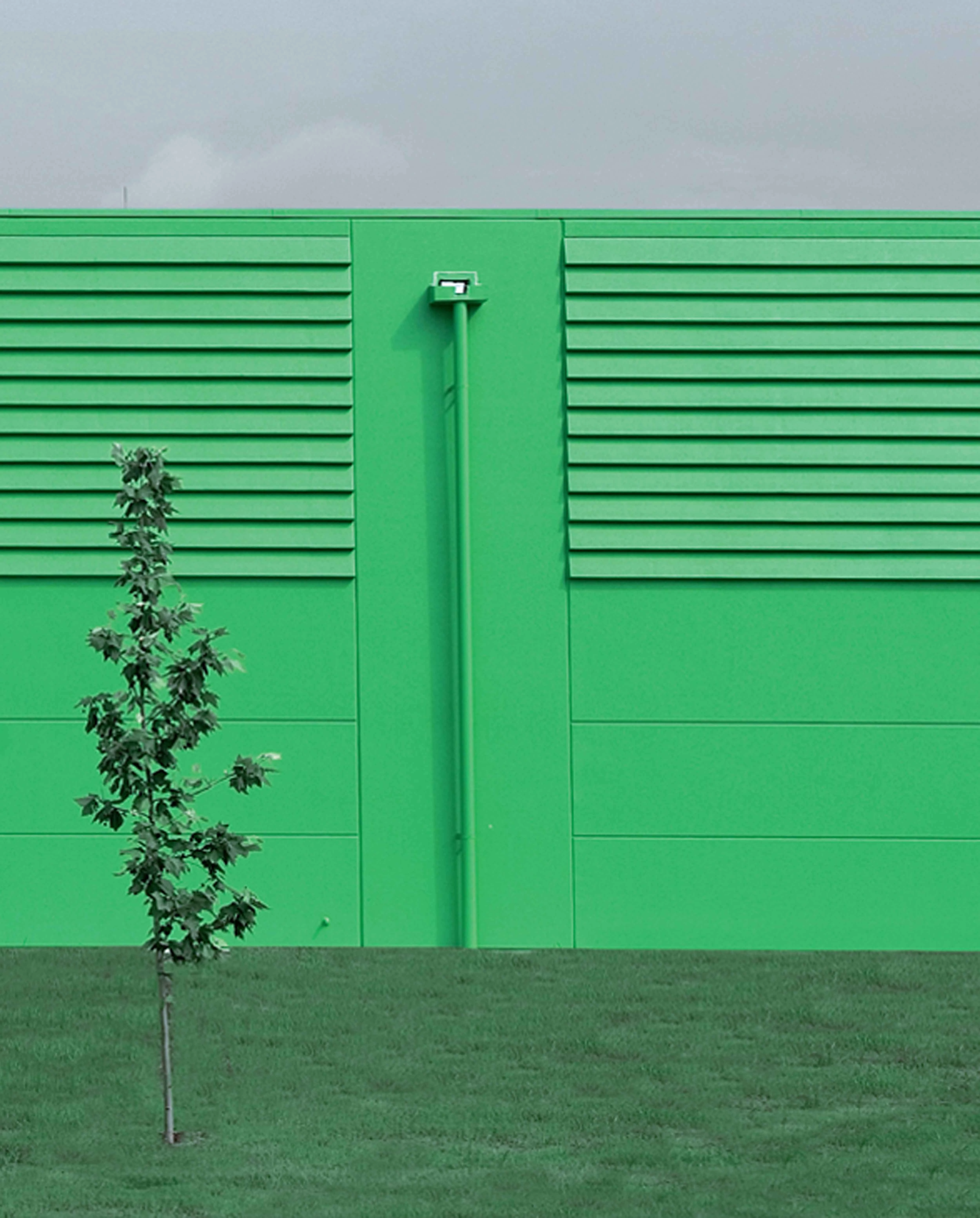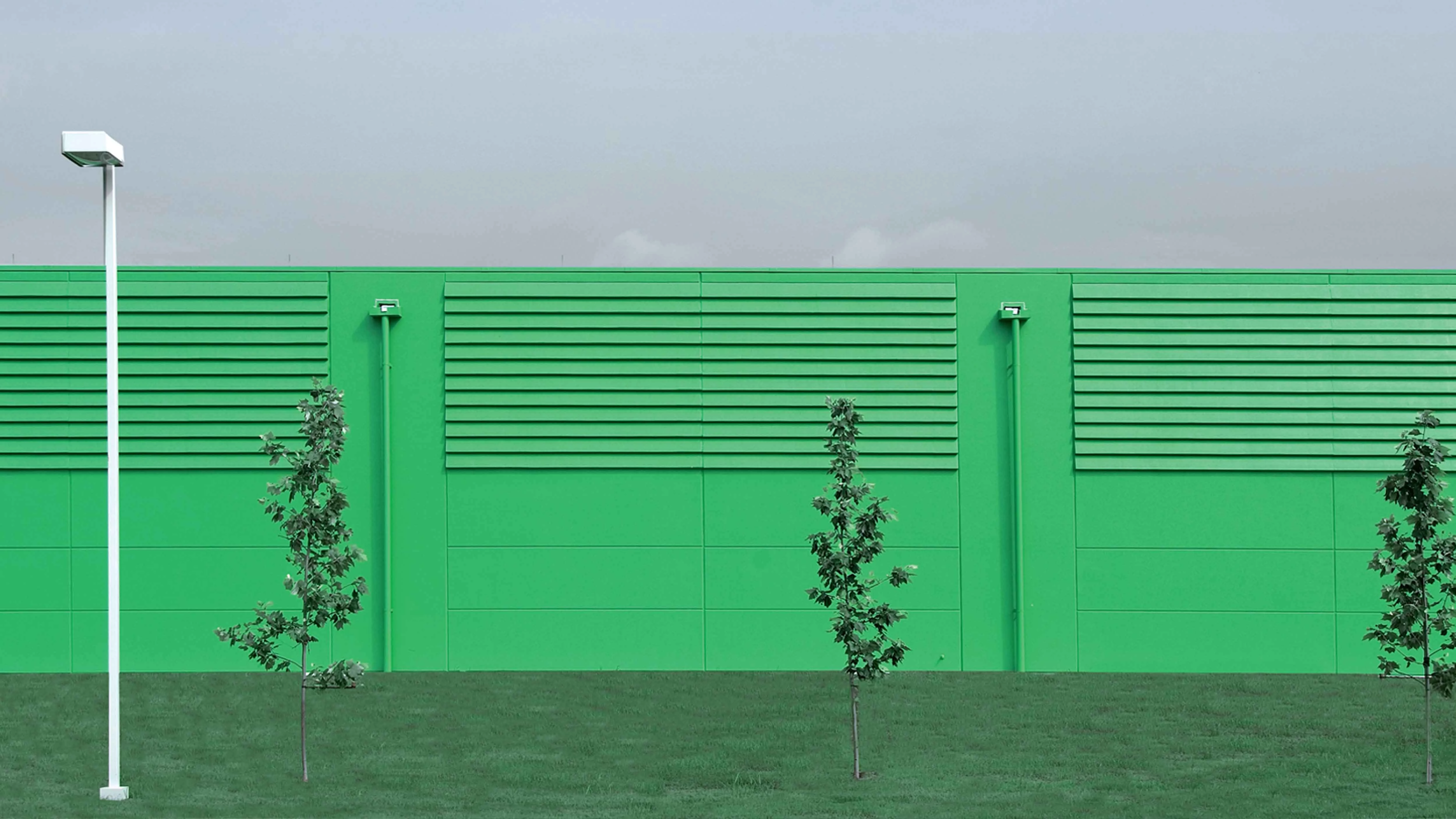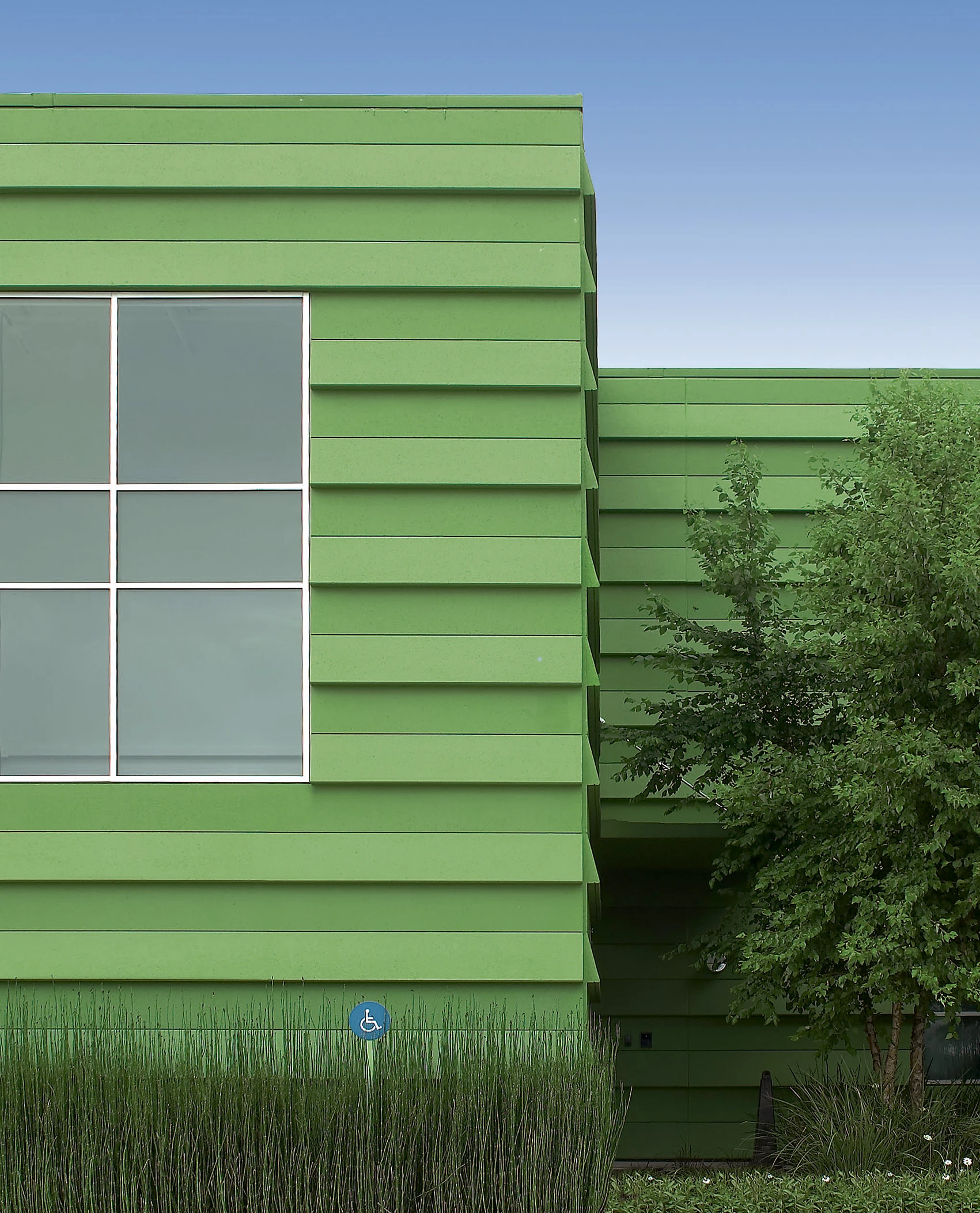 The primary exterior material for both buildings is a customized tilt-up concrete wall system designed to give each building’s envelope a distinct opacity. Painted in a spectrum of bright fluorescent greens, the buildings acquire the presence of geometric topiaries across a vast green field.