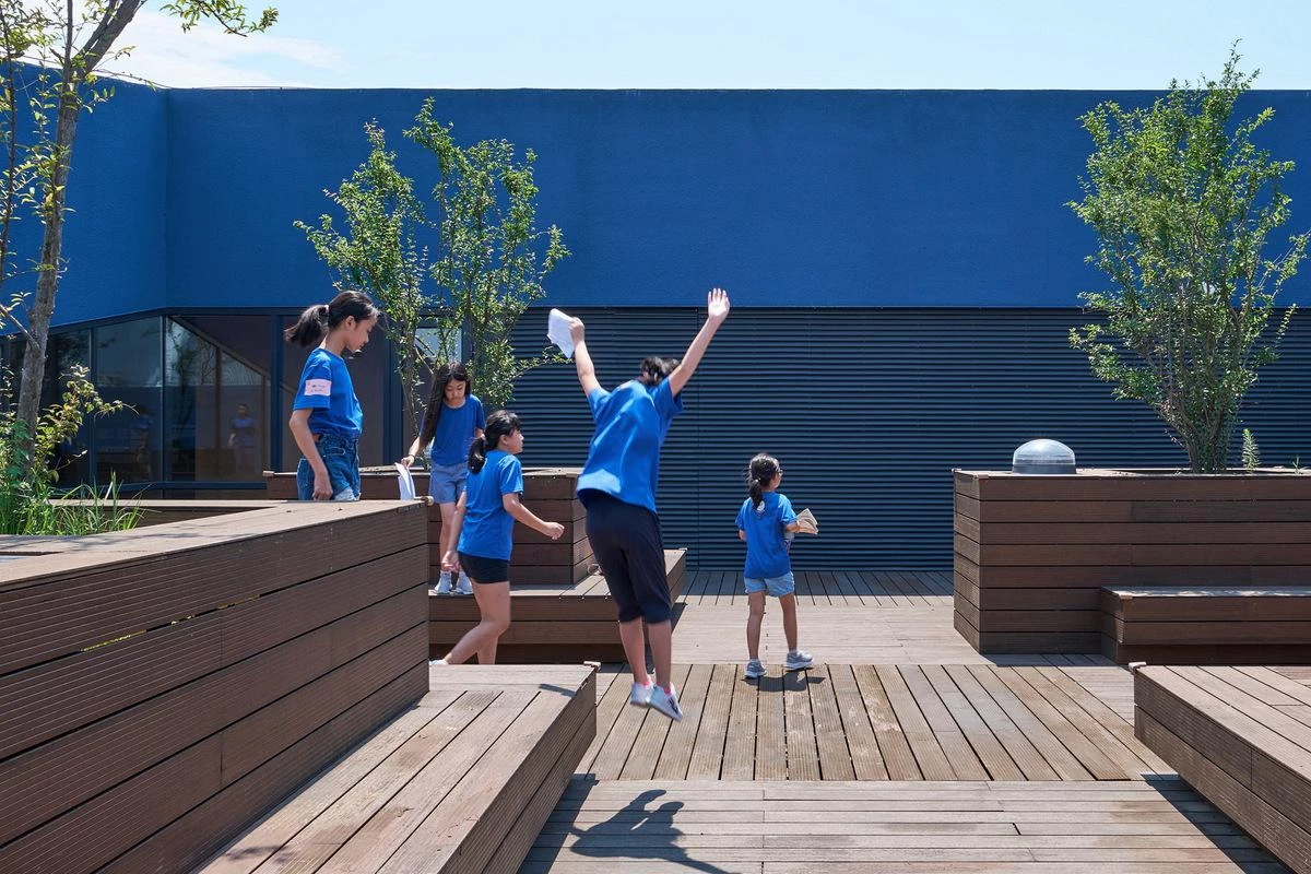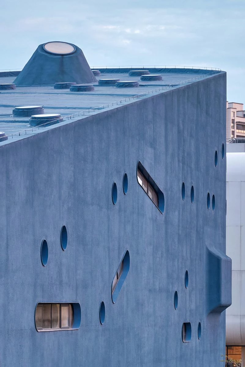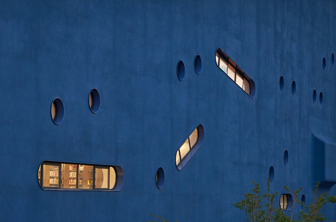 The firm headed by Li Hu and Huang Wenjing, Open Architecture, working from offices in New York and Beijing, has designed a campus for the Qingpu Pinghe International School in Shanghai, which has students aged 4 through 18. One of the buildings, the Pinghe Bibliotheater – with its rectangular floor plan and curved corners, and known as ‘the blue whale,’ contains theaters, the library, and a cafeteria.