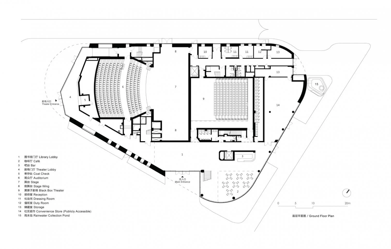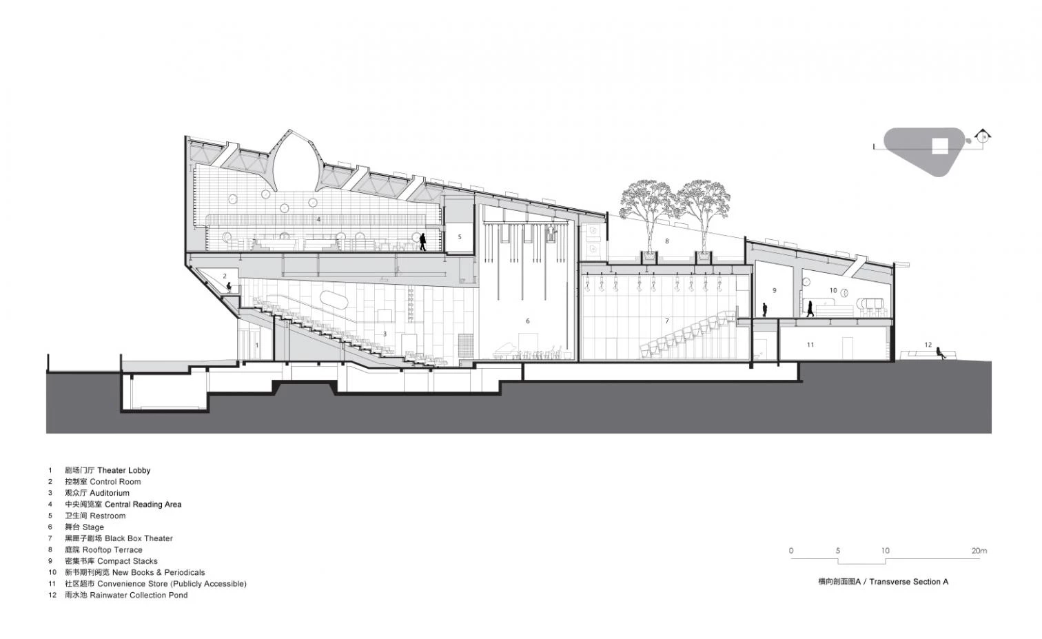 The uses are laid out in accordance with need for natural light and acoustic insulation. Hence the auditoriums are on ground level and the library’s main reading room is on the top floor, where the sloping roof is perforated with circular skylights and a roof garden crowns the building. El Pinghe Bibliotheater is designed for the local community to use after school hours.