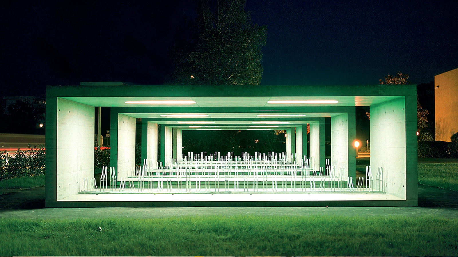 Cinco prismas de base rectangular de hormigón armado, construidos con encofrados de tableros de madera, albergan un pequeño aparcamiento para las bicicletas de los alumnos de un centro de educación secundaria.