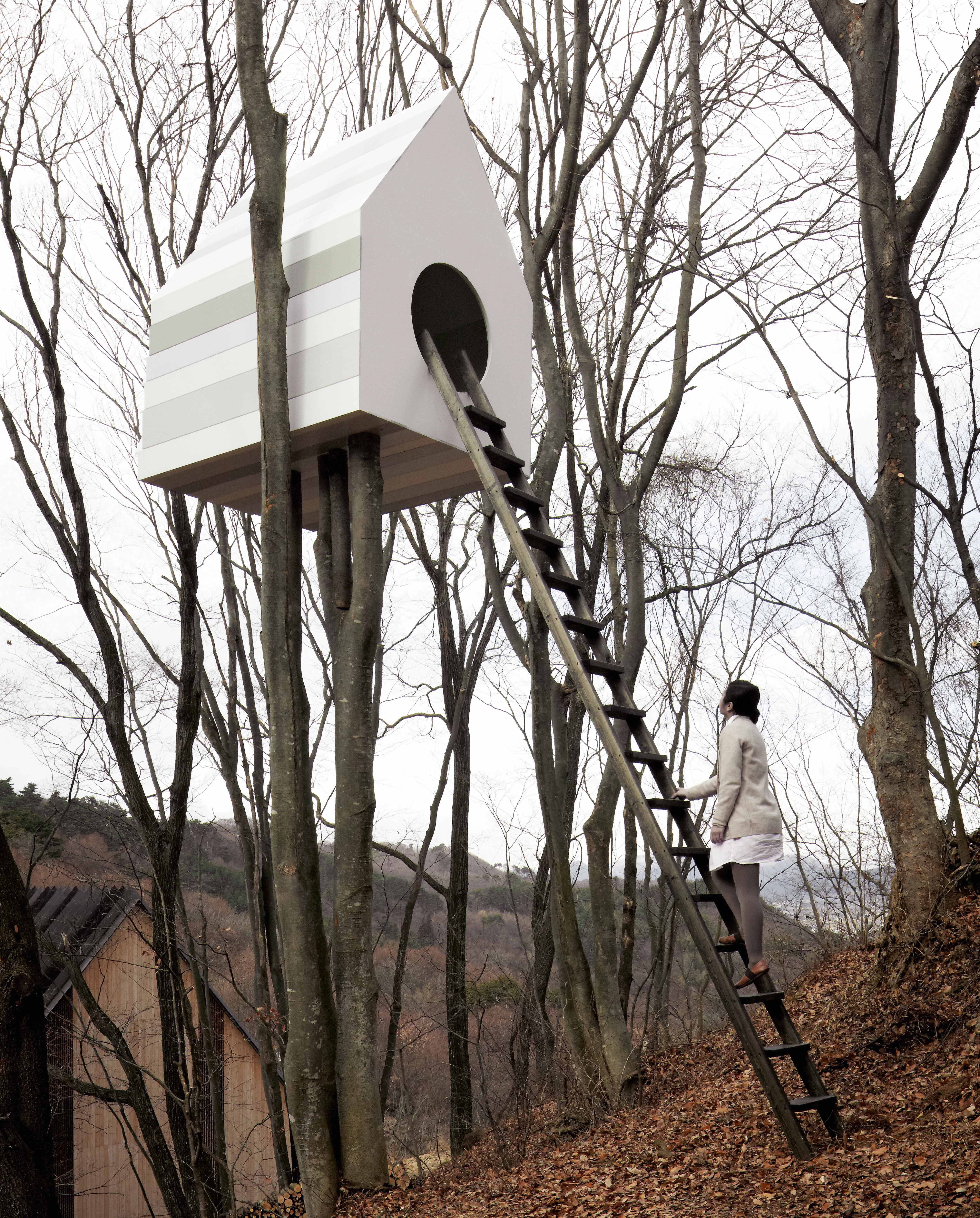 A hut made of wood panels, with urethane coating on its exterior, houses 78 nests for birds on one of its sides; on the other, a small room that can be reached after climbing a ladder allows to watch the birds from a short distance.