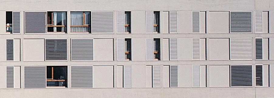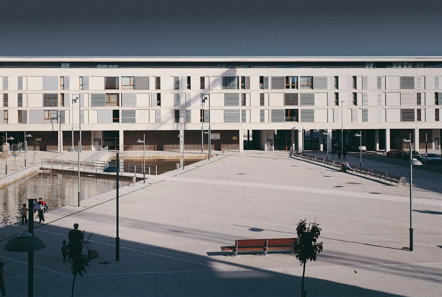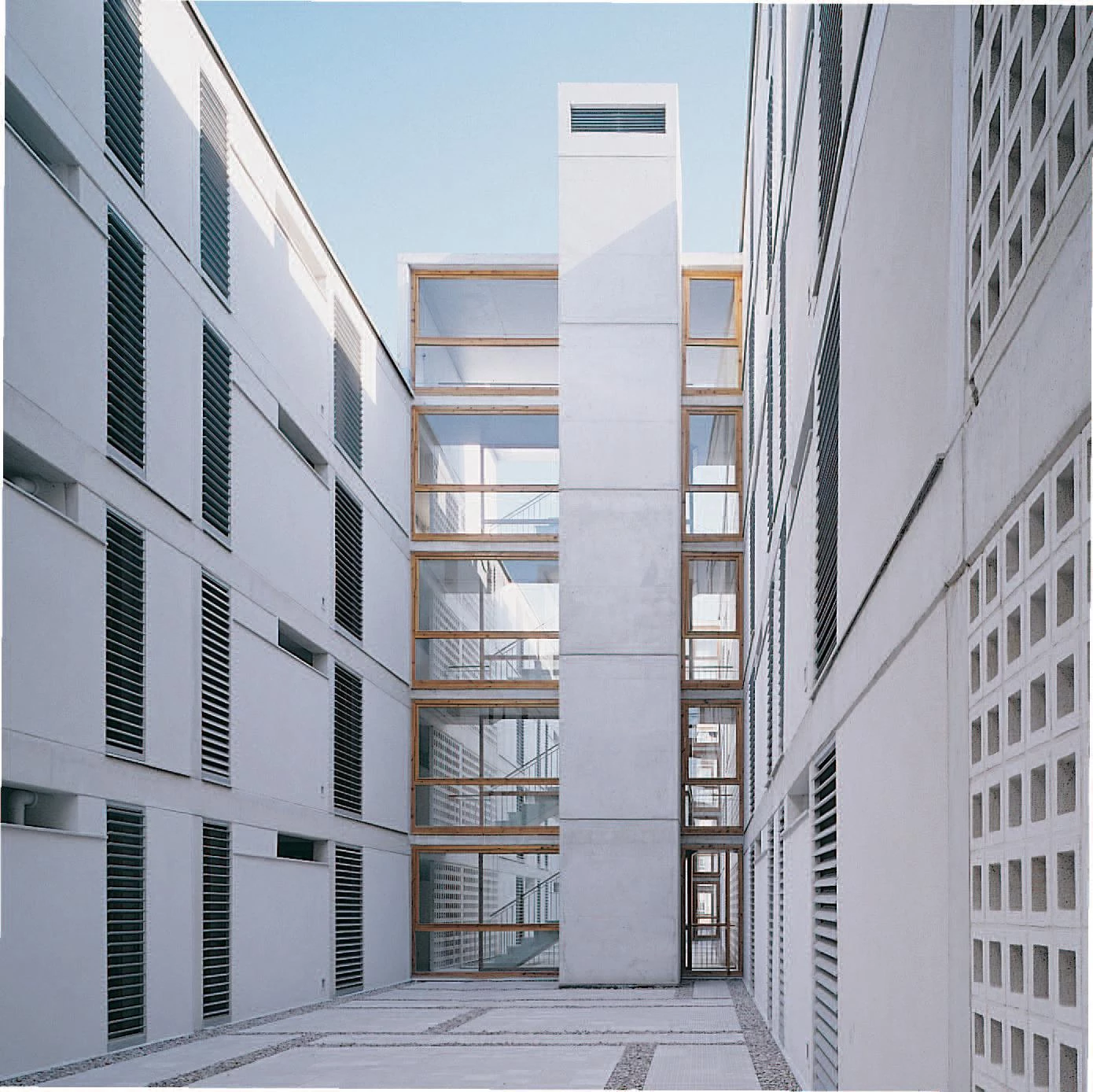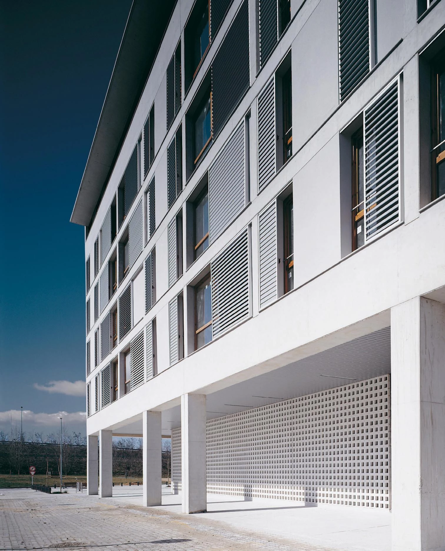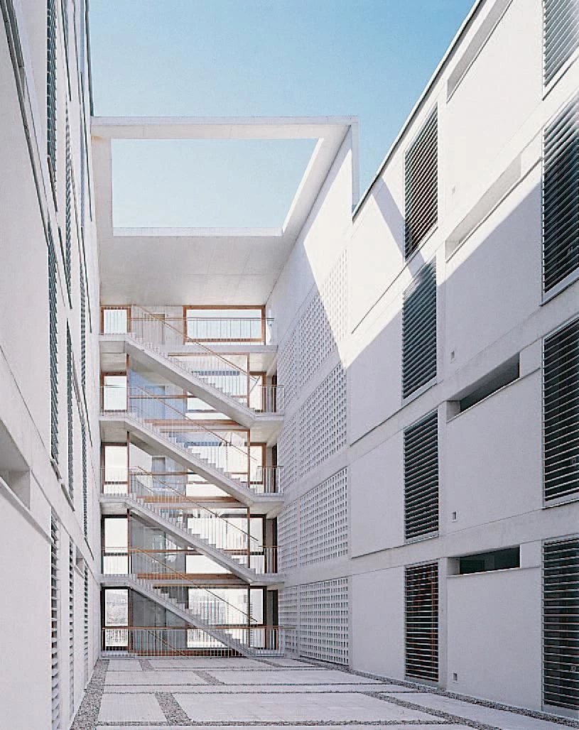 A simple volume without recesses, cutting down the number of circulation cores and the reiteration of simple constructional solutions, has made it possible to reduce the total building cost and to improve the quality of the finish, beyond what is common in this type of housing developments. Aluminum slats, walls with monolayer mortar parging and hollow brick latticework round off these elevations which use the color white as common denominator. The same finish is compulsory by regulation for the buildings that complete the square, which will be commissioned to other teams of architects.