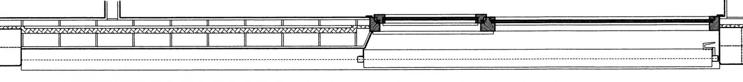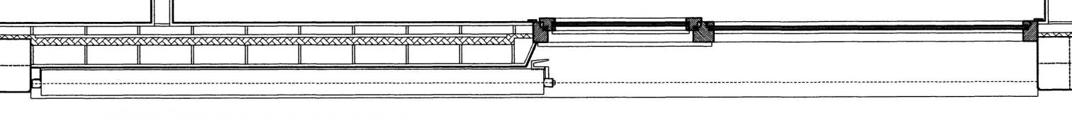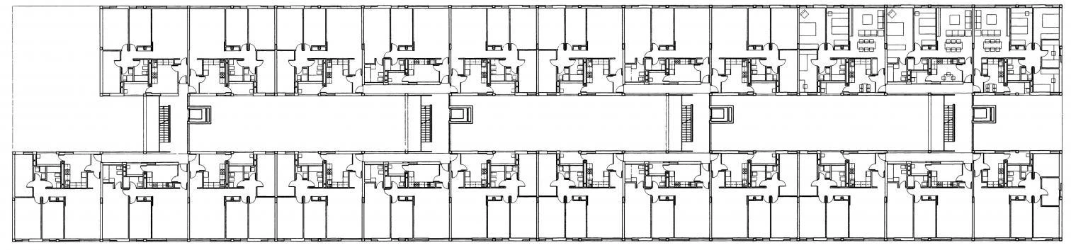 On a 27 meter wide and 120 meter long plot, the only bay foreseen by the initial design is replaced by two 4 and 5 story parallel blocks over a shopping arcade. The few courtyards foreseen in the partial plan are replaced by a large void that becomes the protagonist of the development. Only four circulation cores cross this space, forming semi-open transparent volumes that give access to six dwellings per floor. Partially adopting an access gallerie scheme, two open corridors start from these cores at each floor to connect with a two-room dwelling and two three-room dwellings on each end. All entrances and service facilities are grouped in the bays flanking the courtyard, while the living rooms and bedrooms are placed along the exterior facades . Clearly displaying this layout, the structural concrete grid is filled up on elevations with sliding shutters towards the street and is closed with fixed slats to maintain the courtyard’s privacy. A vertical opening aligned with one of the walls brings in a tangent plan of light into each bedroom of the dwellings.