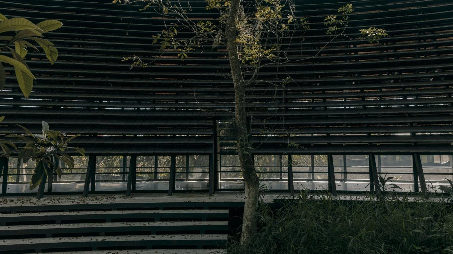 A skin of black terracotta tiles acts as a breathable layer, ensuring cross ventilation and visual permeability for all the pavilions. These are raised over the ground to guard against floods during monsoon seasons. The site’s natural slope is used to device a system for collecting, filtering, and storing rainwater in underground tanks. Finally, the landscape will feature a series of plazas with benches and playground equipment.