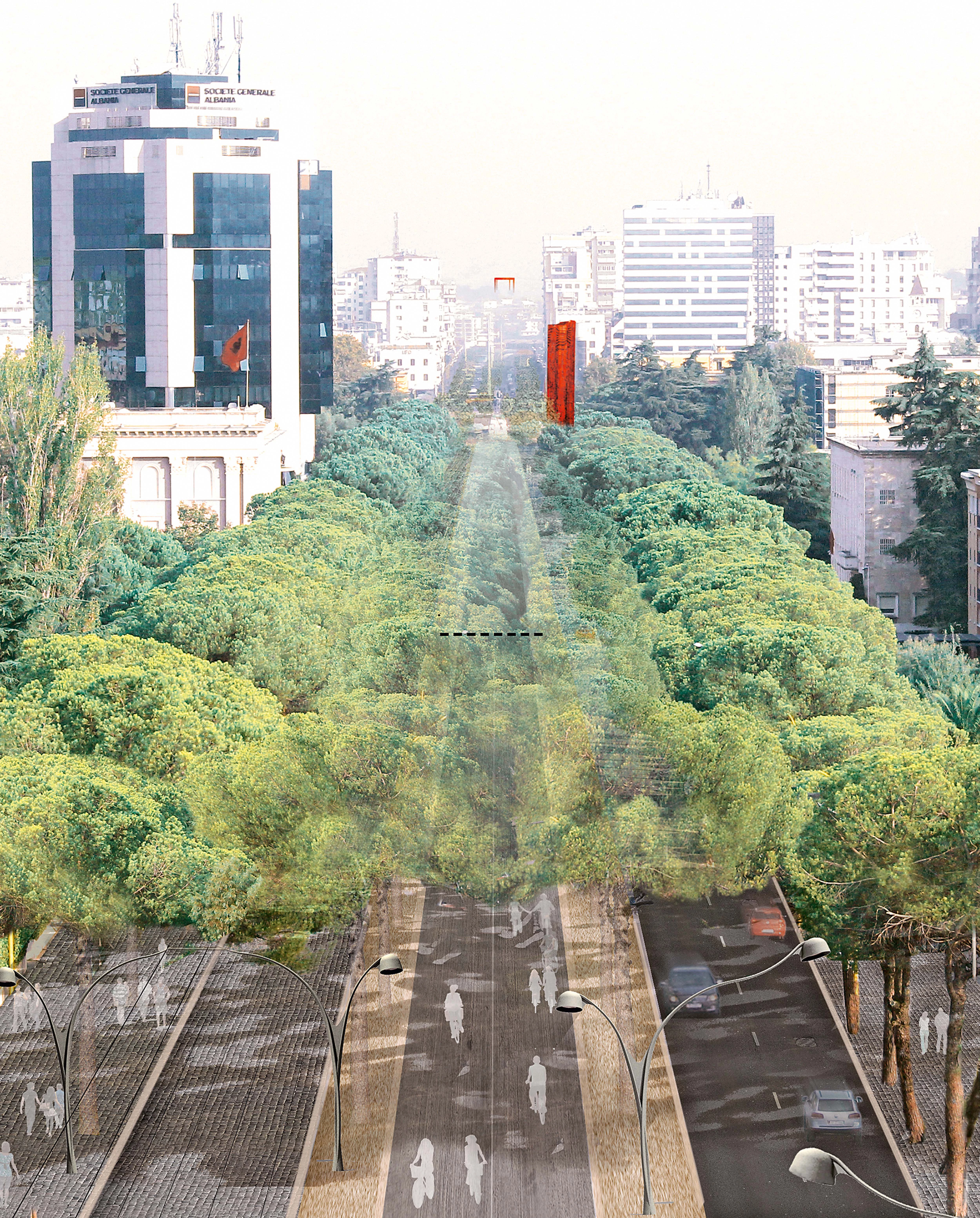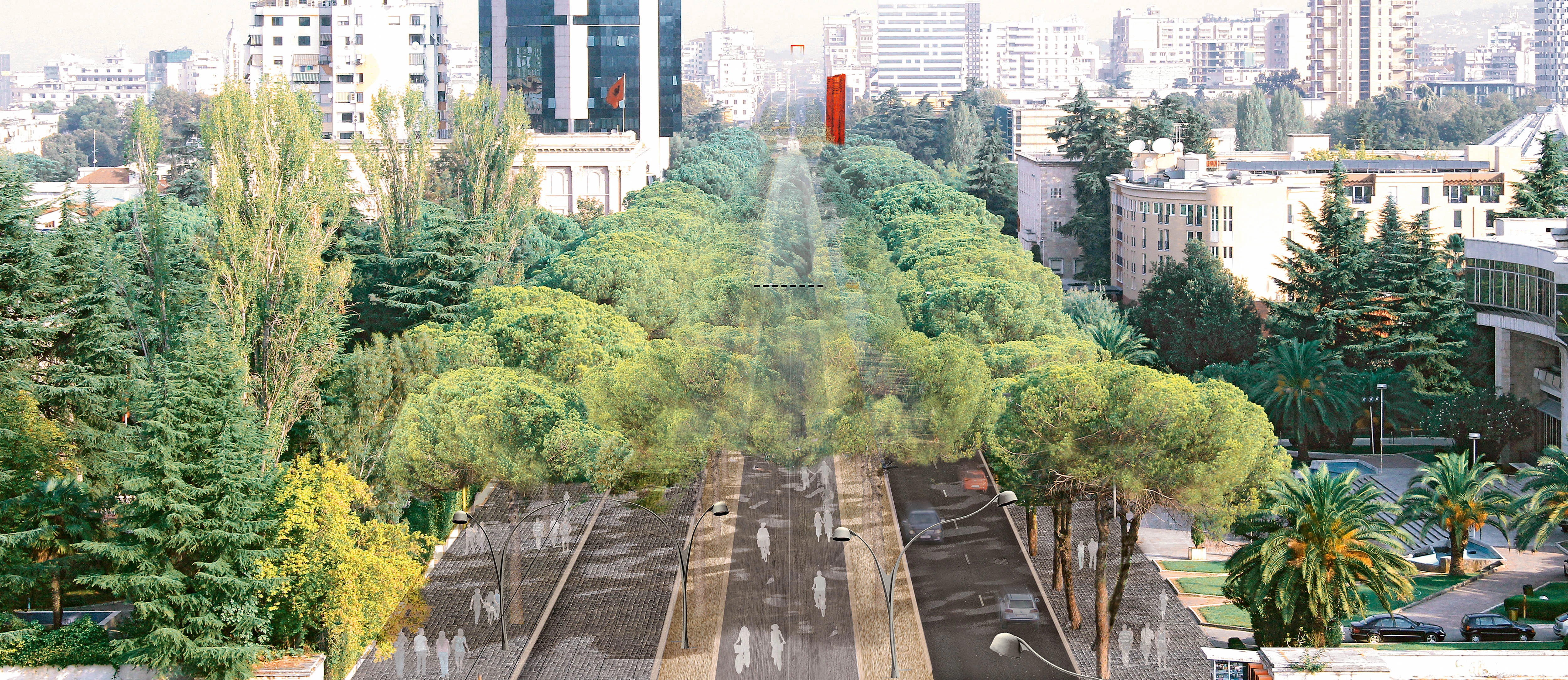 The main avenue is like the backbone of the project and connects the architectural landmarks (of very different types and morphologies), thus proposing a new skyline for north Tirana.