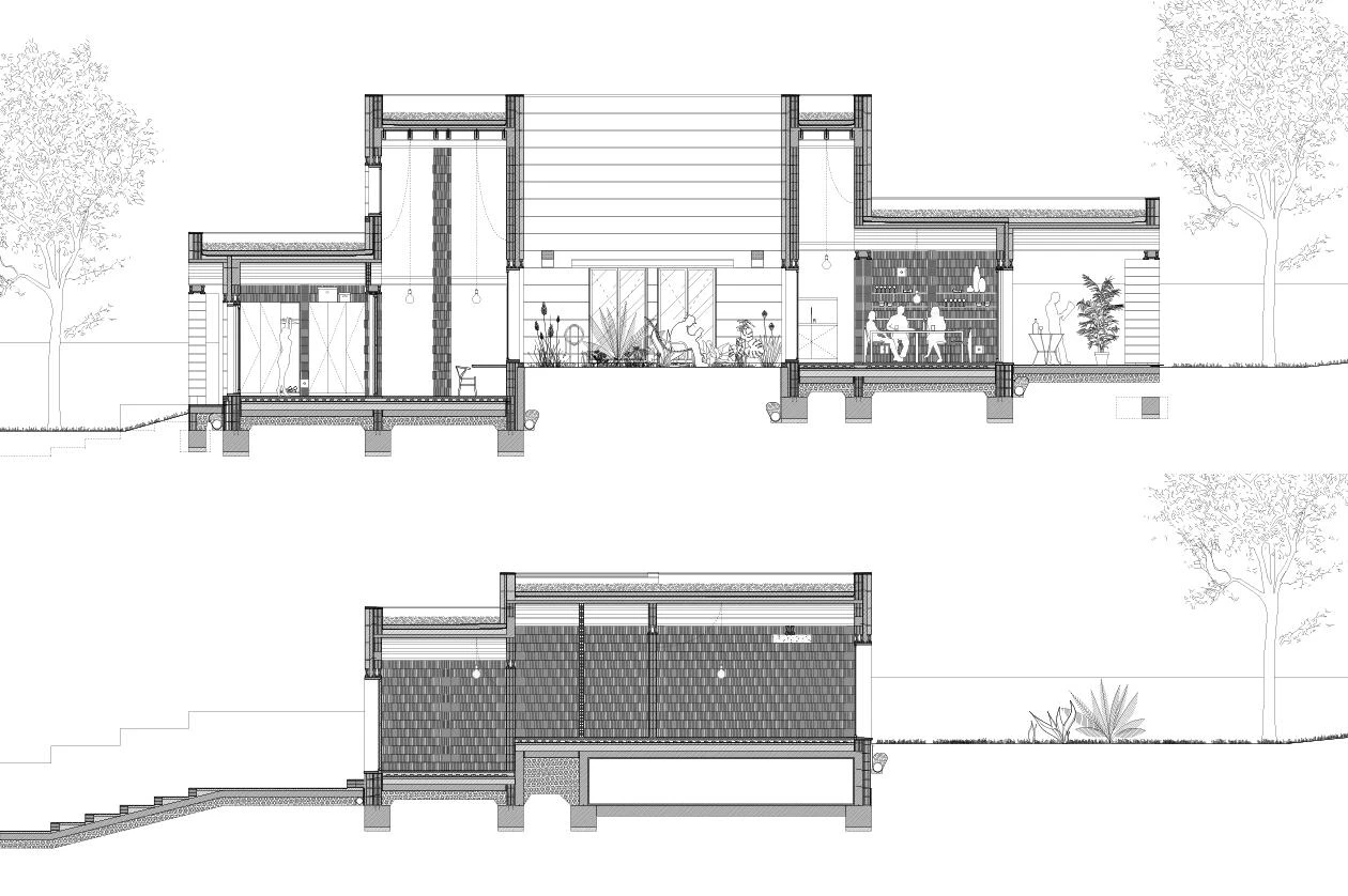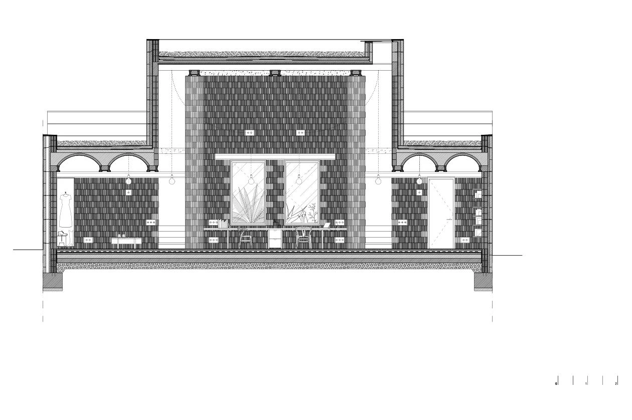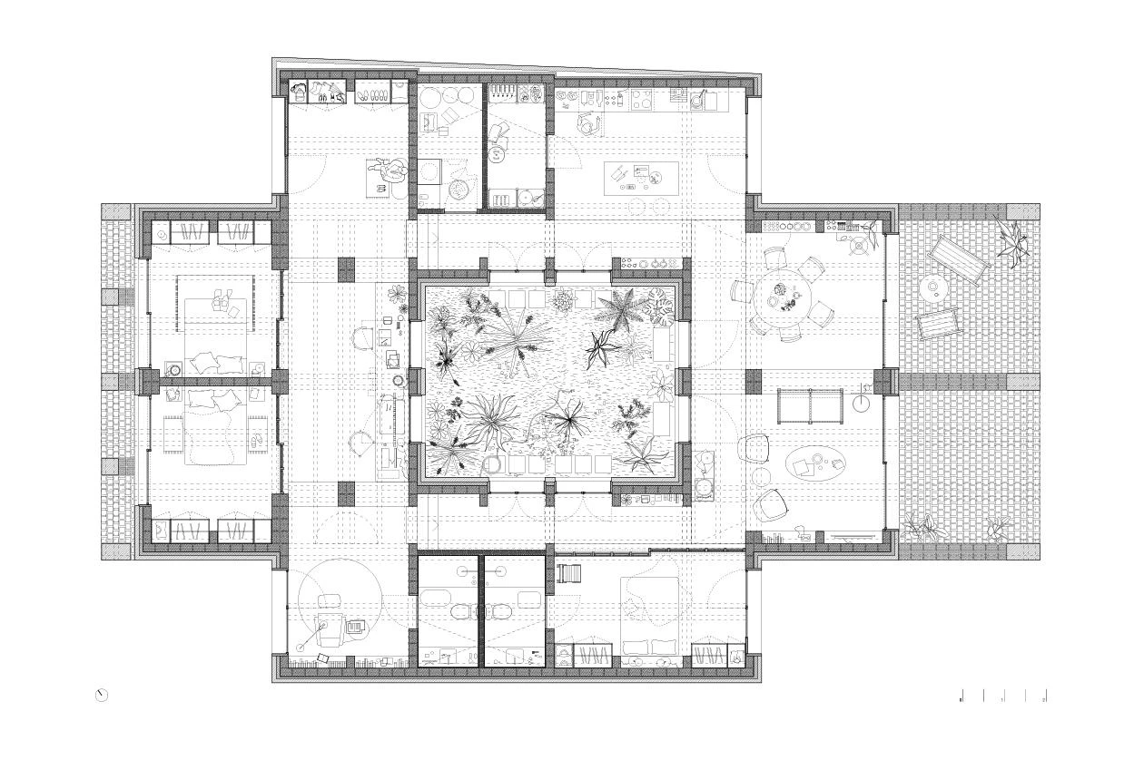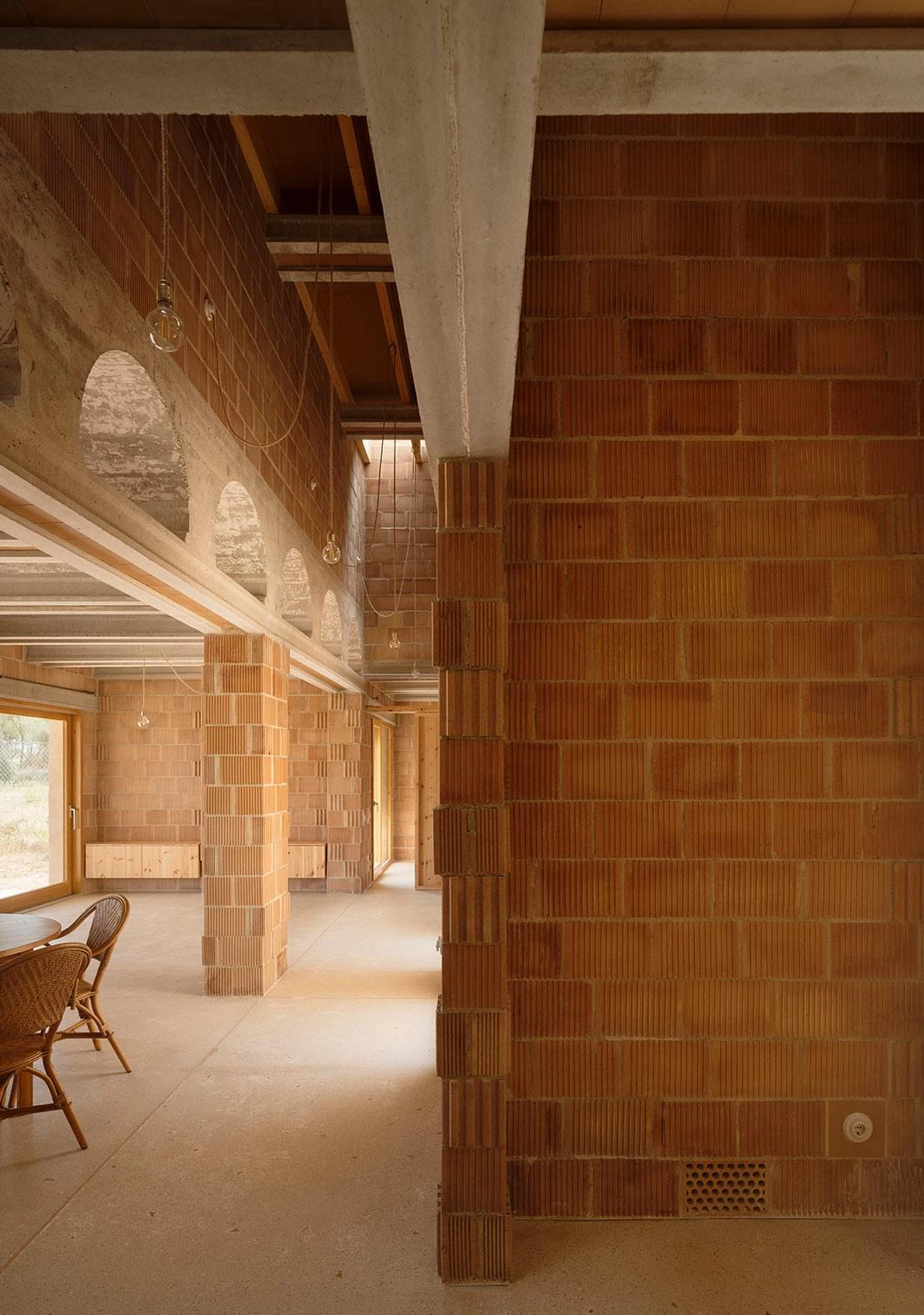 “Majorca is paradise, if you can stand it!” This warning pronounced by Gertrude Stein, directed at Robert Graves when he told her about his plans of leaving cold England, echoes in a house that harnesses traditional wisdom to create an agreeable redoubt in a part of the island prone to gusts of both the north and the south winds. Solid marés walls with an inner layer of ceramic, combined with concrete vaults, provide the necessary thermal inertia and are positioned in accordance with the direction of the elongated plot in order to guide the breeze. This ventilation also benefits the courtyard with which all the rooms connect by means of an ambulatory. With deliberately more ceiling height clearance than the rooms, this cloistral space – which due to a slight drop in the topography relates with the courtyard differently on its various sides – is crowned with small skylights that produce a chimney effect, making for a constantly cool atmosphere.