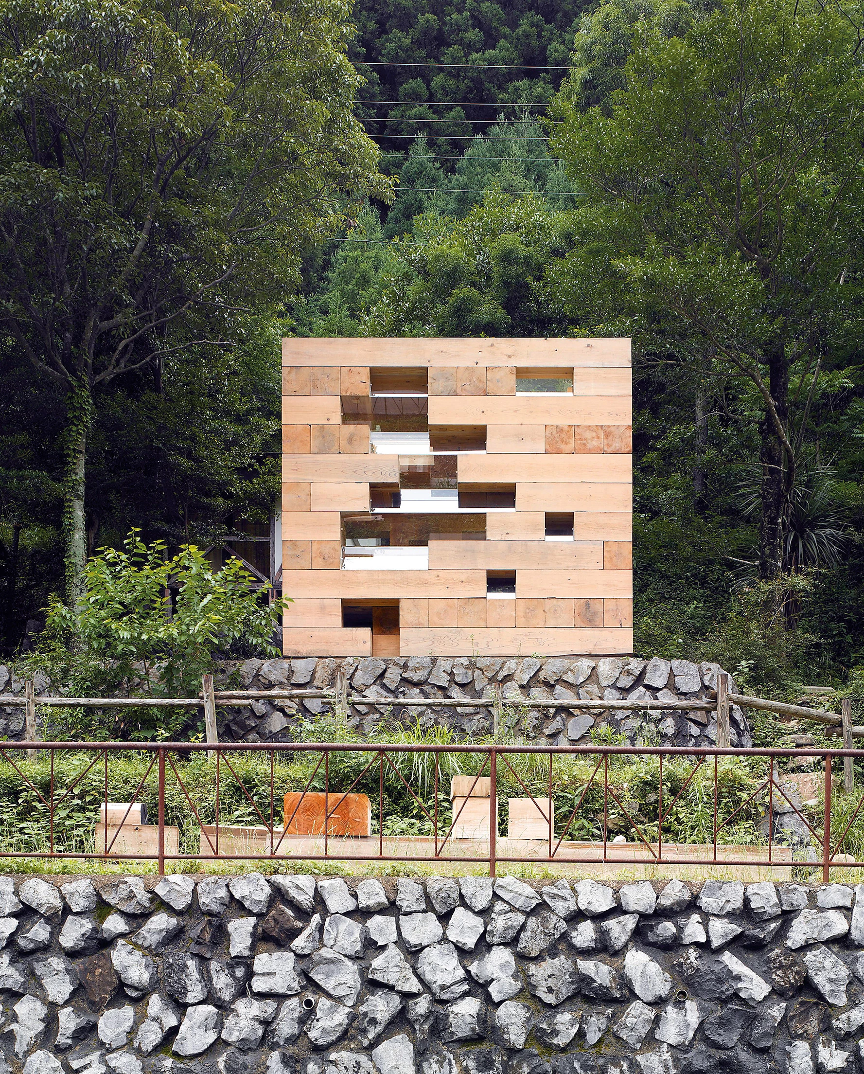 The final wooden house wants to take wood architecture to the limit, and to prove through it that it is possible to do primitive and new architecture simultaneously. One single element – solid cedar blocks – are piled endlessly, generating a prototypical place before architecture became architecture. Aside from creating a strong impact from the point of view of materials, the prisms shape the space through increments of 350 mm, a dimension directly corresponding to the human body. In this way a stepped territory is created, where spatial relationships that would not be possible in a conventional coplanar distribution are explored. There is no distinction between floors, walls, and ceilings. A stretch that was conceived as floor becomes a chair, wall or ceiling depending on the perspective.