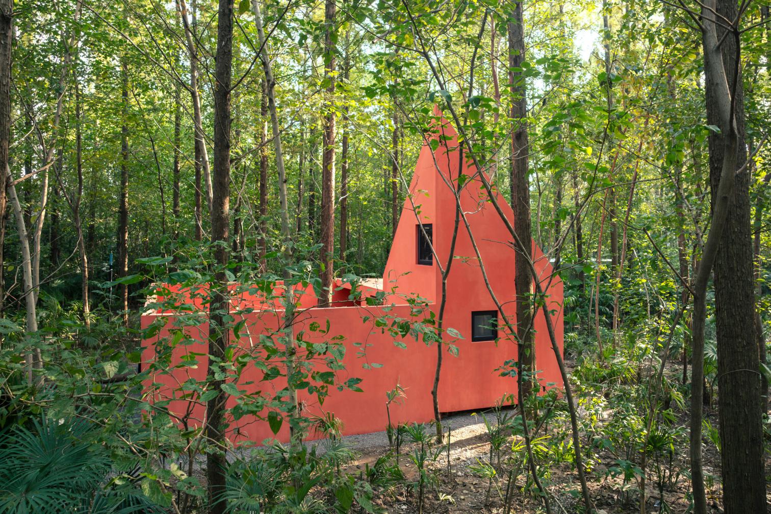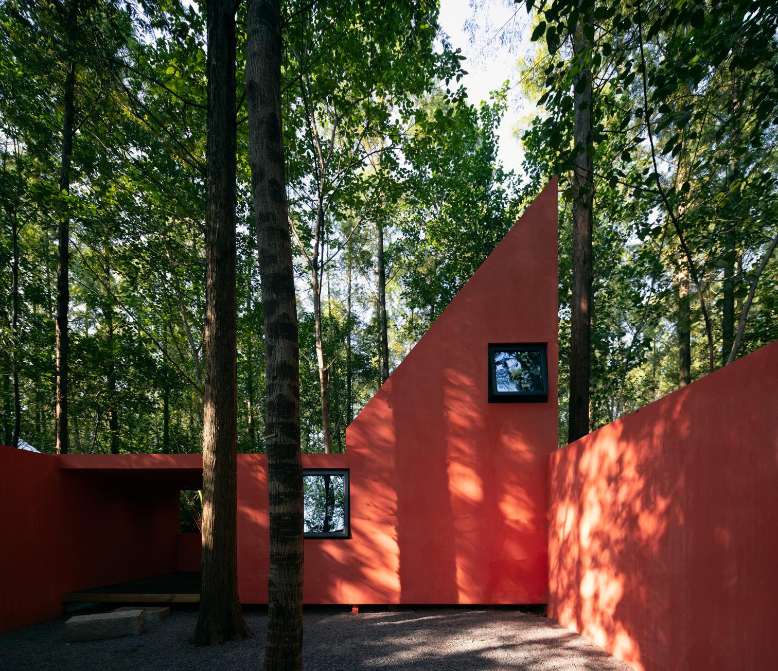 Red cabin, with an area of about 55 square meters, is part of this complex. The shape and color of the house are thought up in reference to a migratory bird: a compact volume, raised off the ground, fully clad in an intense crimson tone.