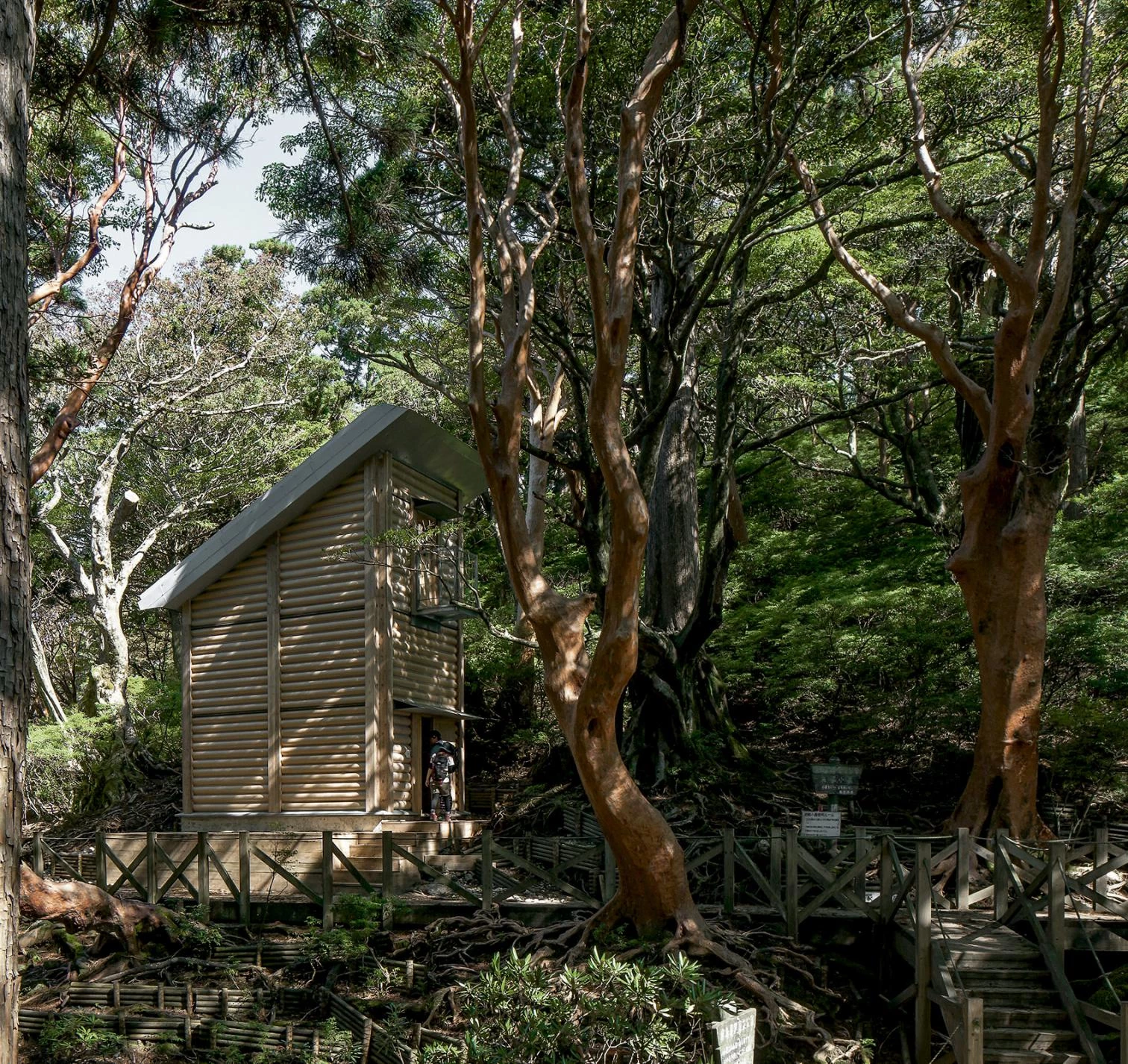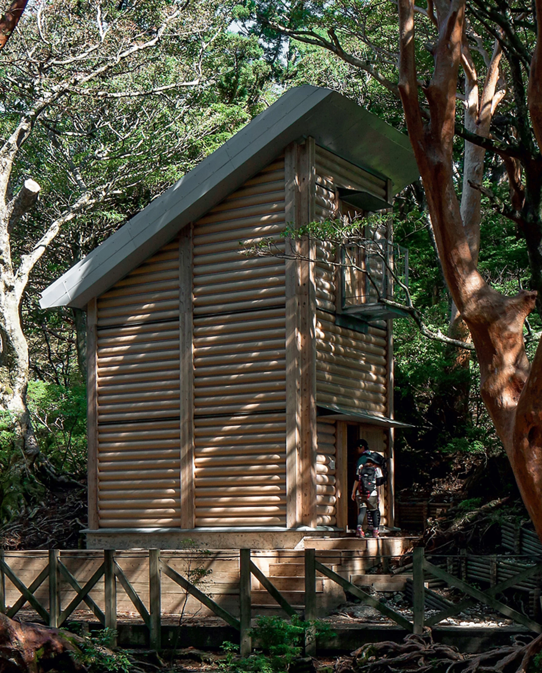 Yaku island, off the southwest coast of Japan, was listed as a heritage site in 1993 because of its value as a biosphere reserve. It is particularly important for its virgin jungle filled mainly with Japanese cedar (sugi), one of the world’s oldest tree species. This small mountain hut for hikers in the National Park of Yakushima Island is built on the foundations of an old shelter that had been destroyed, so the impact on the terrain is minimized. The basic structure consists of wood beams and pillars braced by cross-shaped metallic stretchers. The space between supports is closed by slightly separated paper tubes, which let light and air pass through. This system makes it easy to replace the tubes in case the extreme climate deteriorates them. The roof, constructed with corrugated sheet, is deeply sloped with large flanges to protect the hut from rainwater.