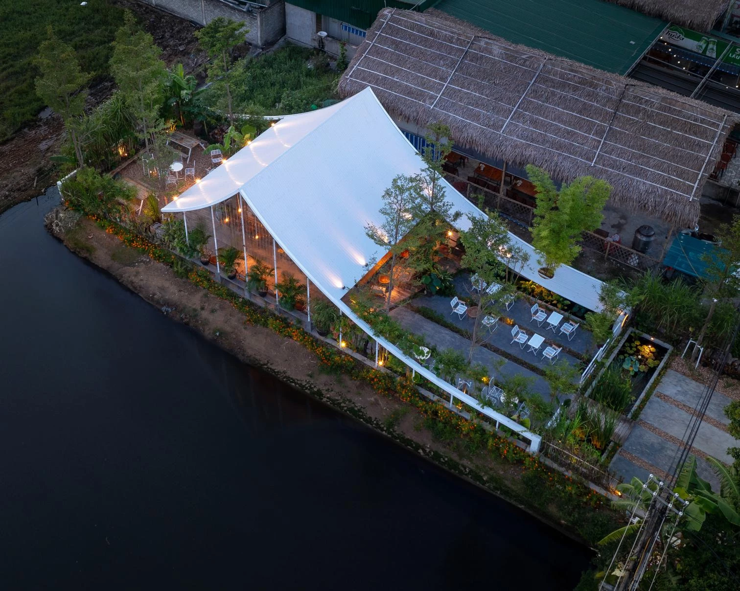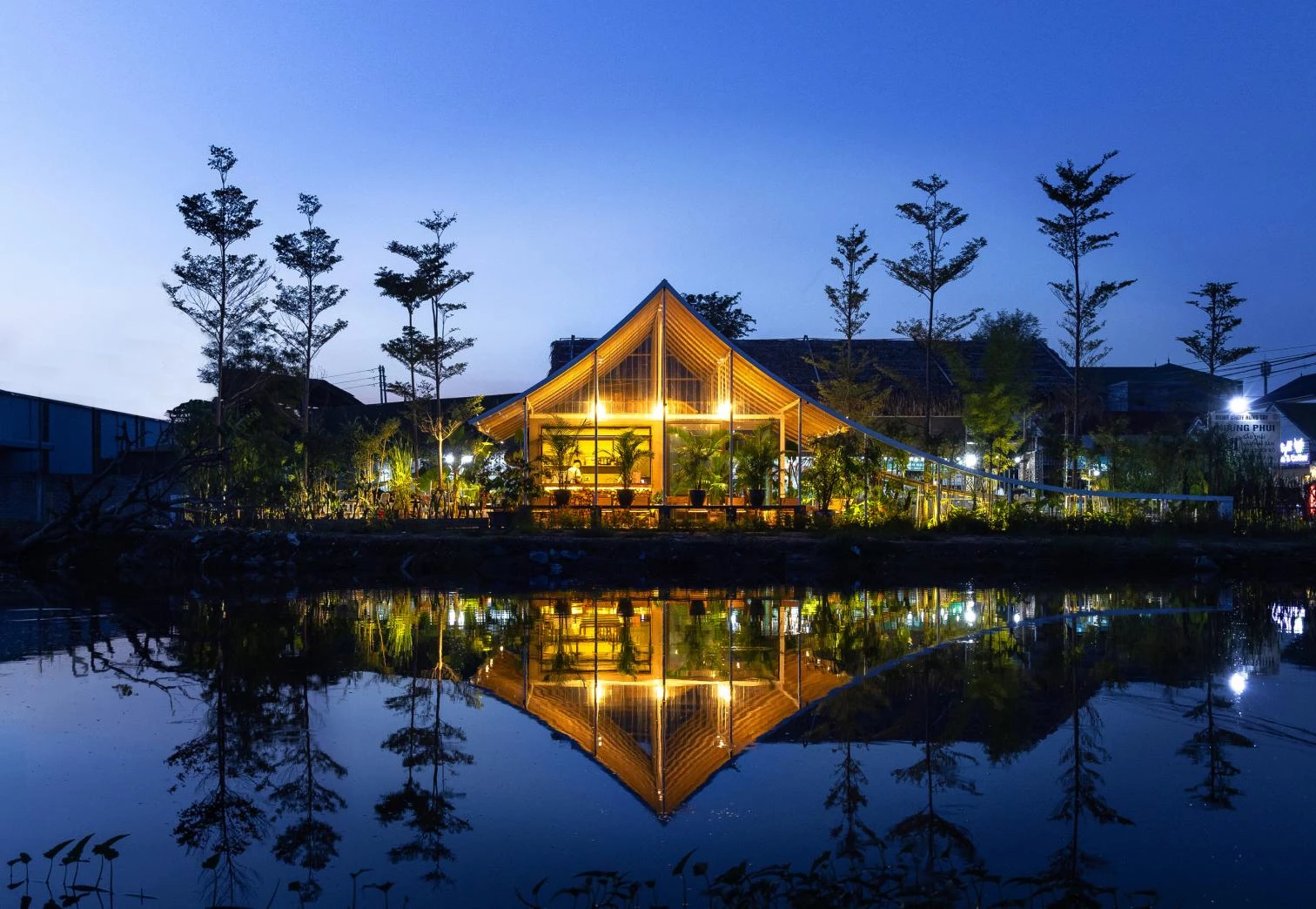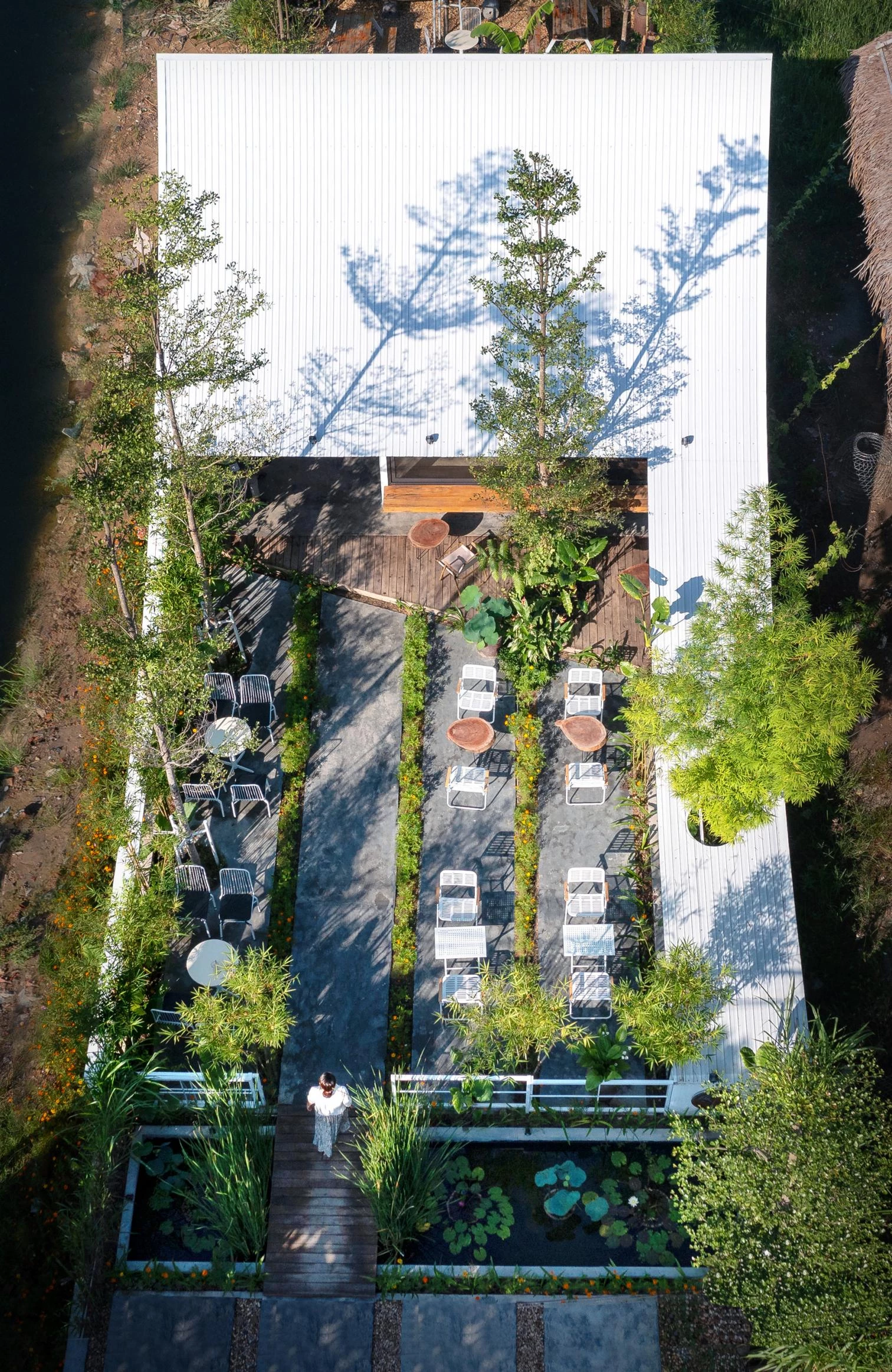 On the outskirts of Vinh city in Vietnam, next to the Vsip industrial park, stands this 160-square-meter café. The project was conditioned by a low budget and also by a 5-year land lease term, so the main materials were selected in accordance with their reusability after that period.