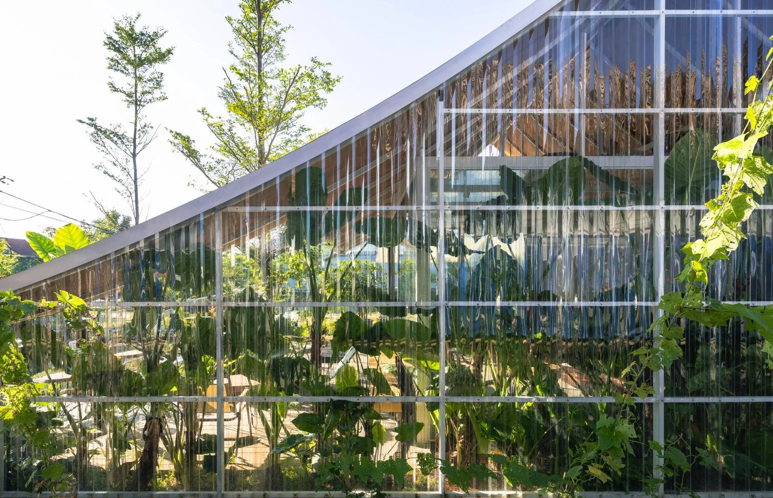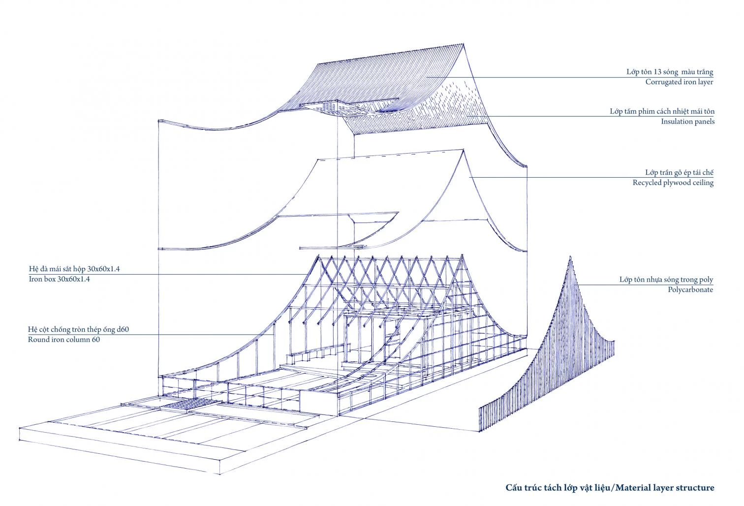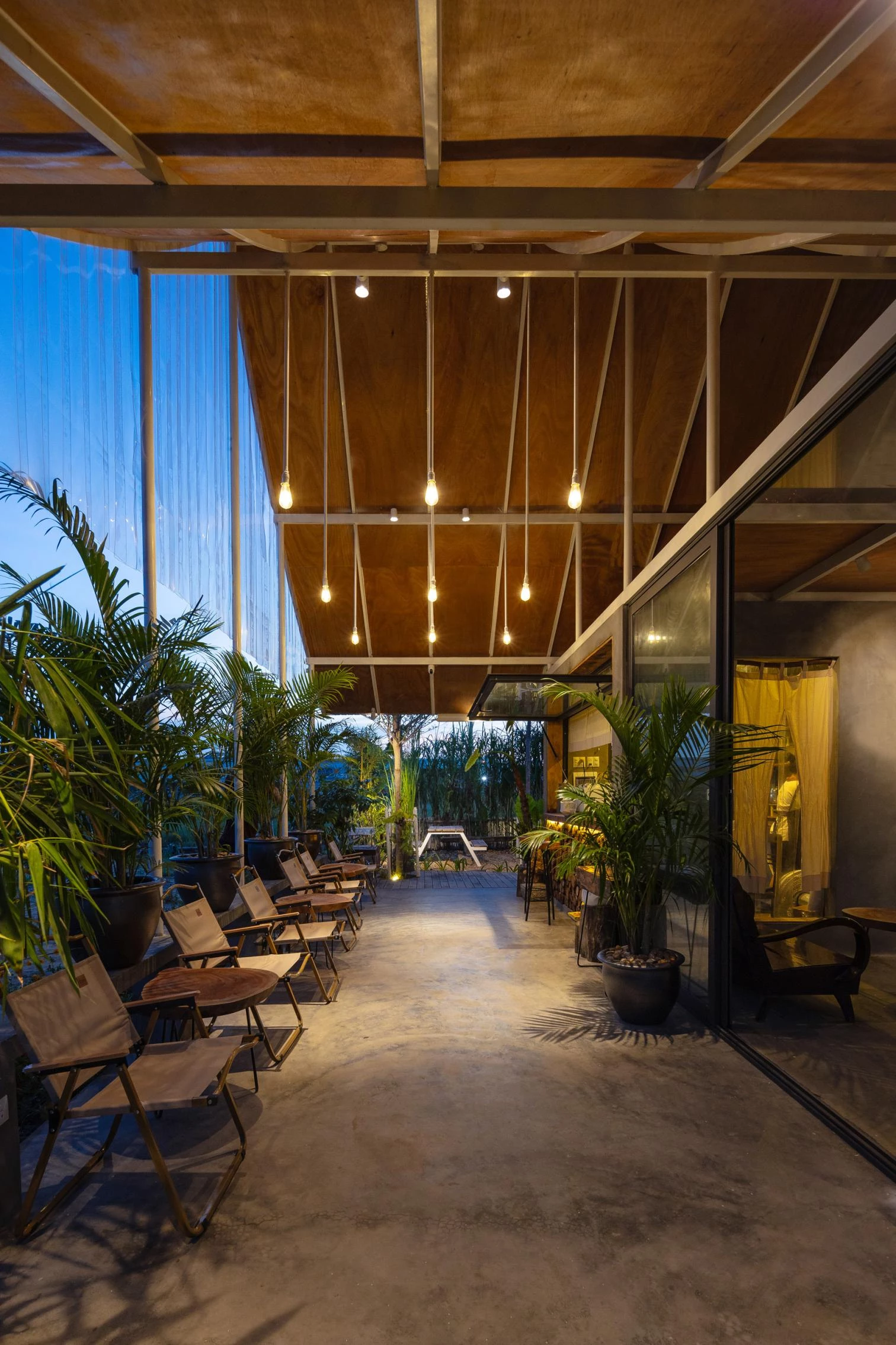 On the outskirts of Vinh city in Vietnam, next to the Vsip industrial park, stands this 160-square-meter café. The project was conditioned by a low budget and also by a 5-year land lease term, so the main materials were selected in accordance with their reusability after that period.