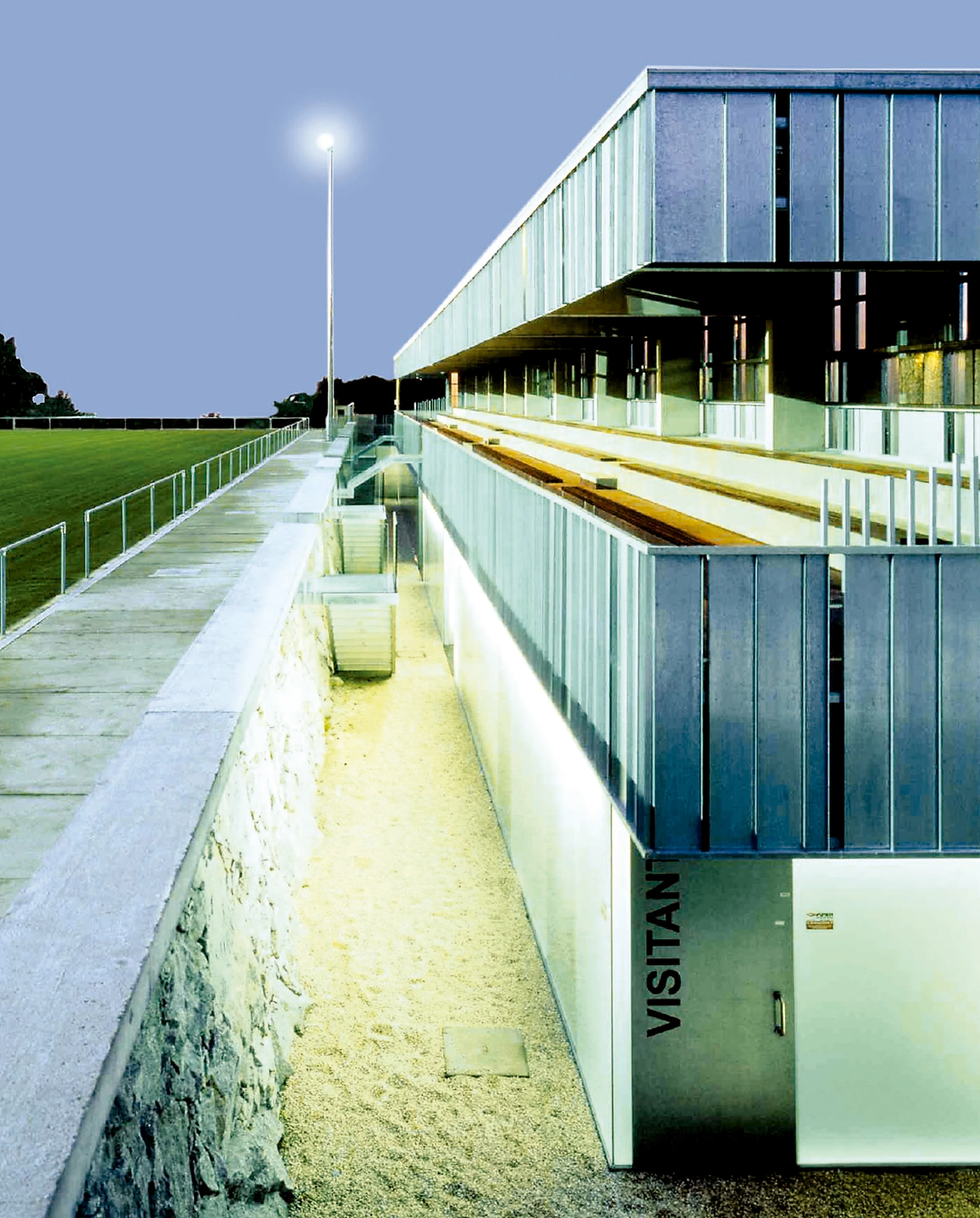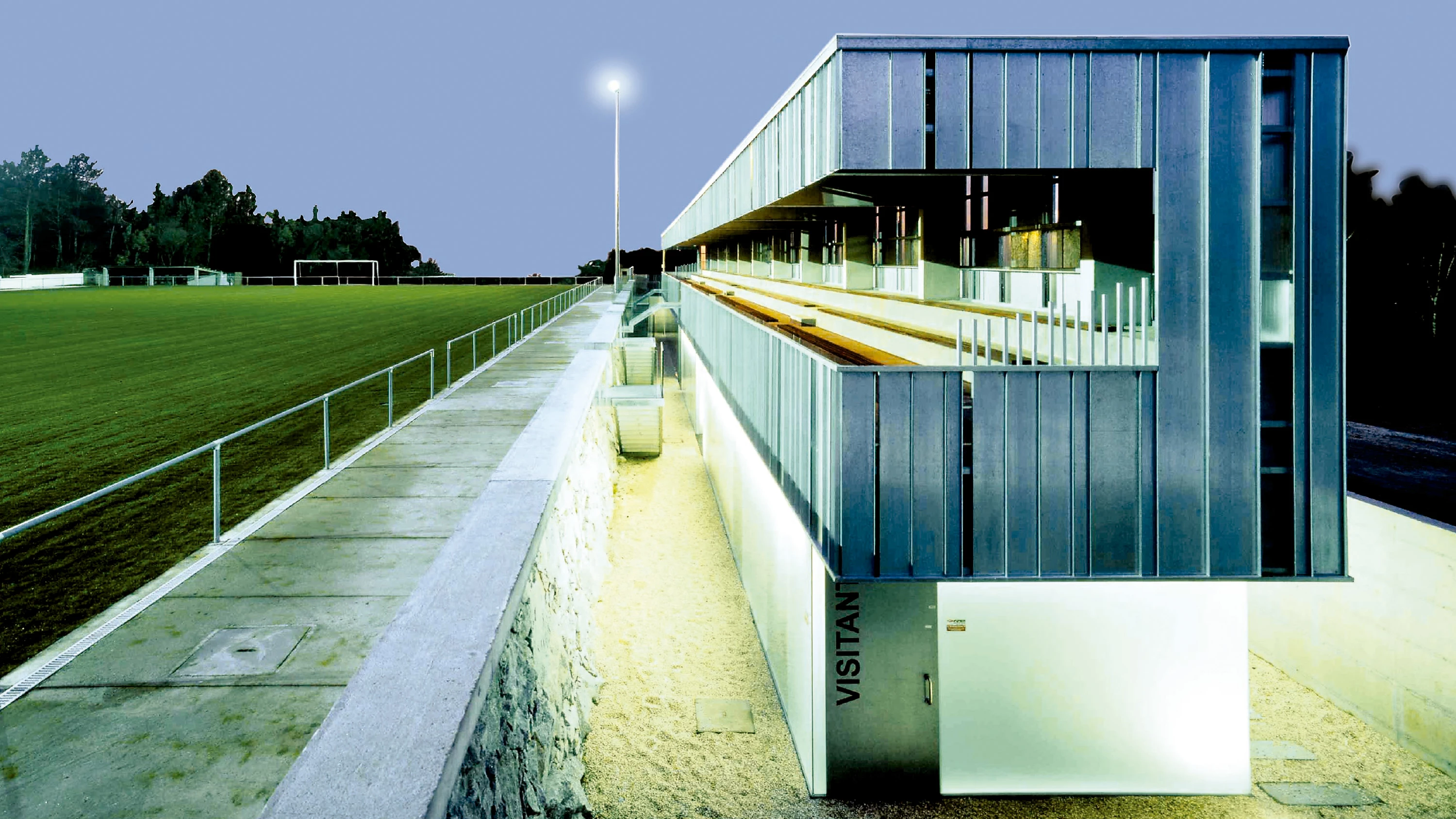 El proyecto es el resultado de adaptar a un terreno de juego real uno de los prototipos ganadores del concurso de ideas convocado hace unos años por la Diputación de La Coruña para dotar de infraestructuras deportivas a muchos de los pequeños concellos de la provincia (véase Arquitectura Viva 92). El campo de fútbol de Coirós, municipio de la periferia de Betanzos, debía equiparse con un presupuesto muy ajustado. Así, para no encarecer la obra, hubo de aprovecharse la cimentación que soporta el terreno, que queda vista como foso de separación entre el césped y el cuerpo edificado que alberga los vestuarios —en el nivel inferior, de acceso restringido a jugadores y árbitros— y el graderío para el público, un palco a cubierto, en la parte alta. En este espacio de transición pavimentado con grava se sitúan las escaleras por las que los equipos entran al campo de juego. El acceso público se resuelve con un pequeño volumen que se integra en el cierre perimetral y donde se encuentra la taquilla, los aseos del público y un pequeño ambigú. Para la construcción del edificio se ha optado por el uso de tres materiales: hormigón, vidrio y acero galvanizado. De hormigón son los muros exteriores de cierre, las costillas de la estructura y los escalones de la grada. El revestimiento del palco es de vidrio y paneles de acero galvanizado colocados en vertical con un ritmo cambiante. La resistencia del acero y el hormigón contrasta con la fragilidad del vidrio. La perfección de los acabados en acero y vidrio destaca frente a la tosquedad del hormigón lavado, en contacto con el suelo y reivindicando su carácter plástico en las formas orgánicas de los huecos de paso. Es una construcción a base de tableros, paneles y perfiles. Los acabados interiores completan la paleta de materiales con losetas de pizarra en los suelos y tableros de madera en los techos. Y todo ello cumpliendo la premisa, común a todas estas intervenciones en instalaciones deportivas de pequeños municipios, de conseguir construir al mínimo coste posible en un breve plazo... [+]
