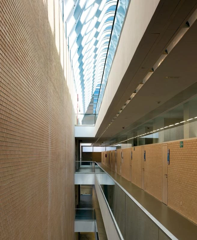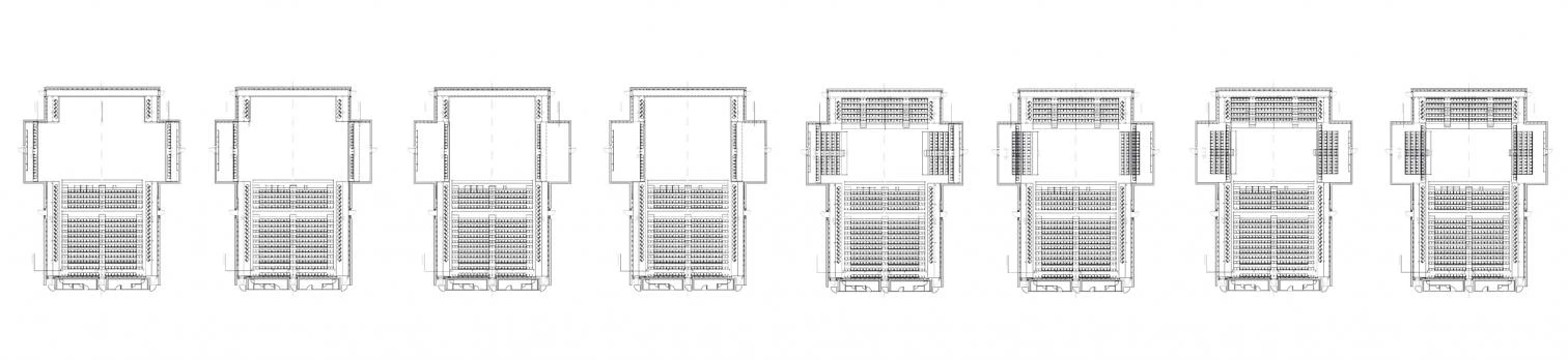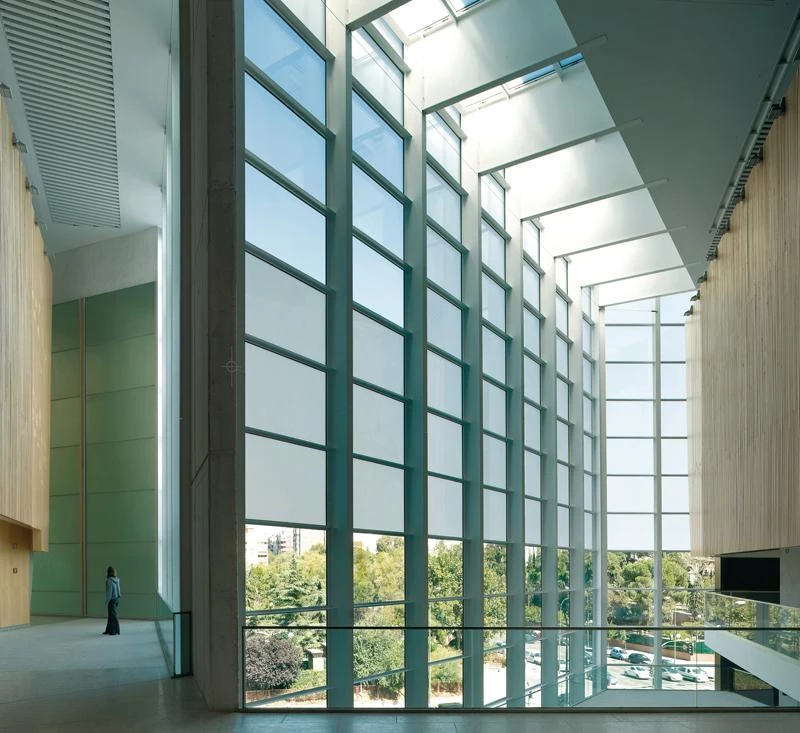 A system of screens and post-stressed concrete slabs supports a colossal framework of structural steel. The double skin of opaque printed glass that wraps the volumes of the theater halls rests on this structure.