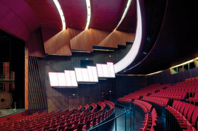 The building houses a choreographic center, the main theater – for about 850 spectators – and a flexible hall that permits altering the conventional arrangement of seating, which can be made to wrap around the stage.
