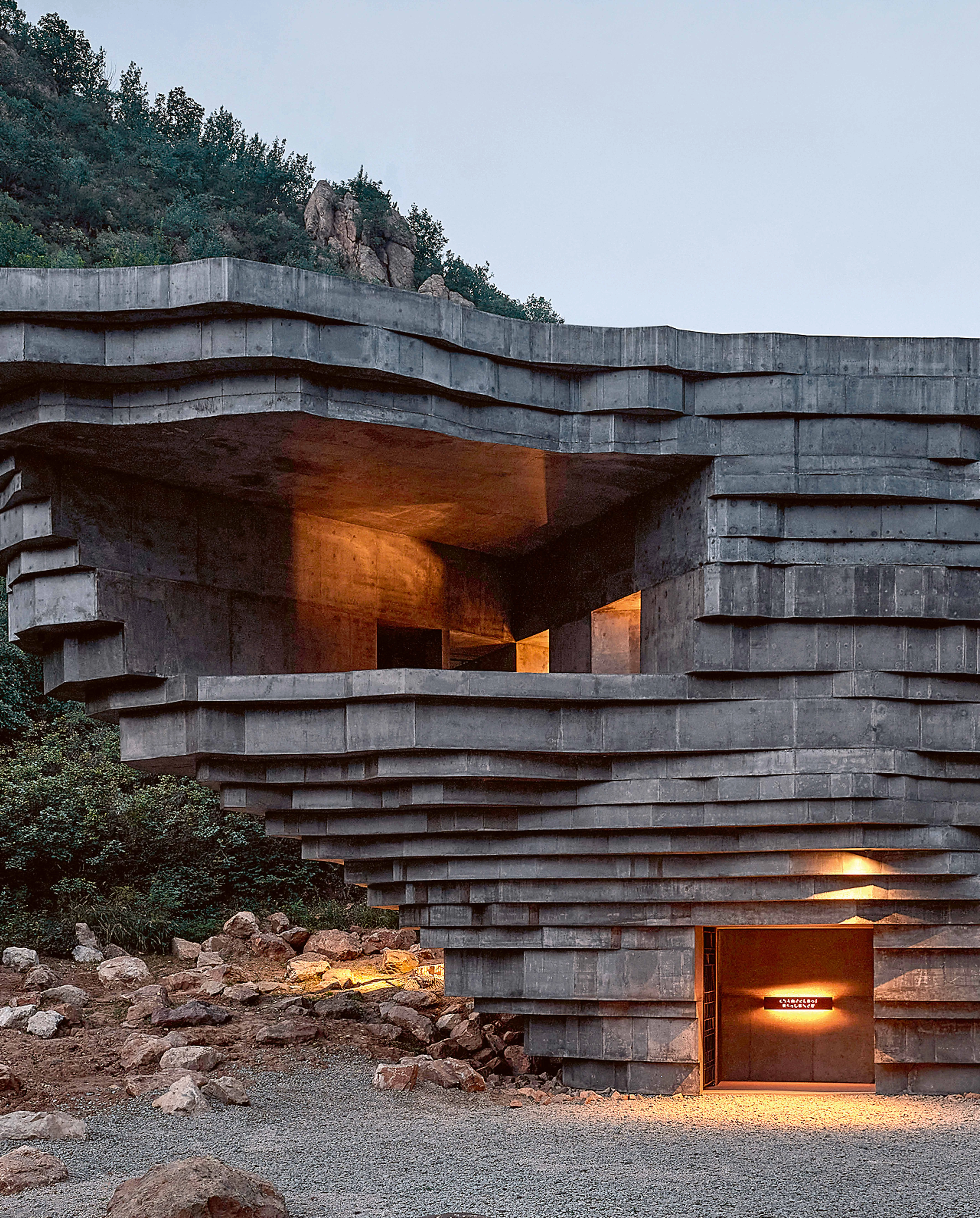 Two hours by car from the center of Beijing, this open-air concert hall is a work of the firm OPEN, led by Li Hu and Huang Wenjing. Set amid mountains, the concrete building is an inverted cone, textured like a rock where each striation cantilevers out from the layer below it. In this way it engages in dialogue with the natural landscape, minimizing its visual footprint on it. The complex includes a green room, a semi-open amphitheater, an outdoor stage, and viewing platforms. In the wake of acoustic analyses, materials were introduced and openings were made to absorb and regulate sounds. When there are no shows, the performance venue is a peaceful place conducive to contemplation and the enjoyment of splendid panoramas of the valley and the Great Wall of China.