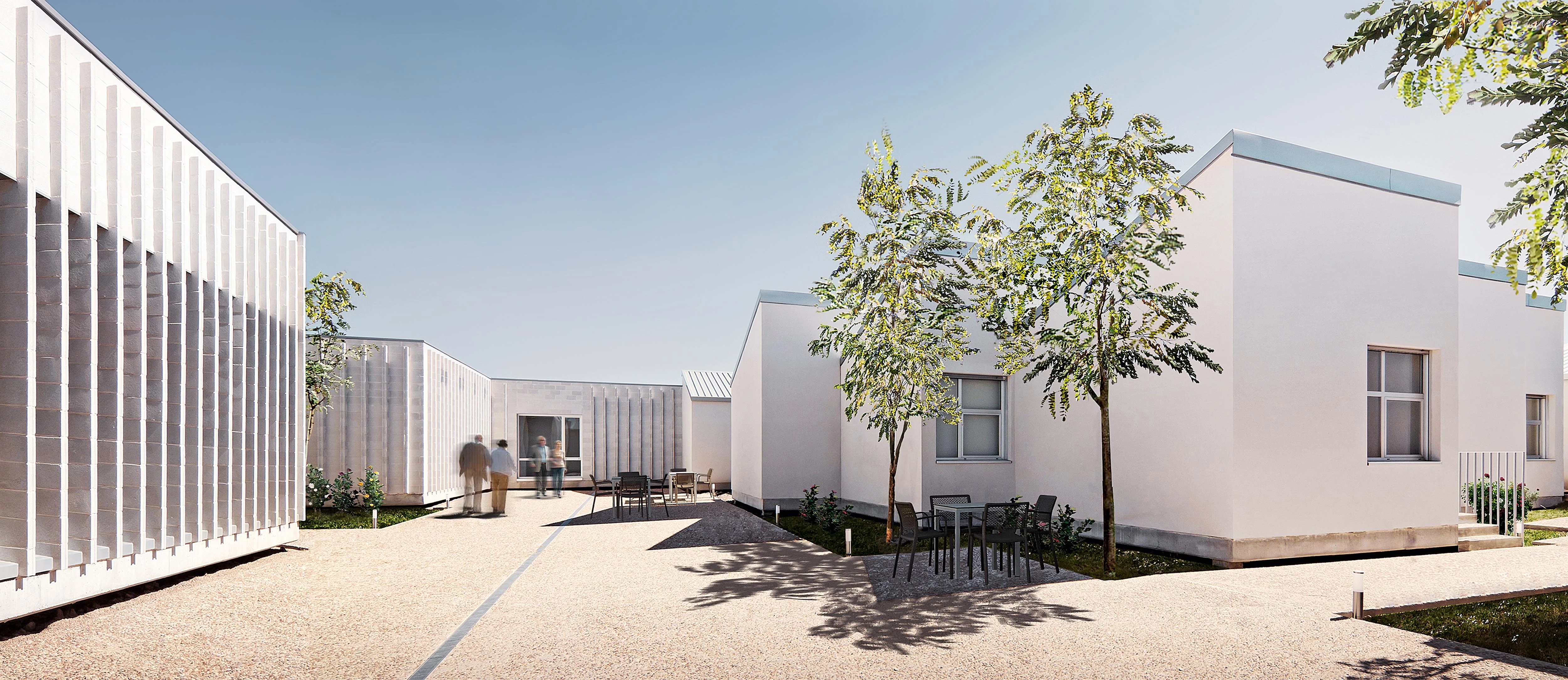 In the middle of the harsh and dry landscape of the Castilian plateau, the building is enclosed by a severe wall of concrete blocks, behind which one can catch a glimpse of a spacious garden that metaphorically suggests an oasis. This reference is reinforced by the dialogue between the surly exterior wall and the warmth of the interior spaces, the design of which wishes to replace the conventional ‘home for the elderly’ with a type that takes inspiration from villages or small rural towns.