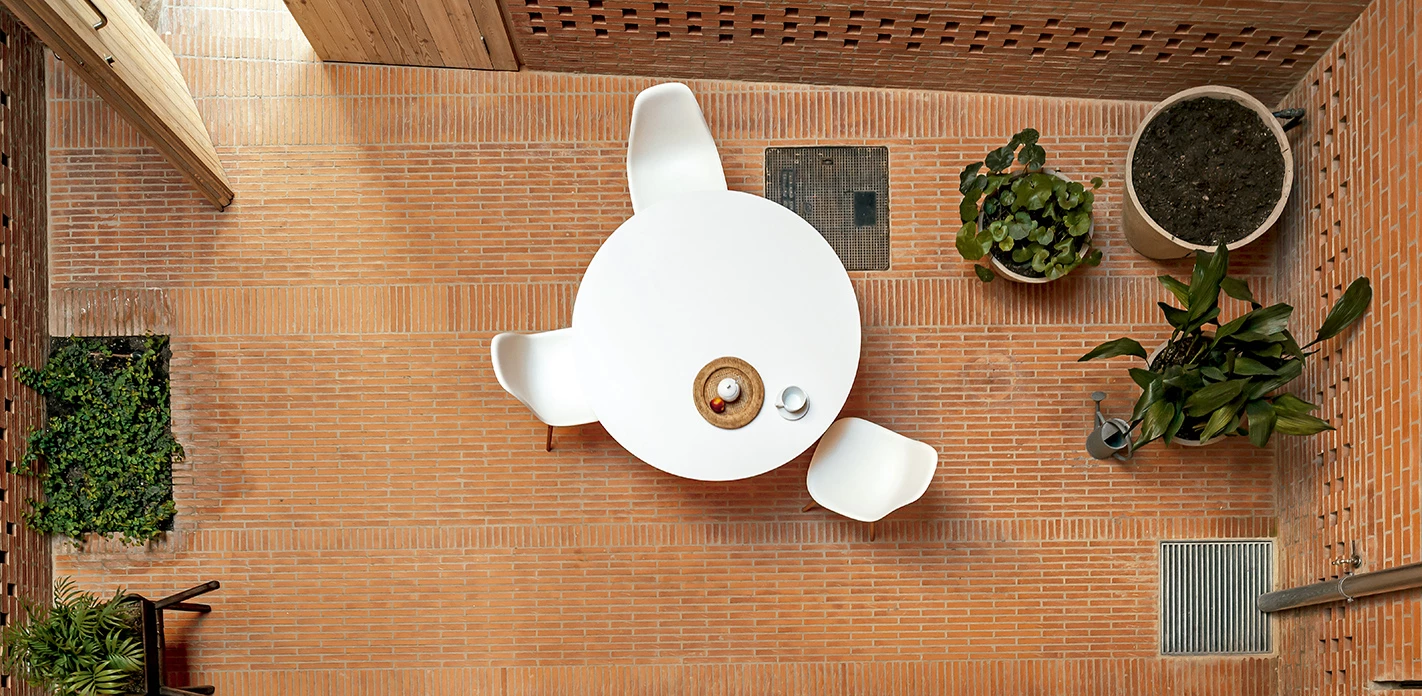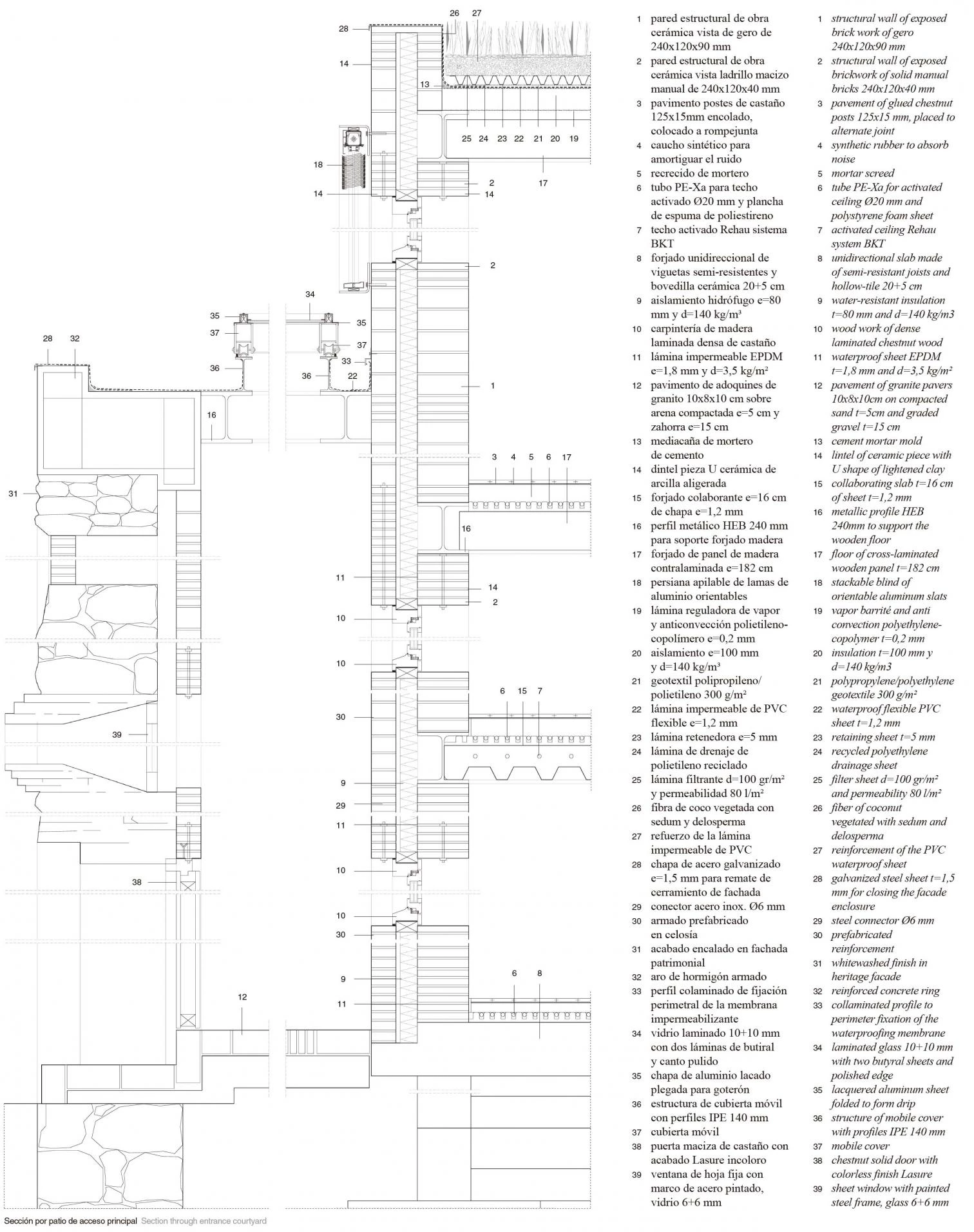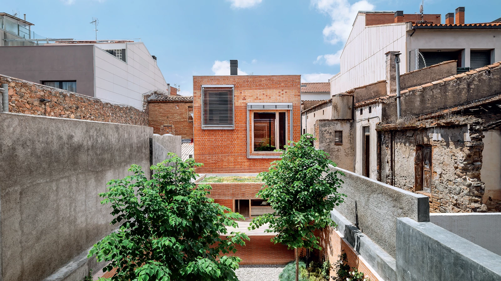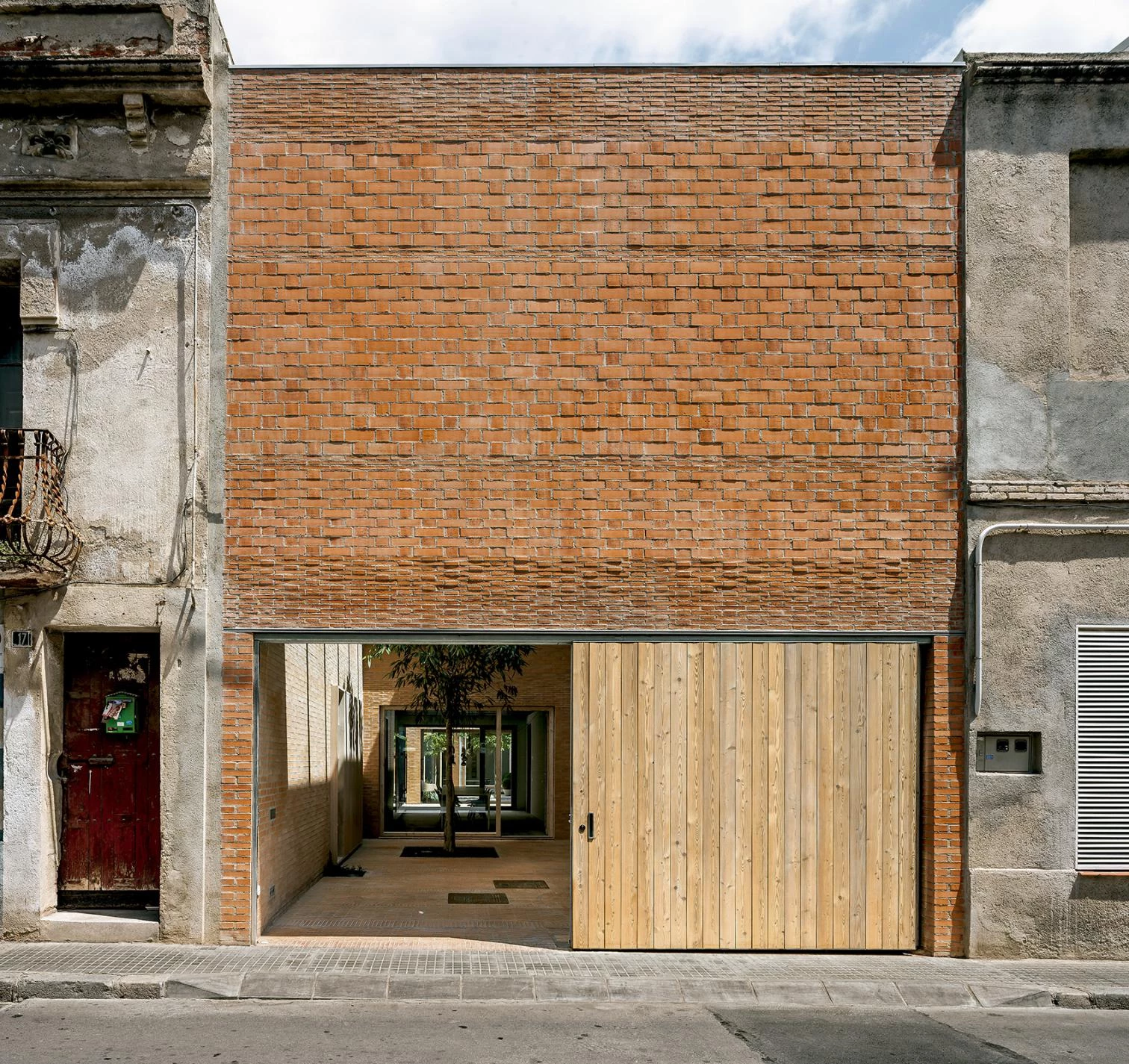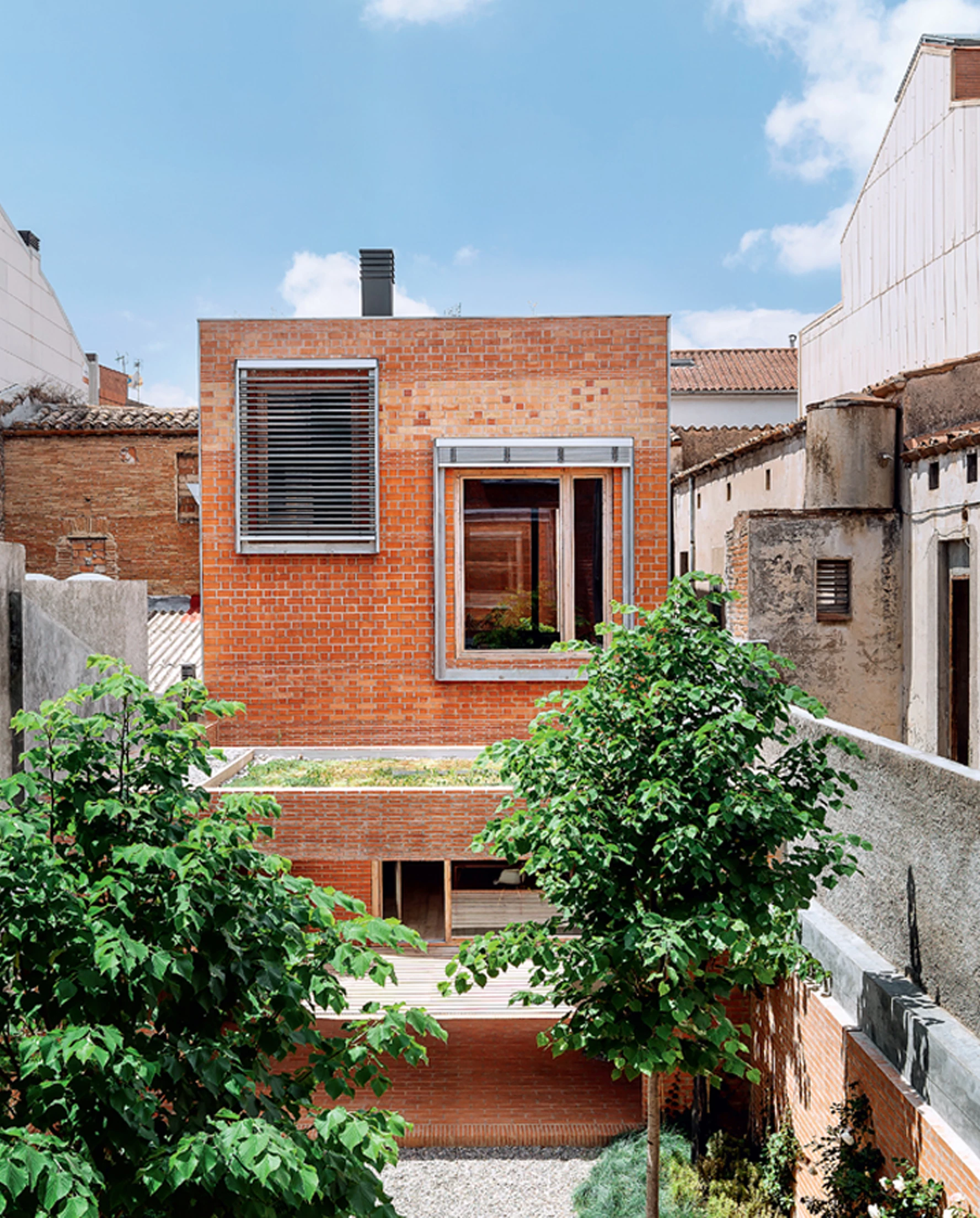Flanked by party walls on a lot that stretches deep inward from the front border, this house is composed of a succession of volumes that have been deliberately set back to obtain the best possible light and views, and are arranged amid small courtyards chained to one another in a sequence. The resulting exterior-interior continuity generated by this manner of occupying the plot is nuanced by vegetation in the patios on the one hand, and by ceramic materials in the facade on the other hand. The latter are deliberately given a rough, rather crude finish. The brick does not only work as an aesthetic statement. Bonded in loadbearing walls that serve to delimit the interior spaces, they contribute their thermal inertia and mechanical properties. These walls are formed by post-compressed beams of reinforced ceramic. The solid bricks are reinforced through bands which express, with their rows of varying height, the structural behavior of the walls.
