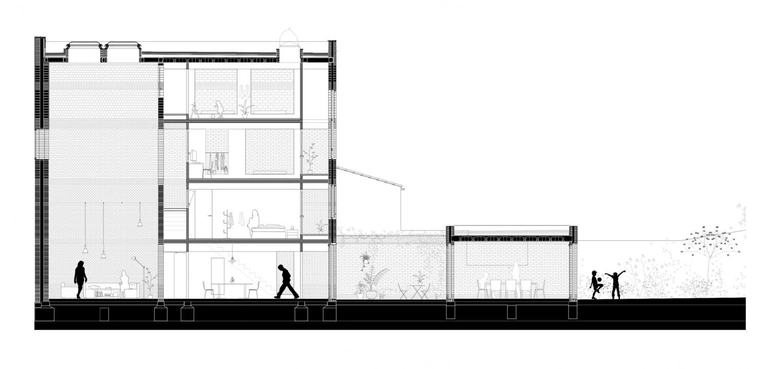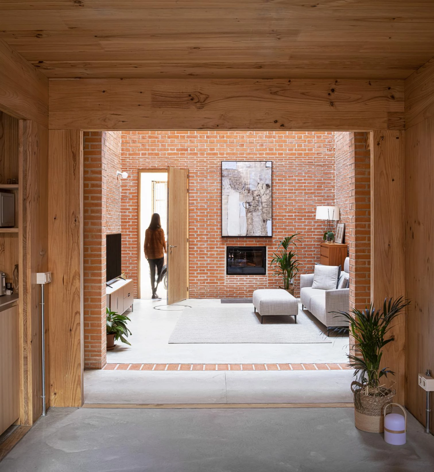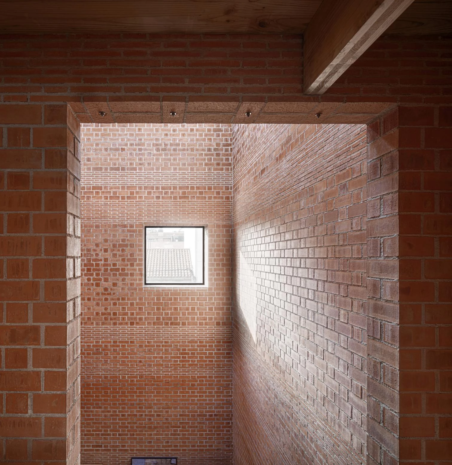 Combining brick and wood, the house harnesses all the available height to optimize solar gain, thereby taking on the maximum volume allowed, but without taking up the entire built area admitted. The result is a section divided into two parts: a unique vertical space with overhead sunlight but no shadows cast by neighbors; and a tower which at ground level, next to the living room, accommodates the dining room and the kitchen, with three stories containing a single bedroom each.