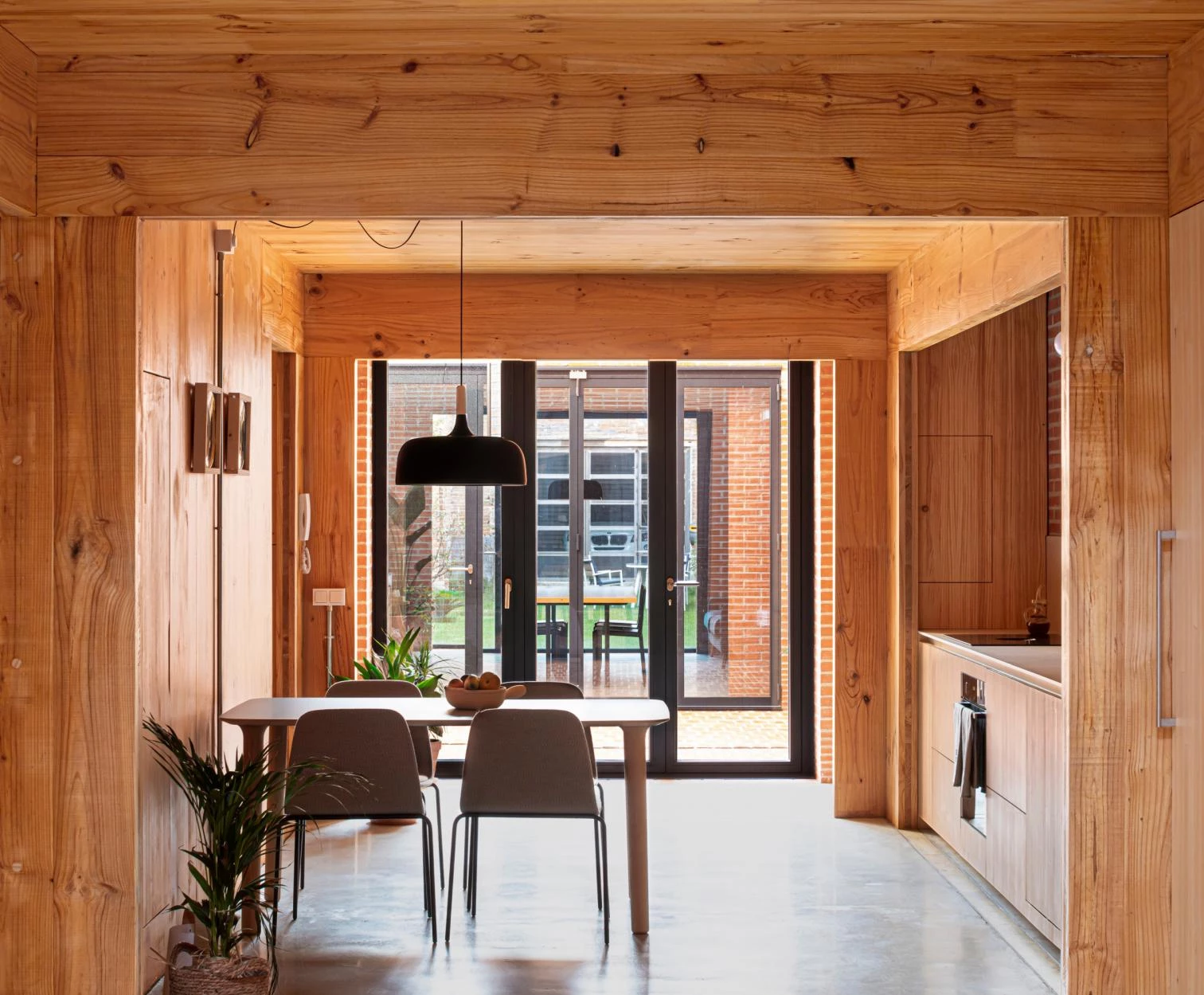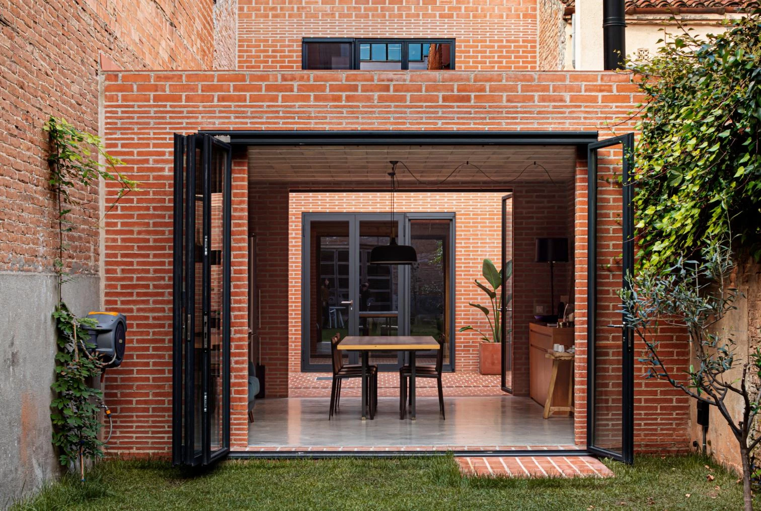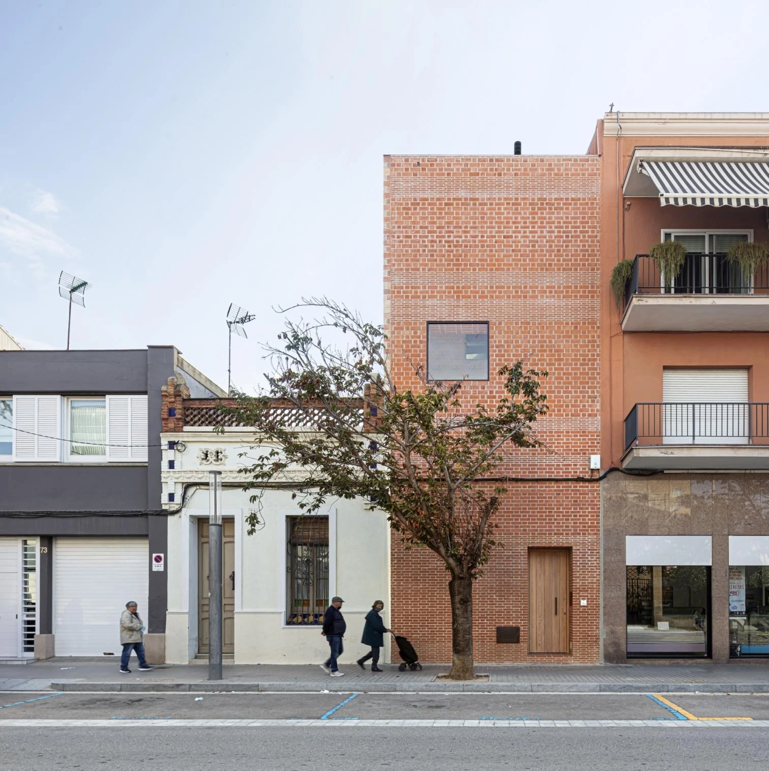 Combining brick and wood, the house harnesses all the available height to optimize solar gain, thereby taking on the maximum volume allowed, but without taking up the entire built area admitted. The result is a section divided into two parts: a unique vertical space with overhead sunlight but no shadows cast by neighbors; and a tower which at ground level, next to the living room, accommodates the dining room and the kitchen, with three stories containing a single bedroom each.