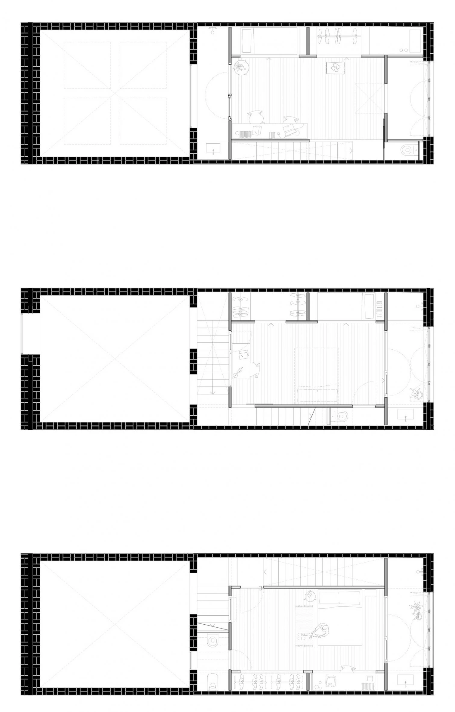 To facilitate natural lighting and cross ventilaion, the staircase loses its traditional structural bay separating the street-facing rooms from the inner ones, and dilutes around the column of bedrooms, modifying positions floor by floor. In this way, anyone going up to floor +1 does not realize that there is a floor +2, and so on. The band occupied by the stairs is completed with the rest of the program; bathrooms, clothes storage…