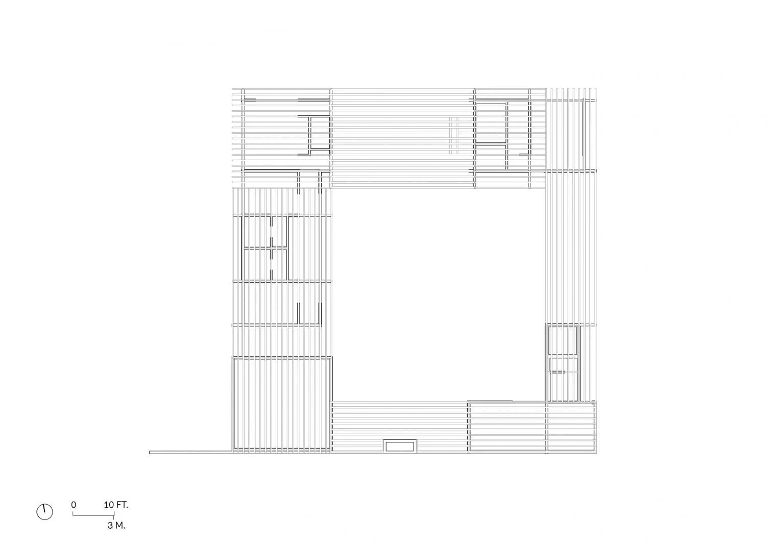 The house sits on a concrete platform which, adapting to the gentle slope, is stepped, creating spaces with more headroom in the lowest part – since the roof keeps a constant level. Two L-shaped schemes are organized at opposite corners of the courtyard: the domestic area, joined by a heated garage that is able to double as a ‘student central,’ and a small workplace with a sauna. Between both, the flat roof – executed with laminated timber beams set parallel to the eaves – protects two terraces, one sheltered by an exterior fireplace and the other with sweeping views of the scenery.
