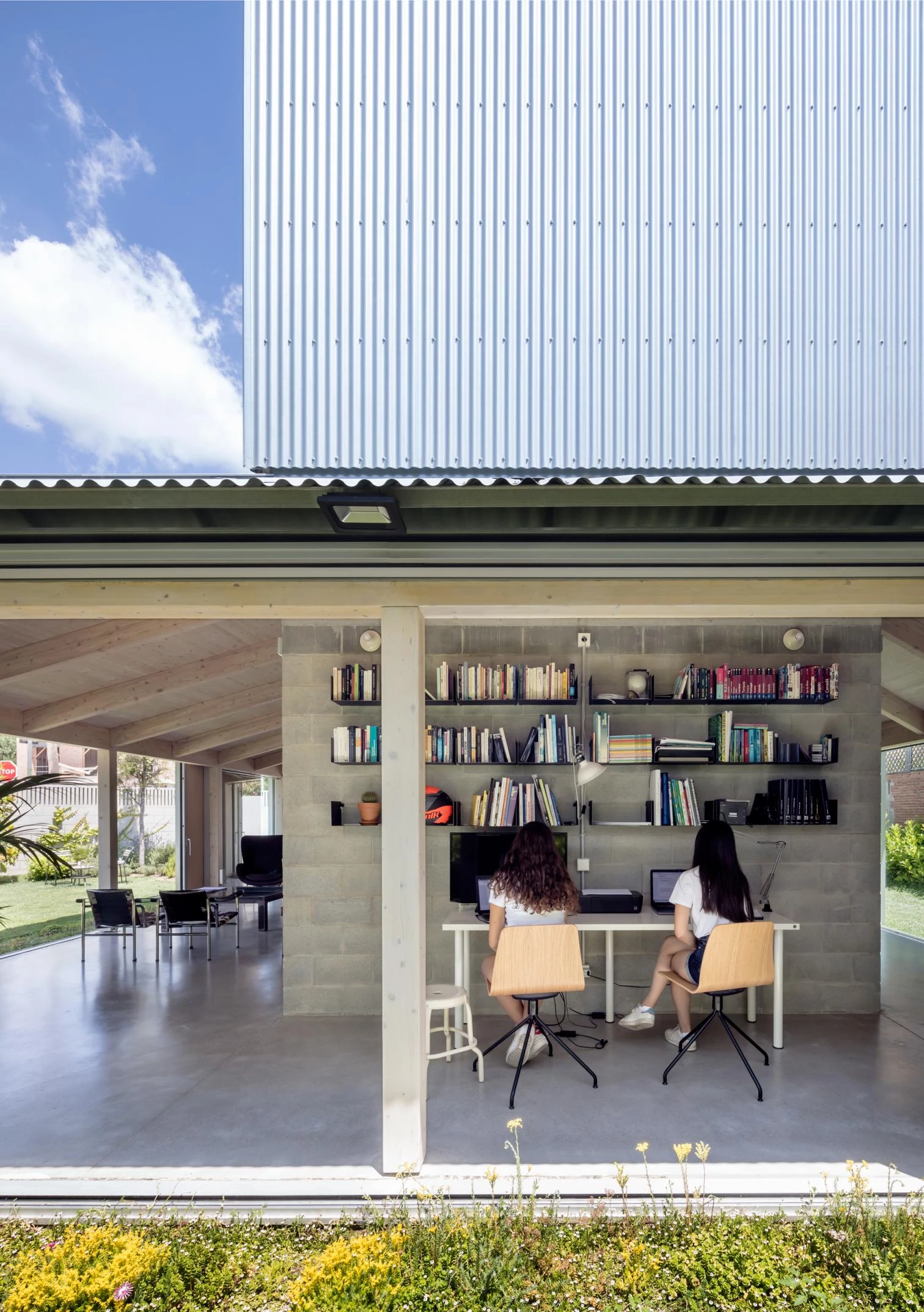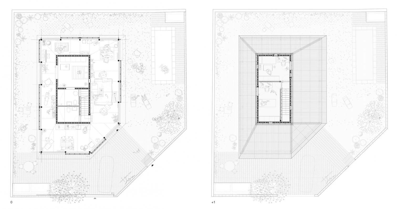 The owners, a couple with two children, wanted a house needing practically no maintenance, with a lot of privacy as well as a good relationship with the garden all year round, and with a large workspace. Only the sun, the geometry of the plot (almost square with a chamfer), a neighbor too close to the south, and a tower of houses to the north conditioned the project’s location.