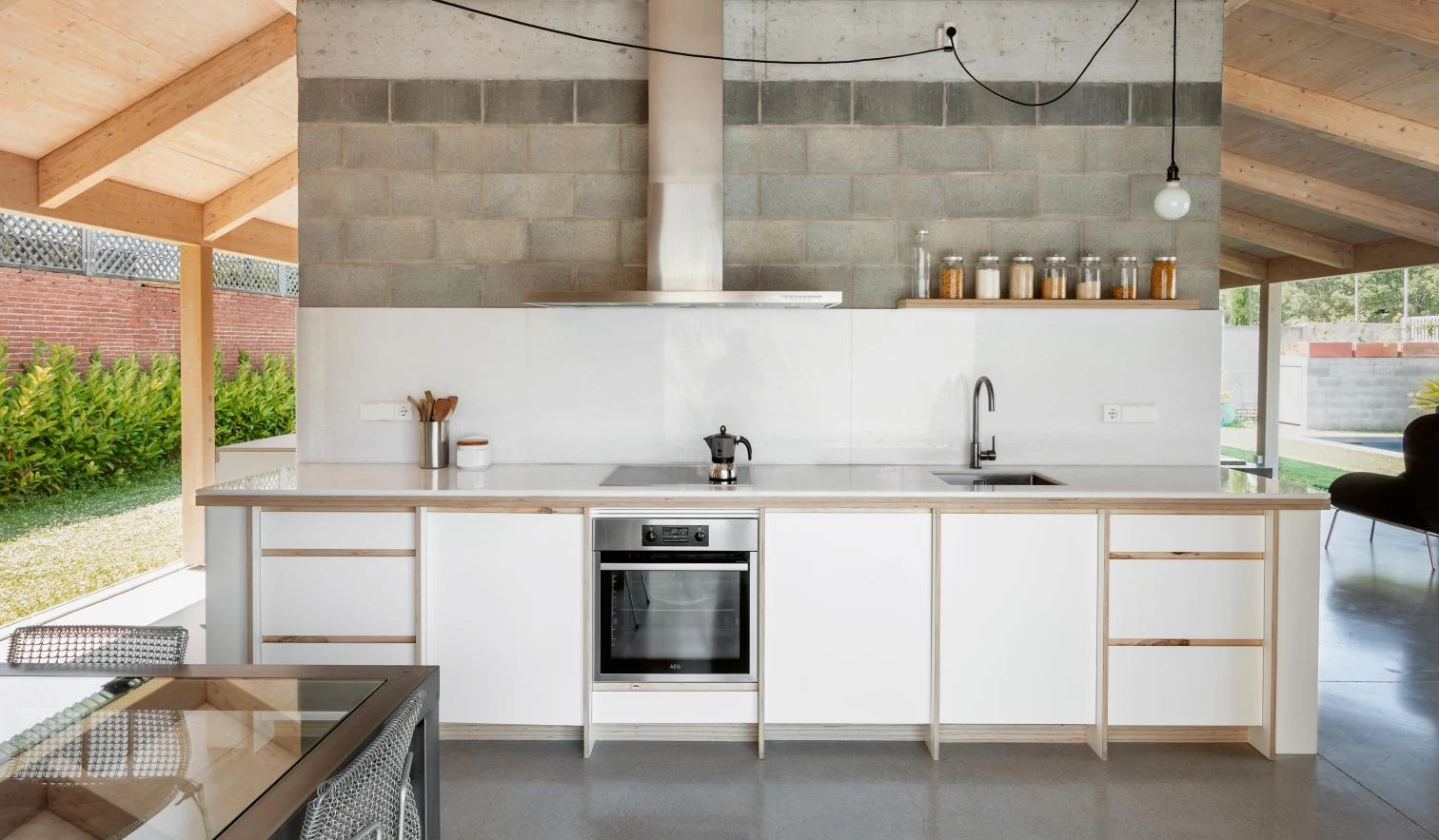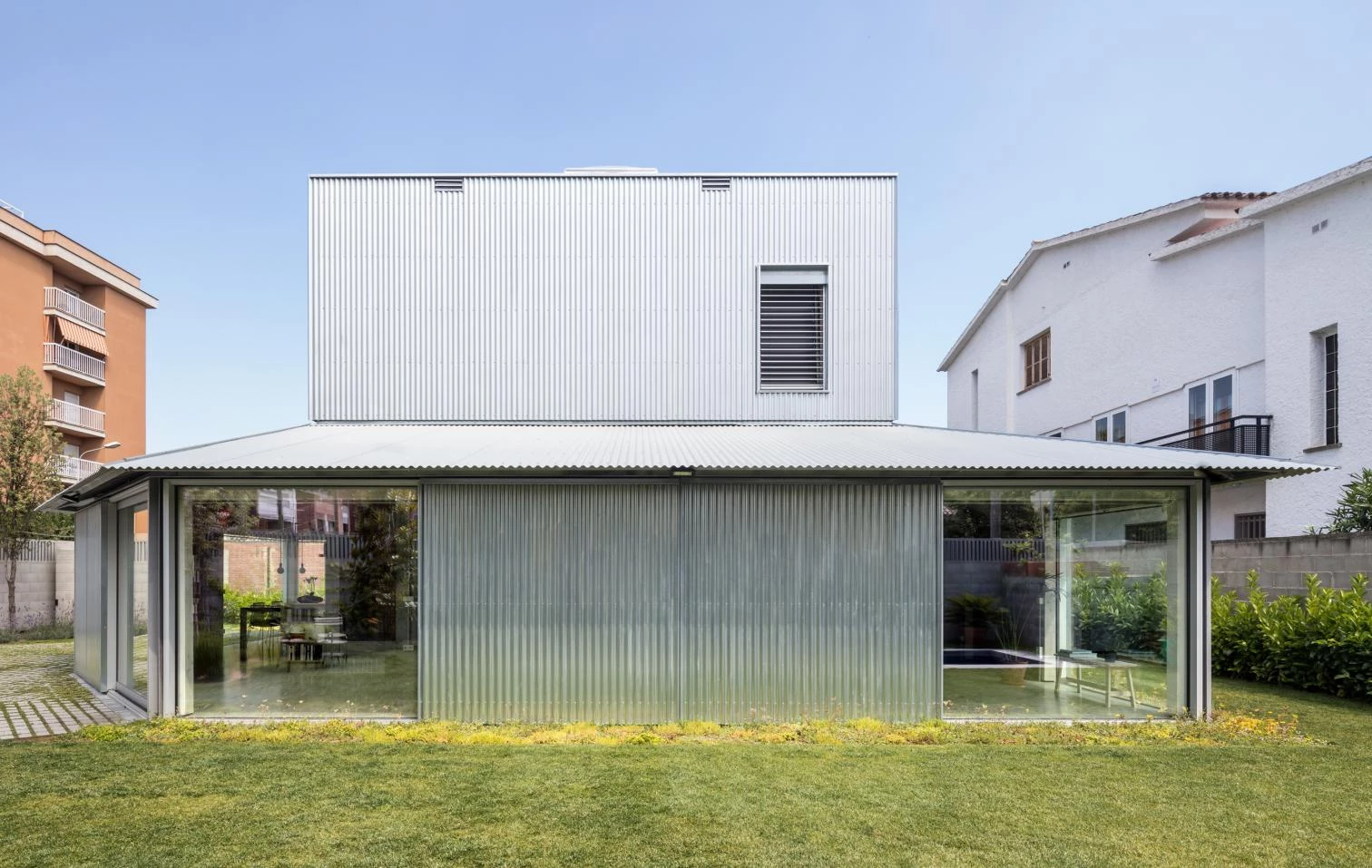 The new house is structured in four concentric layers parallel to the boundaries of the plot, from outside to inside: a two-meter high opaque fence; a perimeter garden of variable widths; a continuous veranda that accommodates the more public functions and proposes intense and variable relations (seasonally) with the patio; and lastly, the central volume, a massive two-story volume that houses the bedrooms. These two last layers are differentiated not only by the programs contained, but also by the building systems used in their construction. With a pitched roof, the veranda has been built using light elements and dry construction: wood structure and enclosures of steel and glass. In contrast, concrete blocks make up the central body and favor thermal inertia.