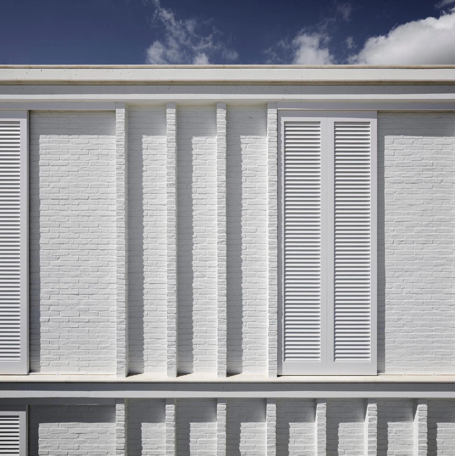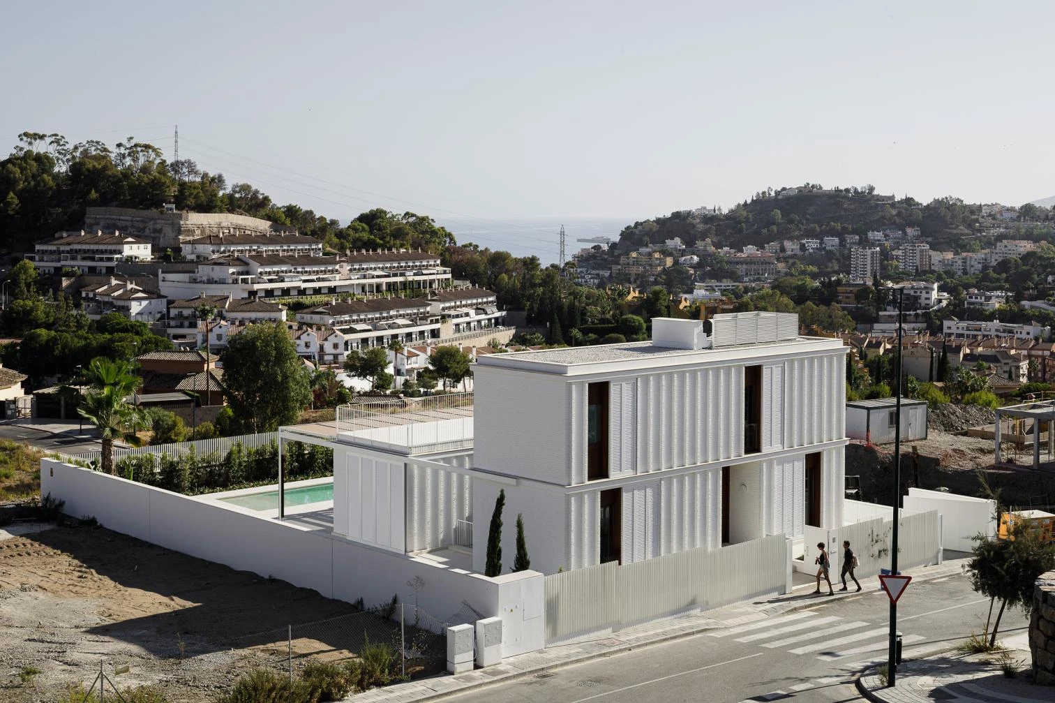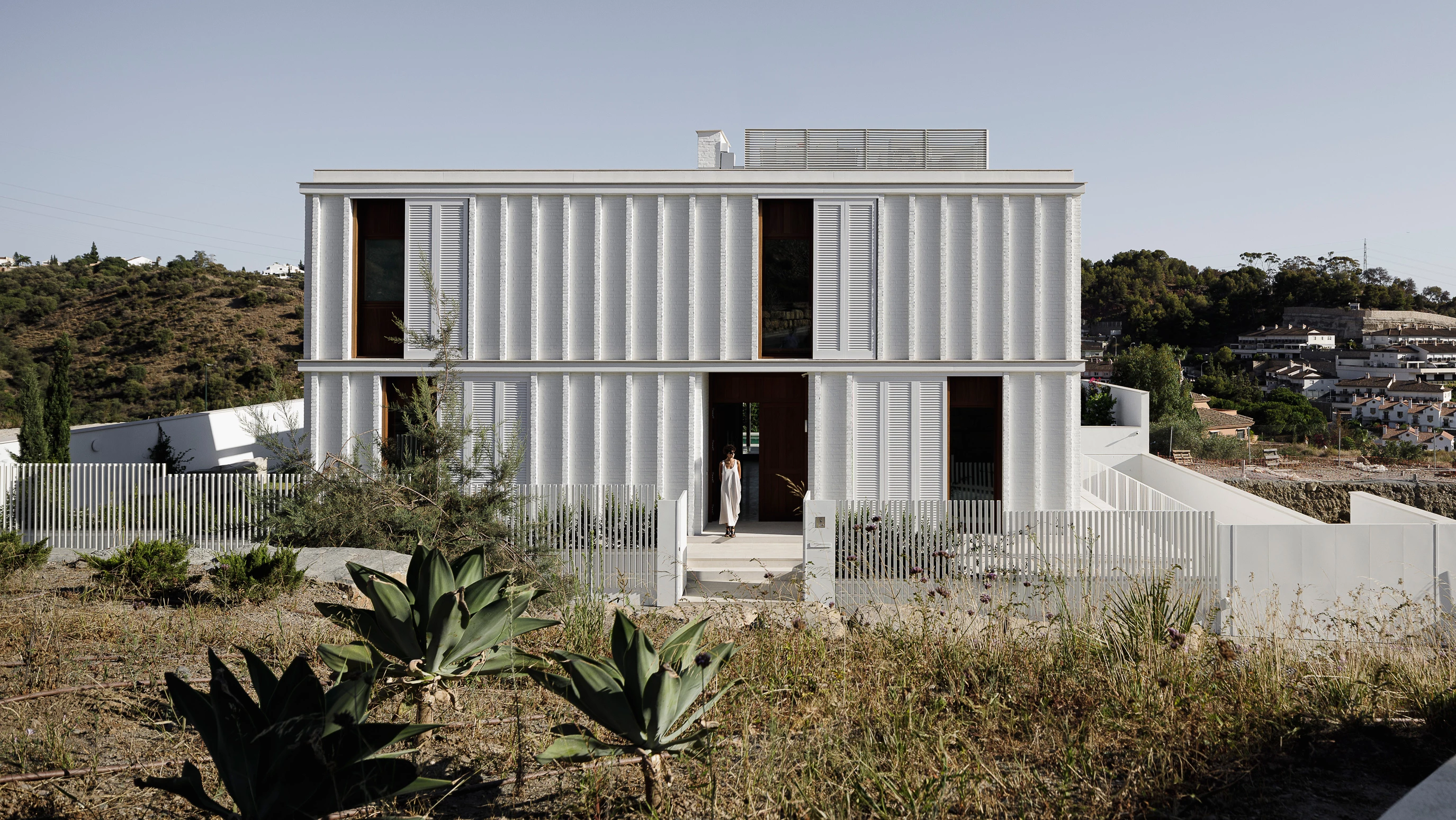 This three-floor residence rises on a flat, square-shaped plot in the Limonar neighborhood of Málaga. A work of Marina Uno Arquitectos (Juan Manuel Sánchez La Chica and Adolfo de la Torre Prieto), it is organized by a system of parallel bands running north to south and crossed by a circulation axis connecting the different parts of the program. Access is via a deep opening drilled through the bedrooms part. The walls present a brick bond with pilasters shading the facades. Everything is painted white to minimize absorption of solar rays. Thin slabs of reinforced concrete rest on walls of manual brick, and a thin metal structure exposes itself on the garden side.