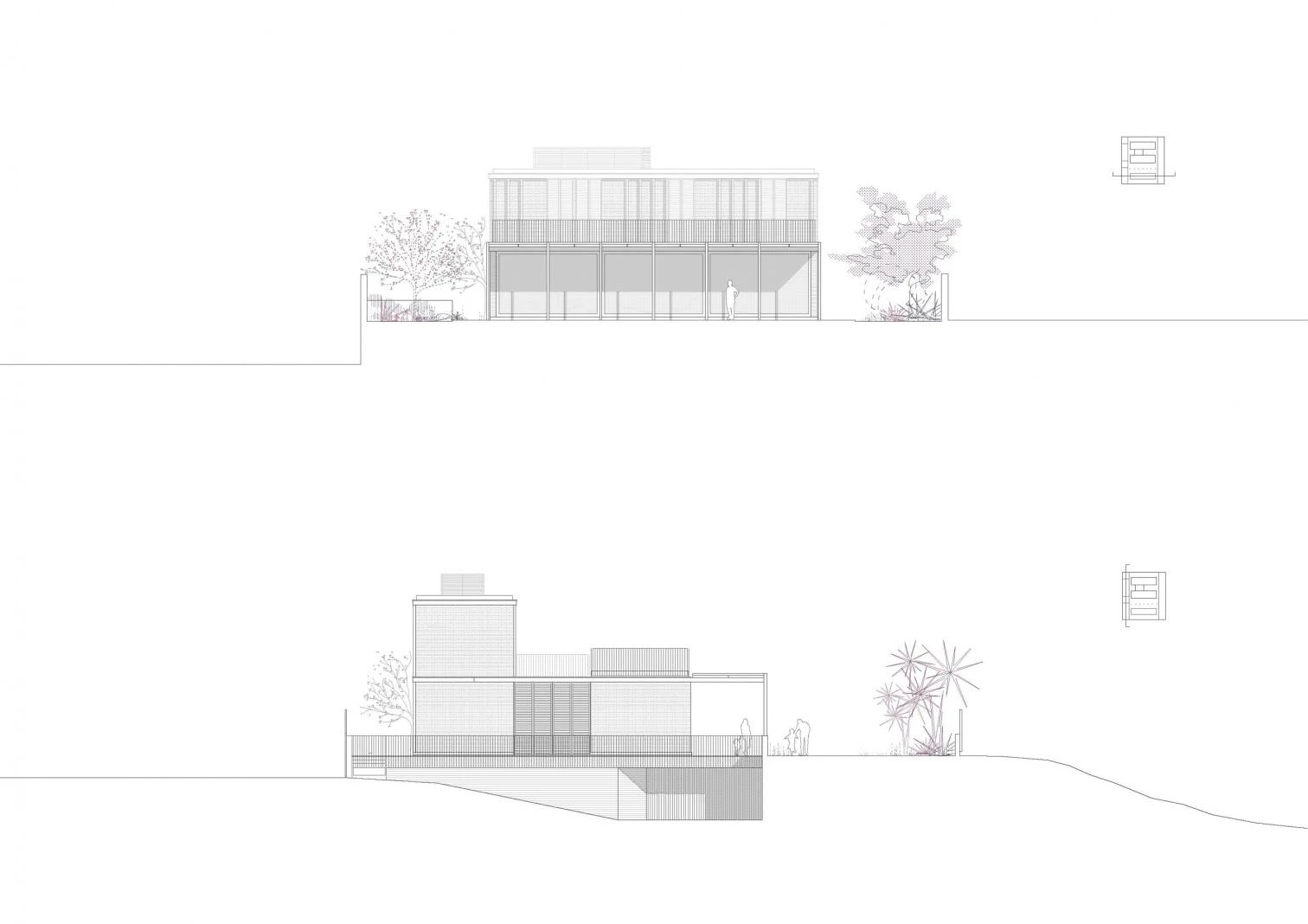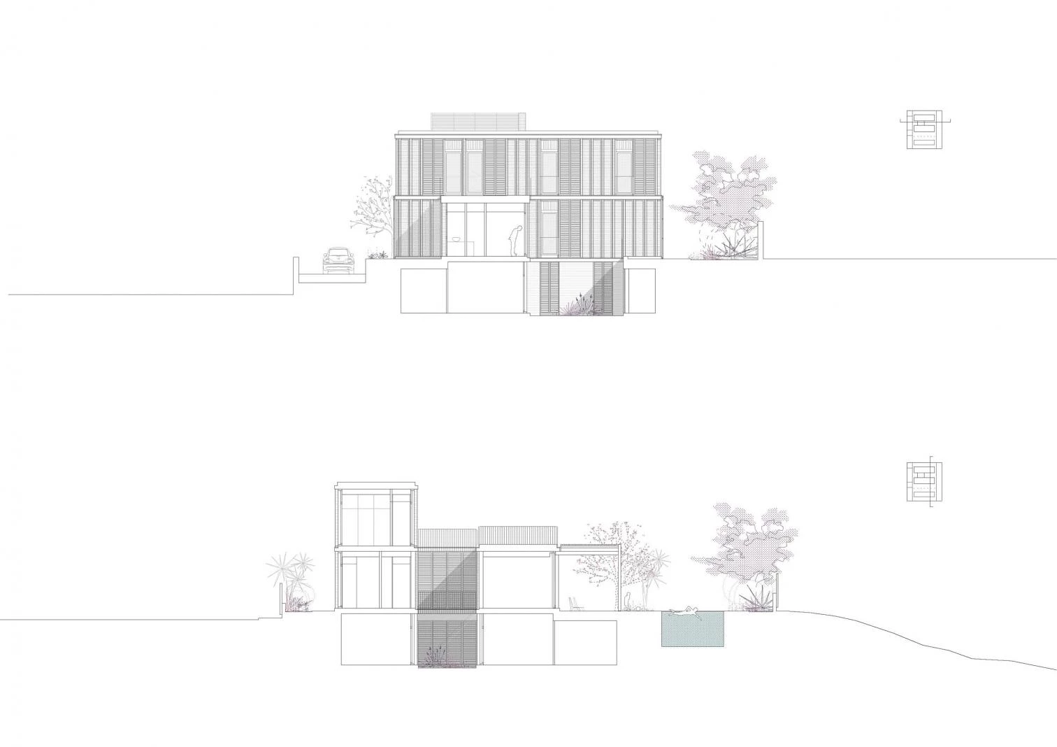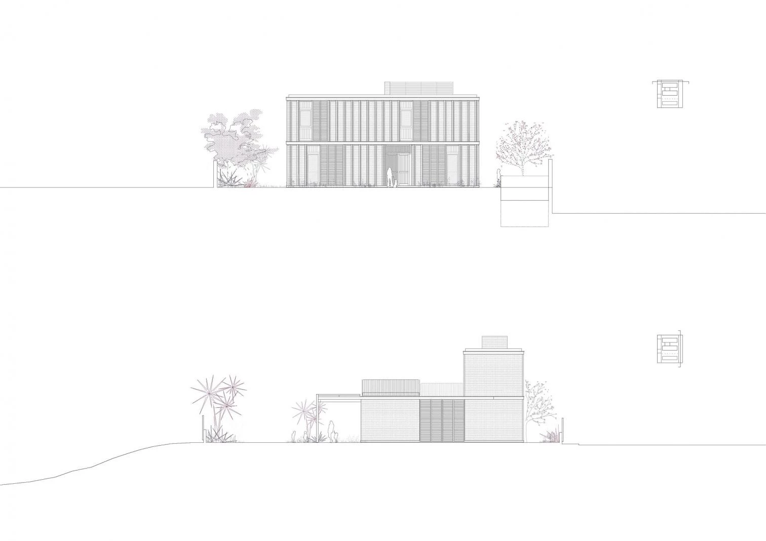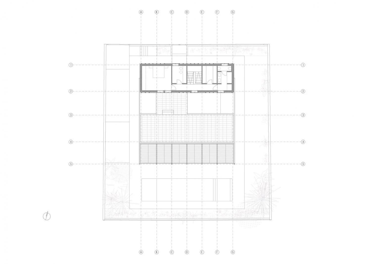 This three-floor residence rises on a flat, square-shaped plot in the Limonar neighborhood of Málaga. A work of Marina Uno Arquitectos (Juan Manuel Sánchez La Chica and Adolfo de la Torre Prieto), it is organized by a system of parallel bands running north to south and crossed by a circulation axis connecting the different parts of the program. Access is via a deep opening drilled through the bedrooms part. The walls present a brick bond with pilasters shading the facades. Everything is painted white to minimize absorption of solar rays. Thin slabs of reinforced concrete rest on walls of manual brick, and a thin metal structure exposes itself on the garden side.