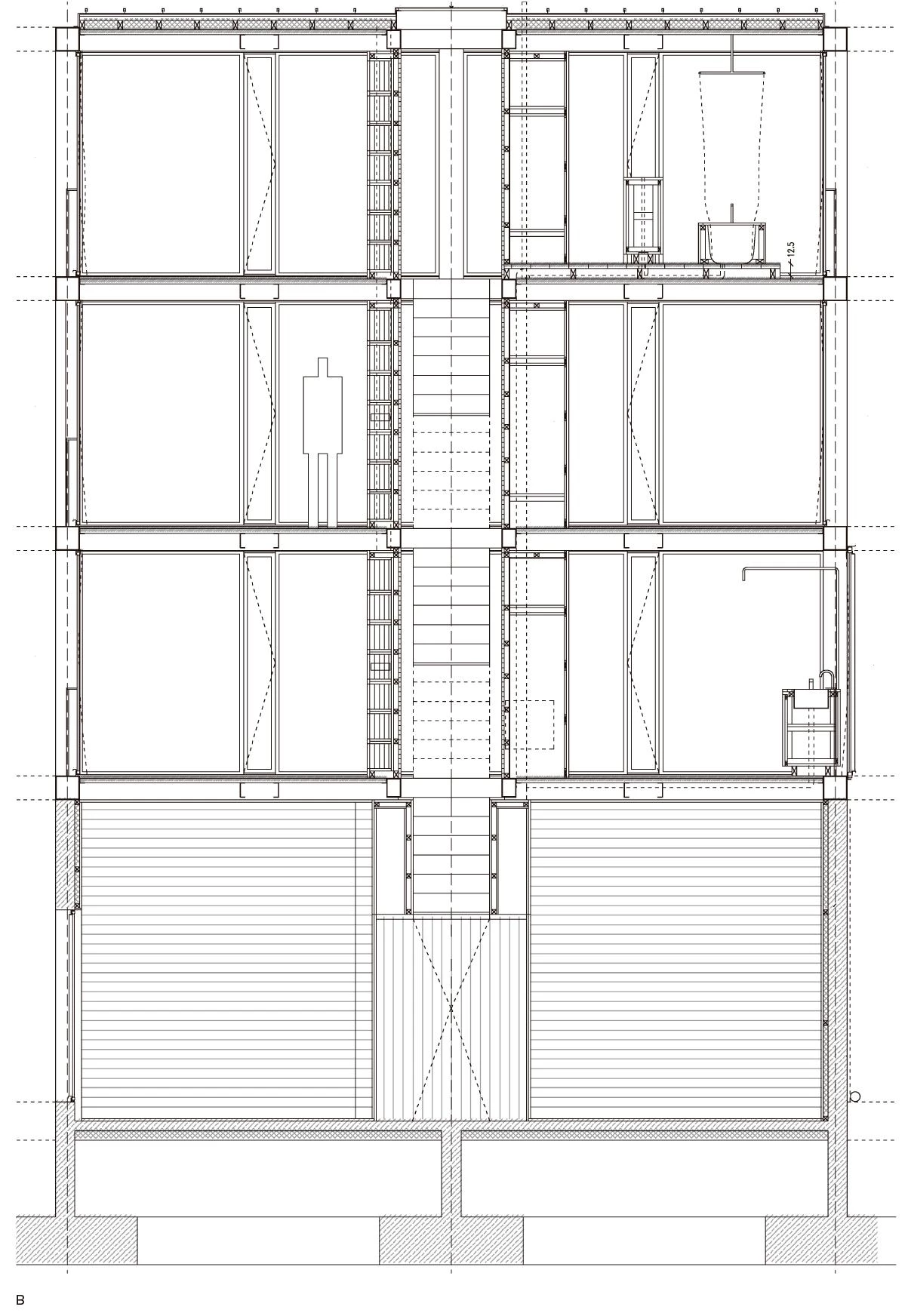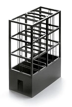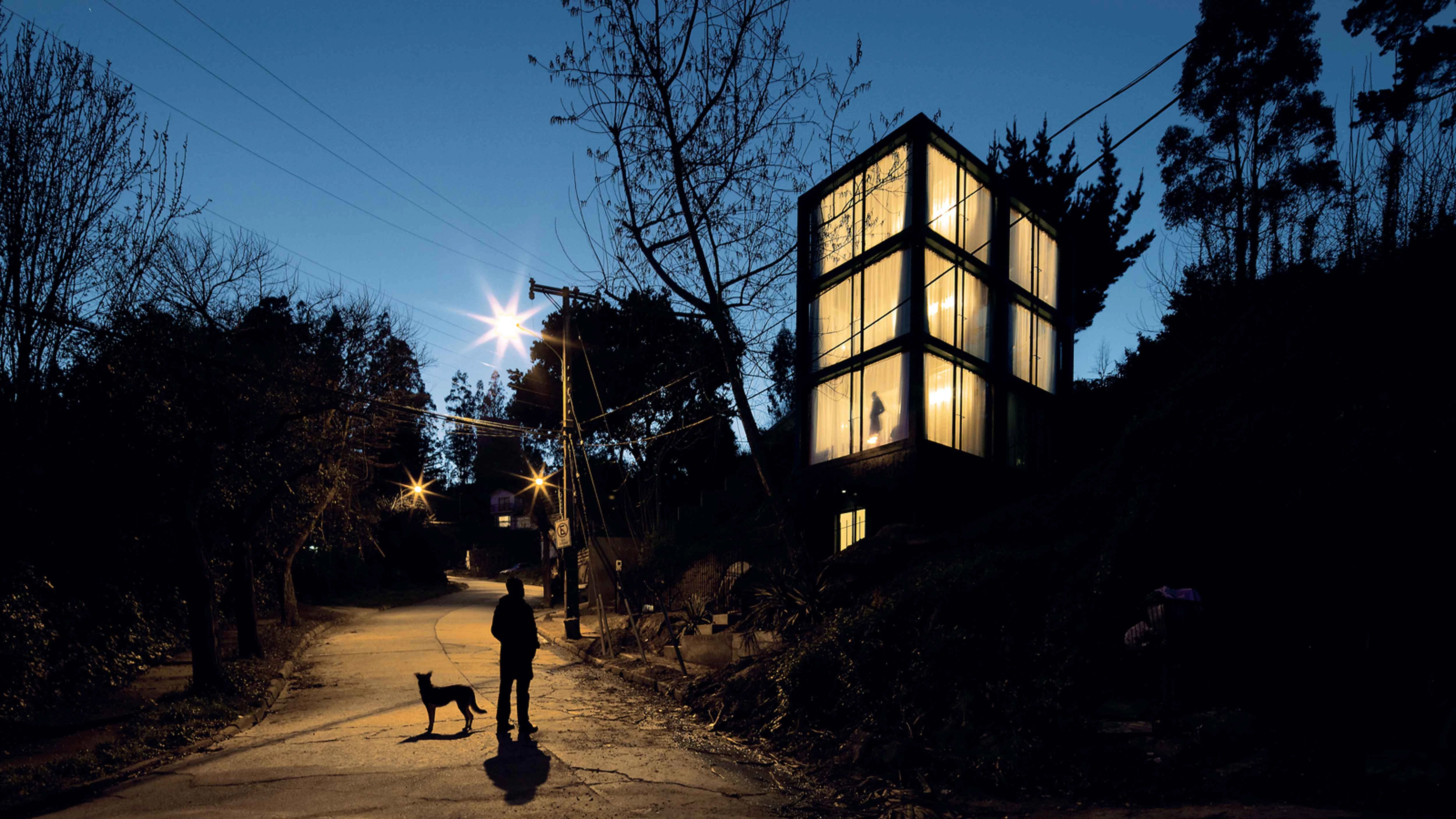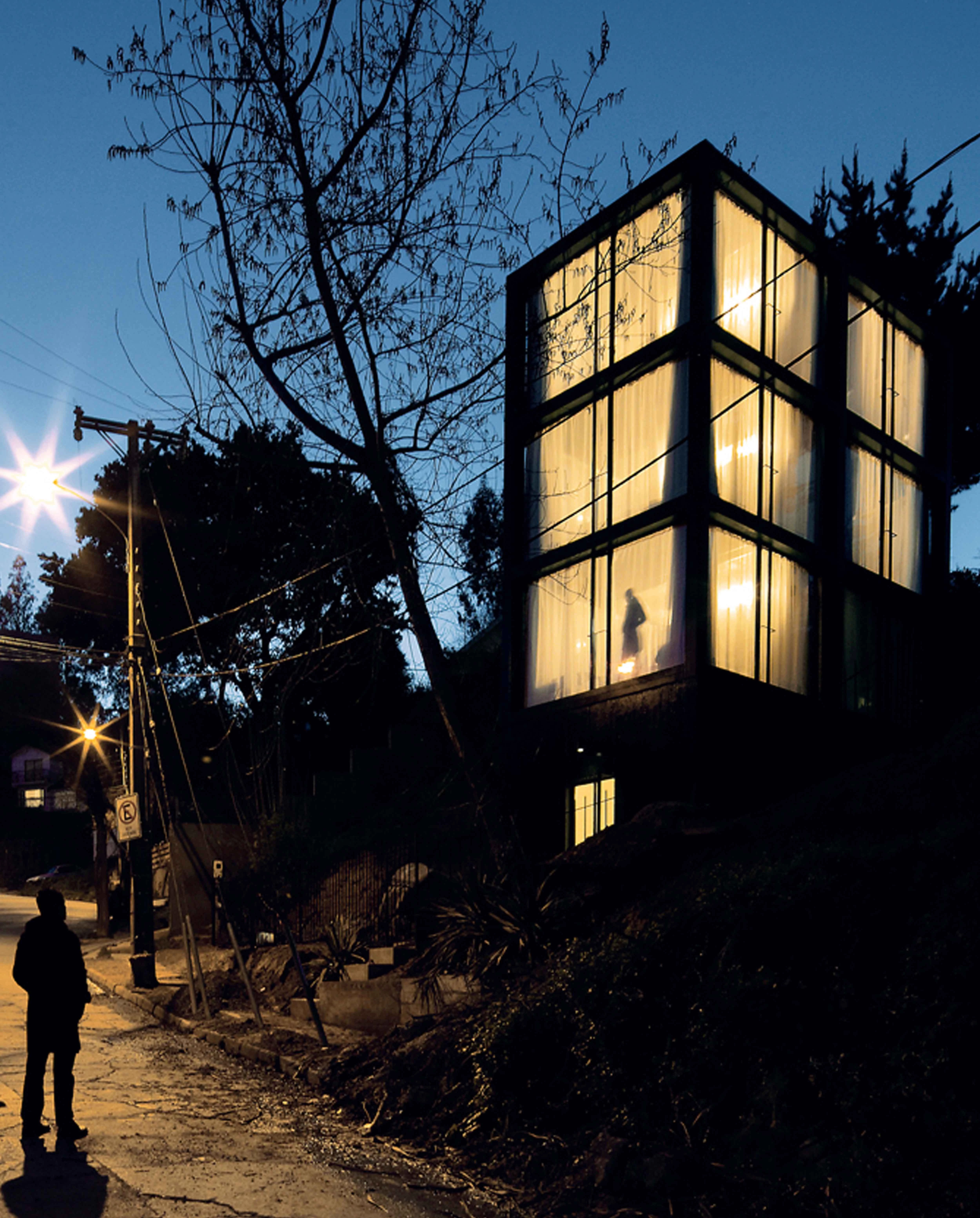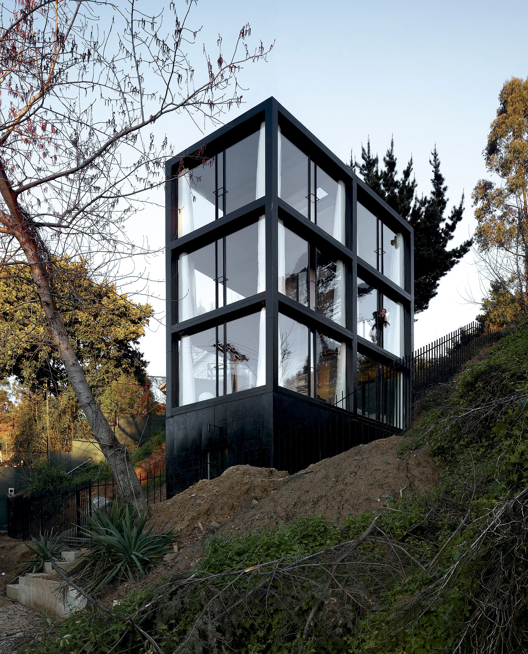 The decisions taken in the design were the reaction to an accident. It was created for an artist couple: he works with paper, engravings and digital publishing; she, with enamelled ceramic. They had previously been living together in a big old house on the side of a hill, but it was destroyed during the earthquake that devastated central Chile in 2010. Resistance is not only opposition to a force, but also tolerance, patience, being strong-willed. For things to last, for them to withstand the weight of time, they must suffer; the question was to what extent this tension should be made visible. The house is a vertical structure with a small rectangular (1:2) floor plan. An almost blind plinth of concrete sealed with asphalt is used to embed the house into the terrain. From this plinth emerge six steel 250 x 250 x 8 mm columns. This rigid-frame structure defines six equal rooms. At the center of gravity of the floor, the crossbeams are duplicated in order to create a vertical circulation in which the 45º intersecting nodes are bracing squares and double-landing steps. The steel components have been fireproofed and brightly enamelled with a coarse grain. Too thick to be of steel, too thin to be of concrete, the black structure frame seems awkward when we consider the size of the volume it supports.