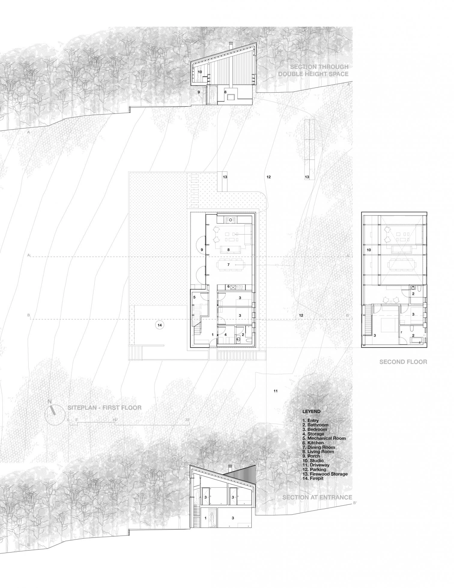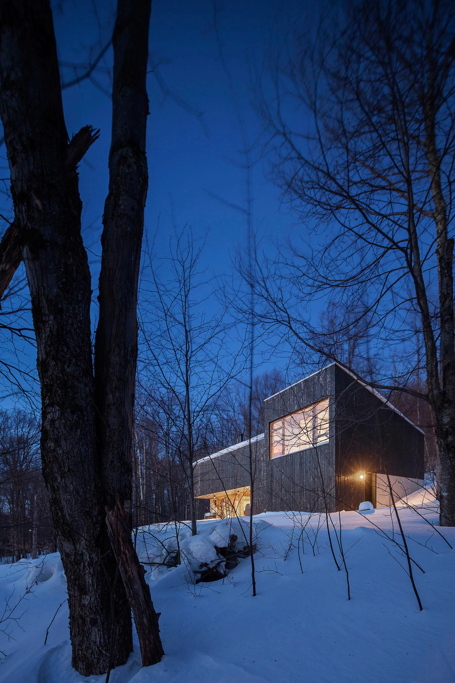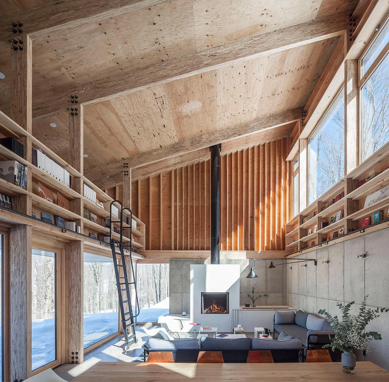 The system of a ventilated facade in a continuous enclosure, with the insulation on the outer side of the wall and the roof pitched, eliminates thermal bridges and leaves the structure exposed to view indoors. The facades use carbonized cedarwood treated with a Japanese technique that increases resistance to water, fire, and insects.