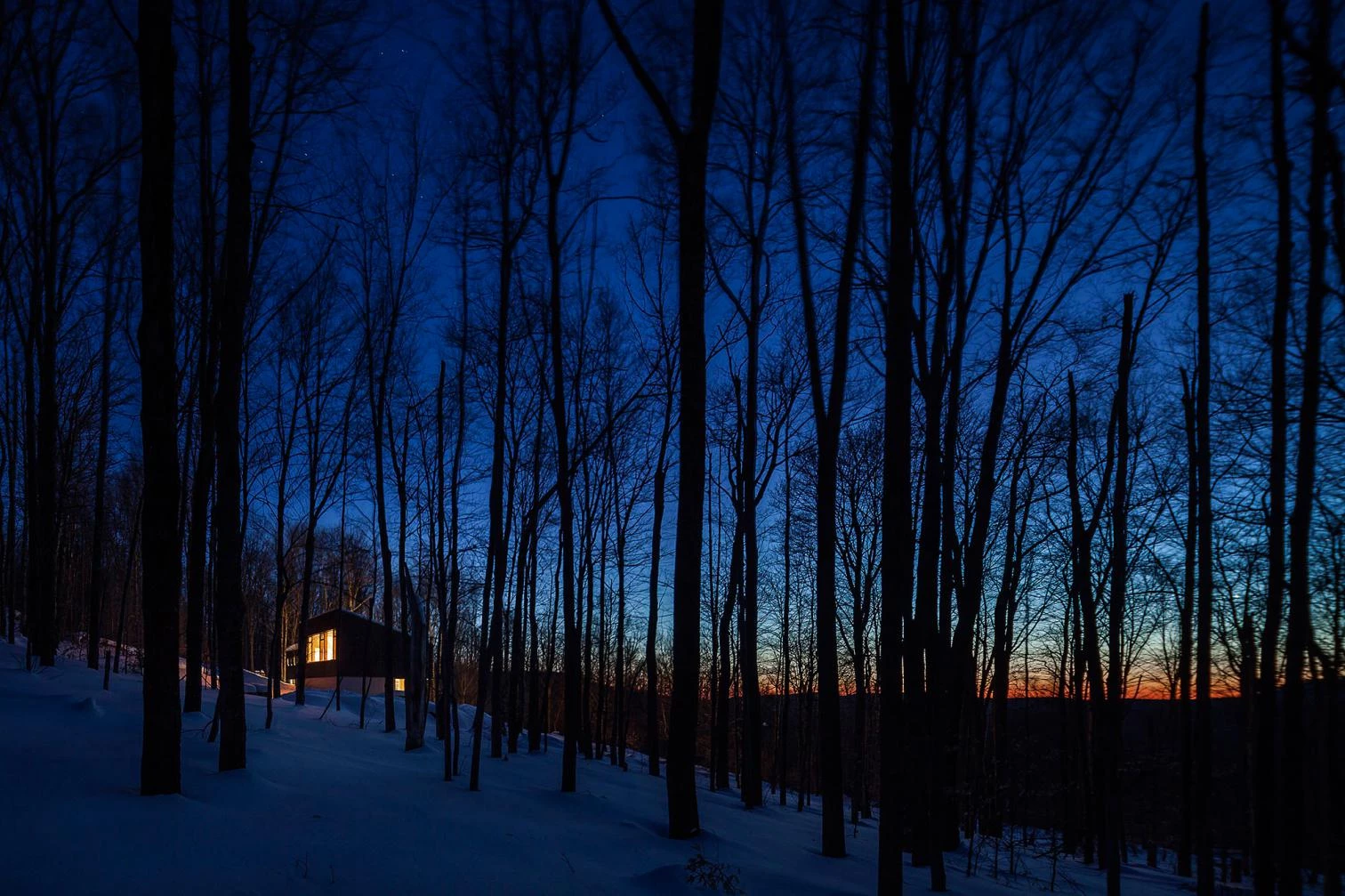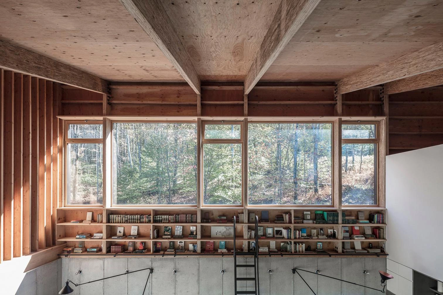 The firm of María Milans del Bosch, based in Madrid and New York, built this house-studio in the Catskill Mountains of New York State. Set on a slope at an altitude of 1,000 meters, amid larch, oak, and birch trees, it has minimal impact on the terrain, with a footprint of 7.2 x 17.6 meters.