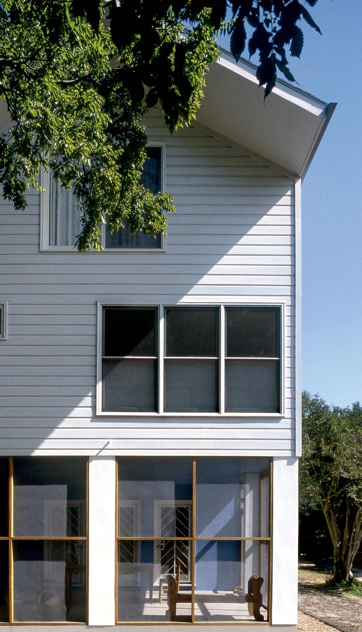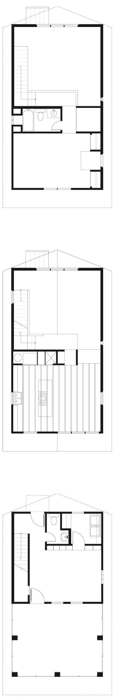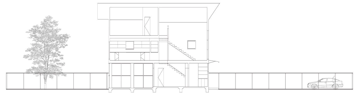 Located in a marginal area of the Houston Heights neighborhood, the three-storey wood framed house sits in the middle of its 33 feet wide by 135 feet deep site. Oriented along its predominant south-north axis and prevailing south breeze, the house is a vertical version of the ‘shotgun’ house, a variation on the noted type once common to the region. Organized in three levels, the dwelling spaces are divided into a south section and a north section. The former contains a screened porch, kitchen and dining, and the main bedroom, all facing a diagonal view of the dramatic skyline of downtown Houston. For its part, the north section consists primarily of a double height living space overlooking a front garden and the encircling trees.