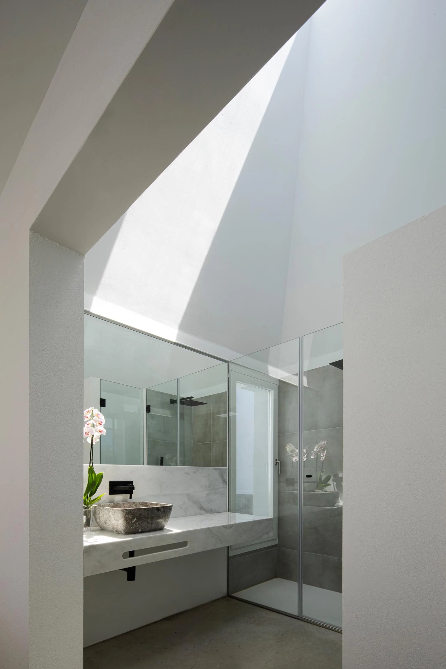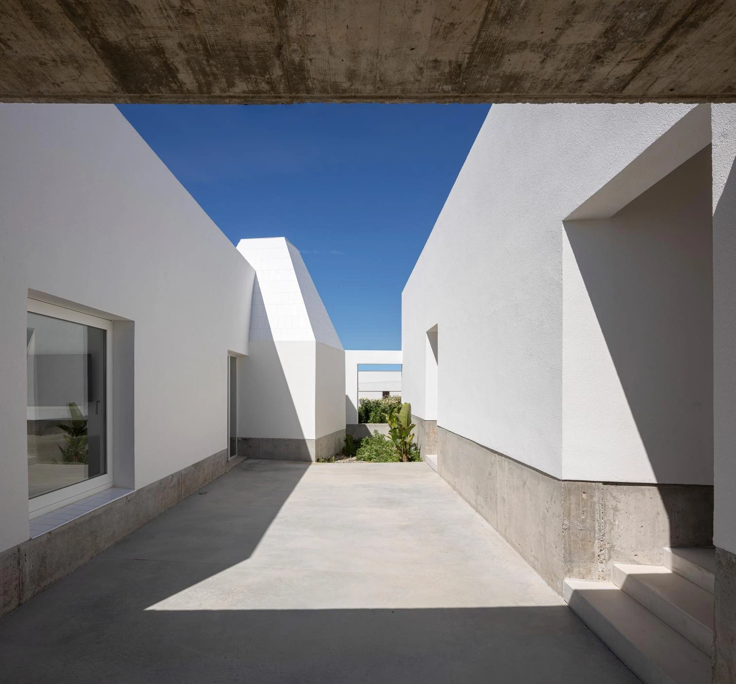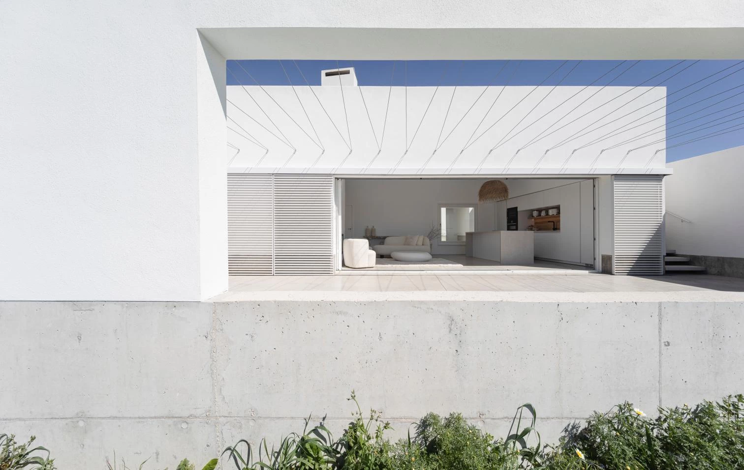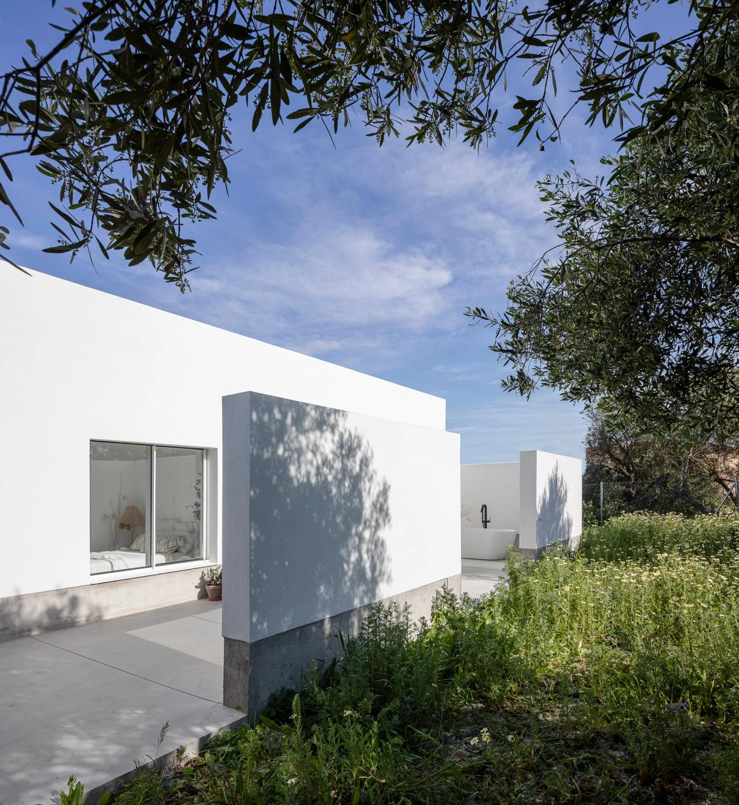 The stepped terraces and the structures harboring the different parts of the program are executed with distinct methods. The former result from a foundation that adapts to the topography. The three white volumes are built with loadbearing ceramic walls and external insulation. One of them, which contains the bathroom, alters the established geometric order and blocks outsiders’ view of the back of the entrance courtyard. A wall built along the edge of the terraces gives a nuance to views of the exterior, protecting the intermediate spaces against wind and sun.