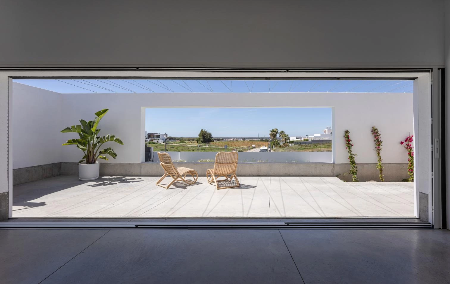 The dwelling can be said to have two different degrees of intensity: that of everyday living, and that of the less used spaces, which do not need as many direct connections. Fragmented but linked by exterior spaces, the single-floor house spreads out, incorporating the voids between built volumes. The indoor spaces are organized in two wings, one facing west to the Guadalquivir River and the other east toward the olive grove