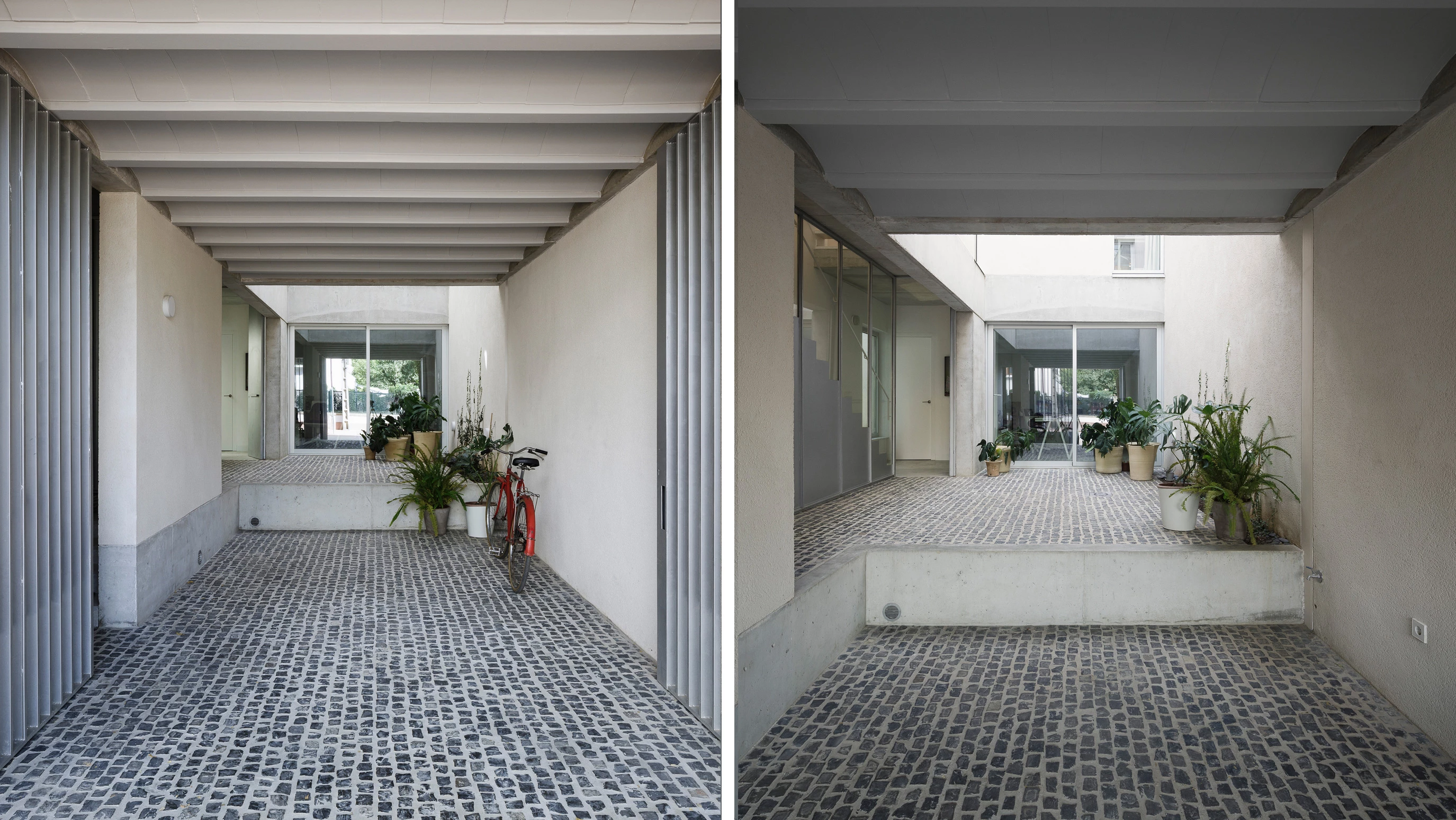 On a plot that is more deep than wide, the house is designed to differentiate work space from the domestic realm. The voids, concatenated on section, provide the different degrees of privacy requested, with extendable spaces for the interior rooms – including bedrooms – that face patios, guaranteeing protection against street noise, cross ventilation, and natural light.