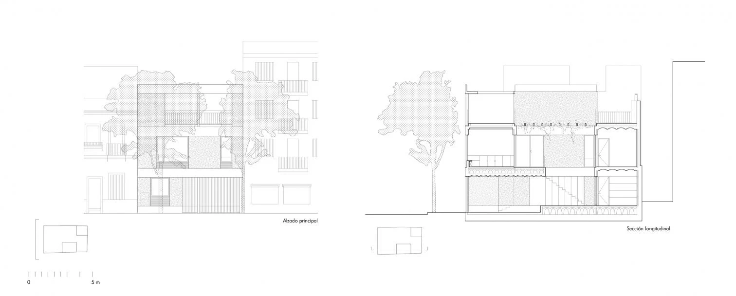The 194-square-meter dwelling is thus a play between public and private. A first space creates a gradual entrance that, by culminating in a backlit first patio, reaches an open longitudinal gallery. From there one gets to a single-flight staircase around which the house pivots, and thanks to which access to the home is separate from access to the work areas, through a street-hallway-patio-gallery sequence. From the other end of the gallery, around a main courtyard, one proceeds to the ground-floor residence, which separates the bedrooms area by means of a more private patio. A pergola covers the central void formed by the party wall of the four-story building next door.