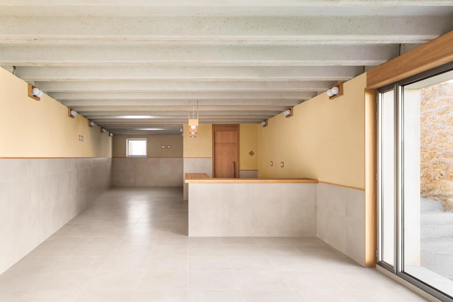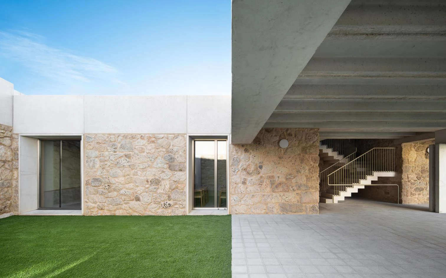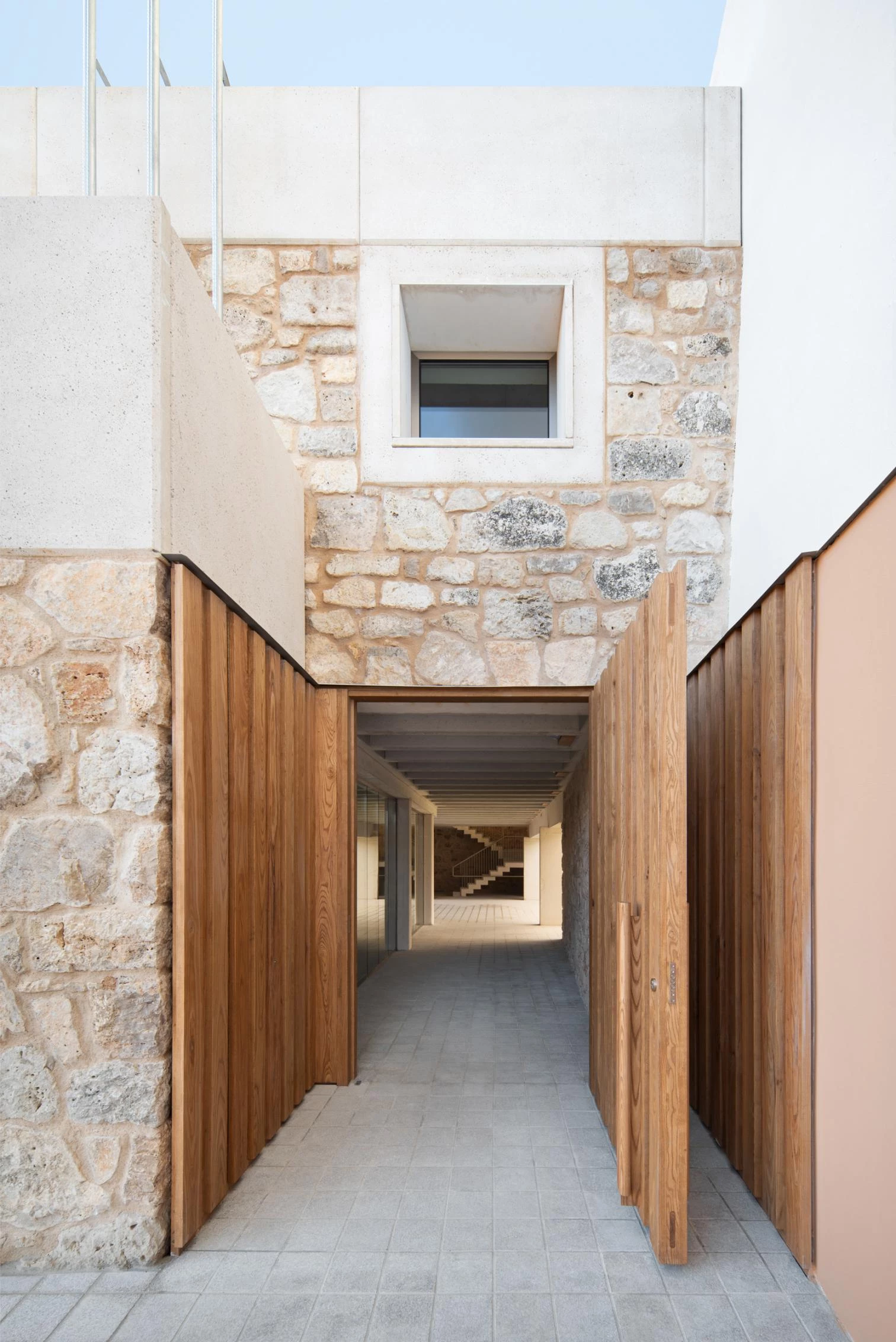 With just little more than 300 square meters roofed, the building is thought out like a mini-city. The interior routes are the streets – some covered, some arcaded – and a small intermediate square, and the doors to the different areas are open out to these. The main material used is local calcareous stone, which is complemented with wood and aggregate concrete in a language that fuses tradition and modernity.
