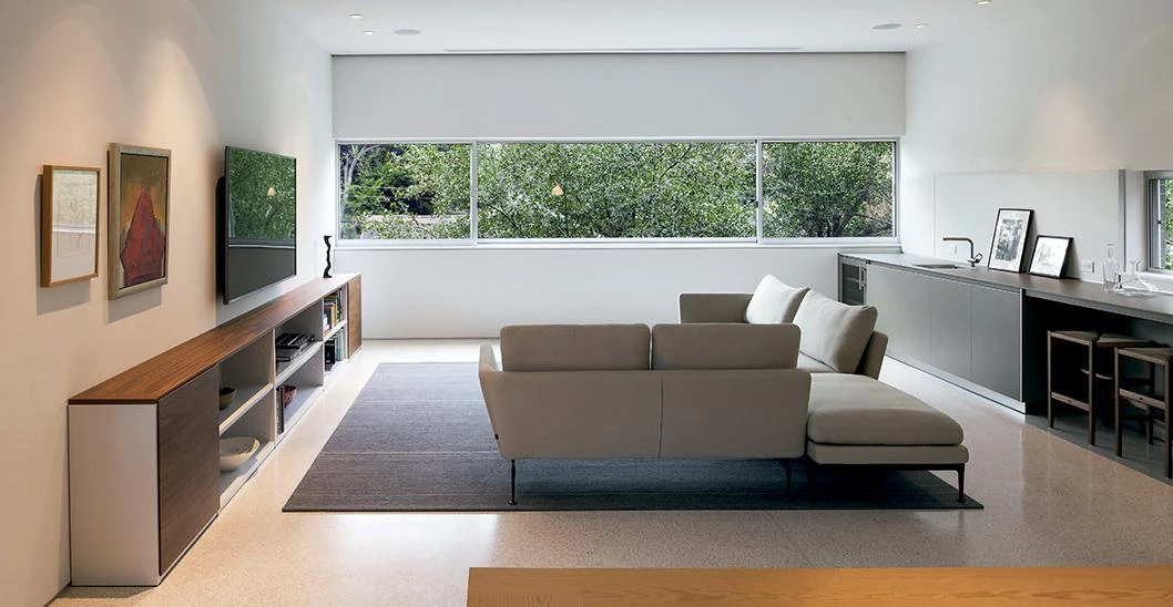 The two-story house consists of a lower and upper unit, independent yet linked like a duplex by a common staircase. The ground-level unit is the smallest one with two bedrooms, a media room, kitchen dining and living area. These spaces open or overlook a private courtyard and linear gardens. The upper unit is an open loft-like volume spanning the entire length of the house. The views are oriented to the courtyard below, Willard Street and Houston’s skyline to the east.