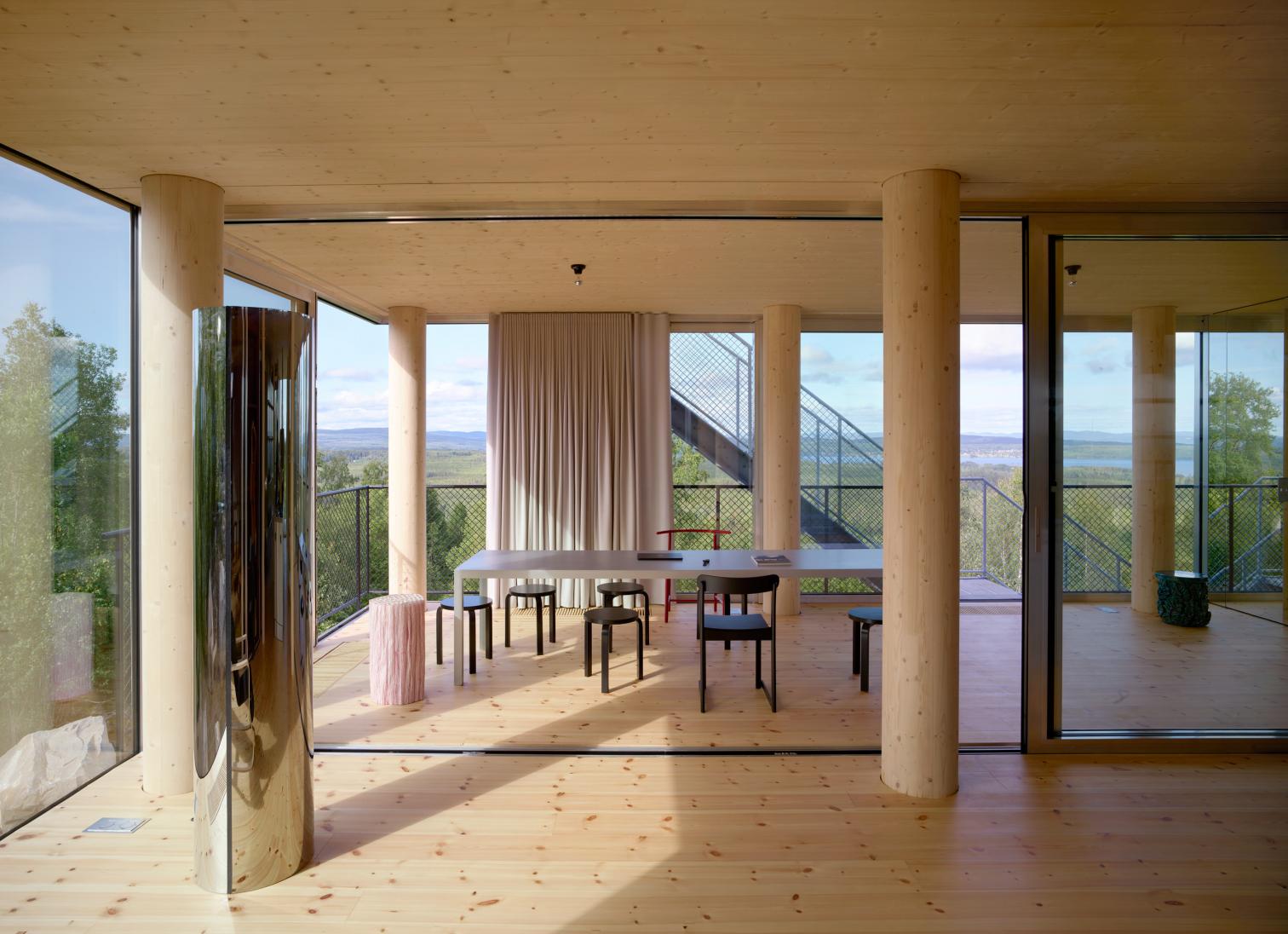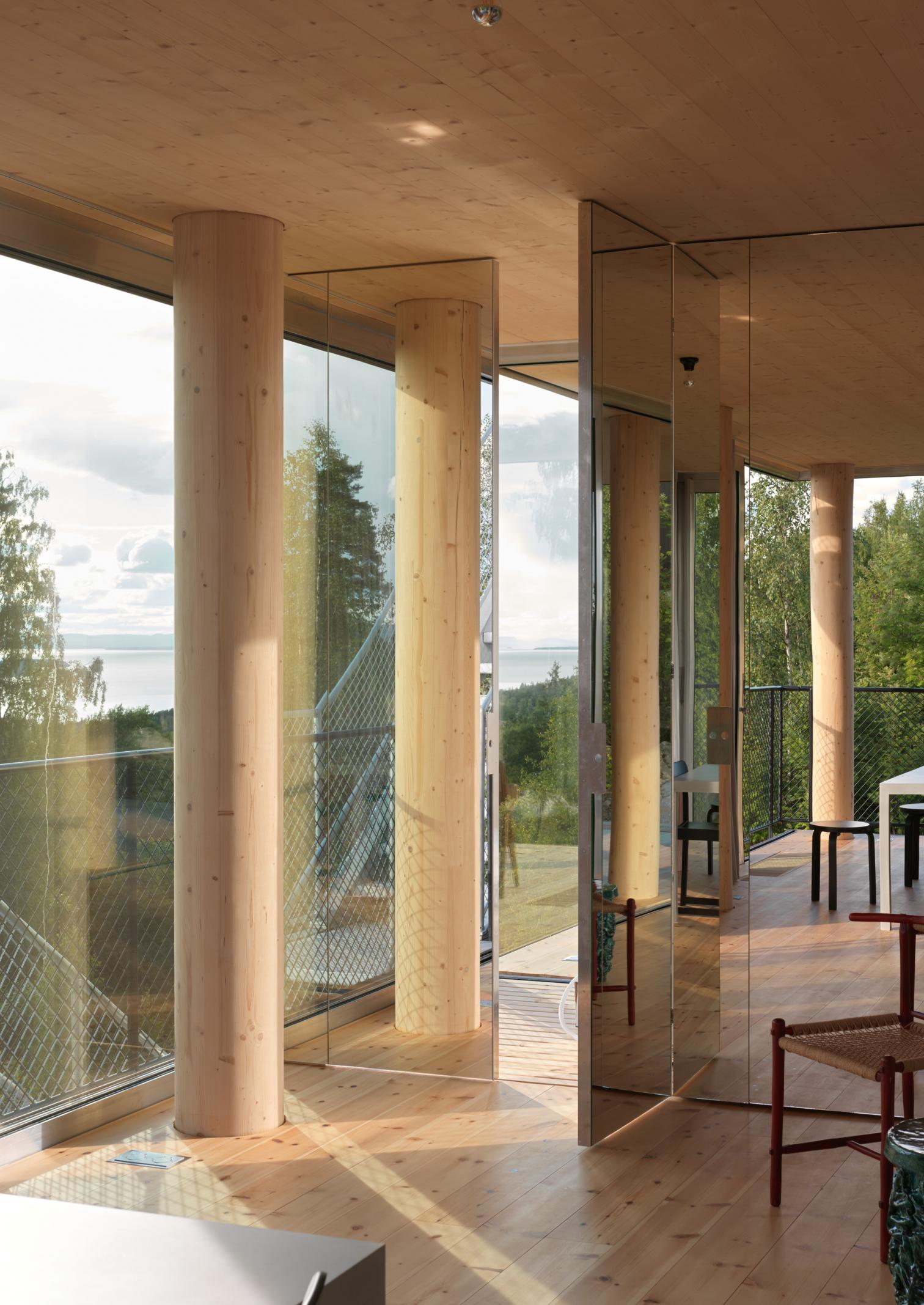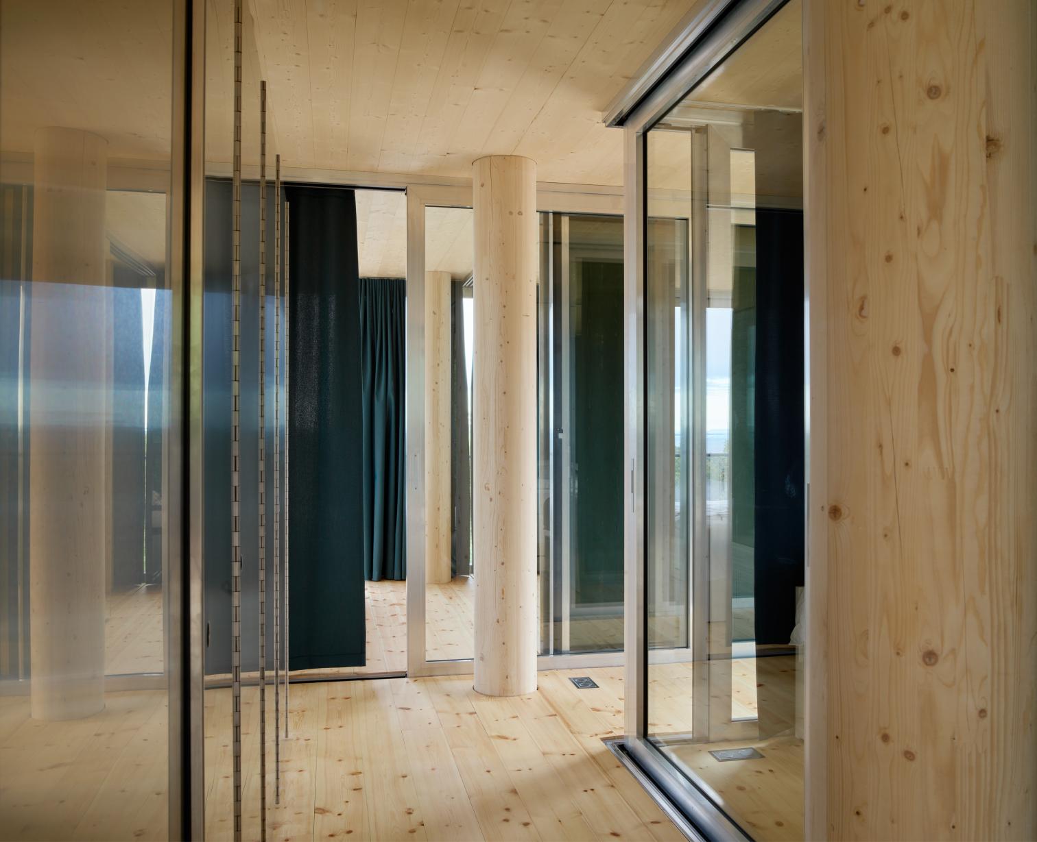 Inserted into the block, executed with untreated cross-laminated timber and glass-encased all around, are four mirrored volumes containing the most private areas, freeing up the rest of the hypostyle space.