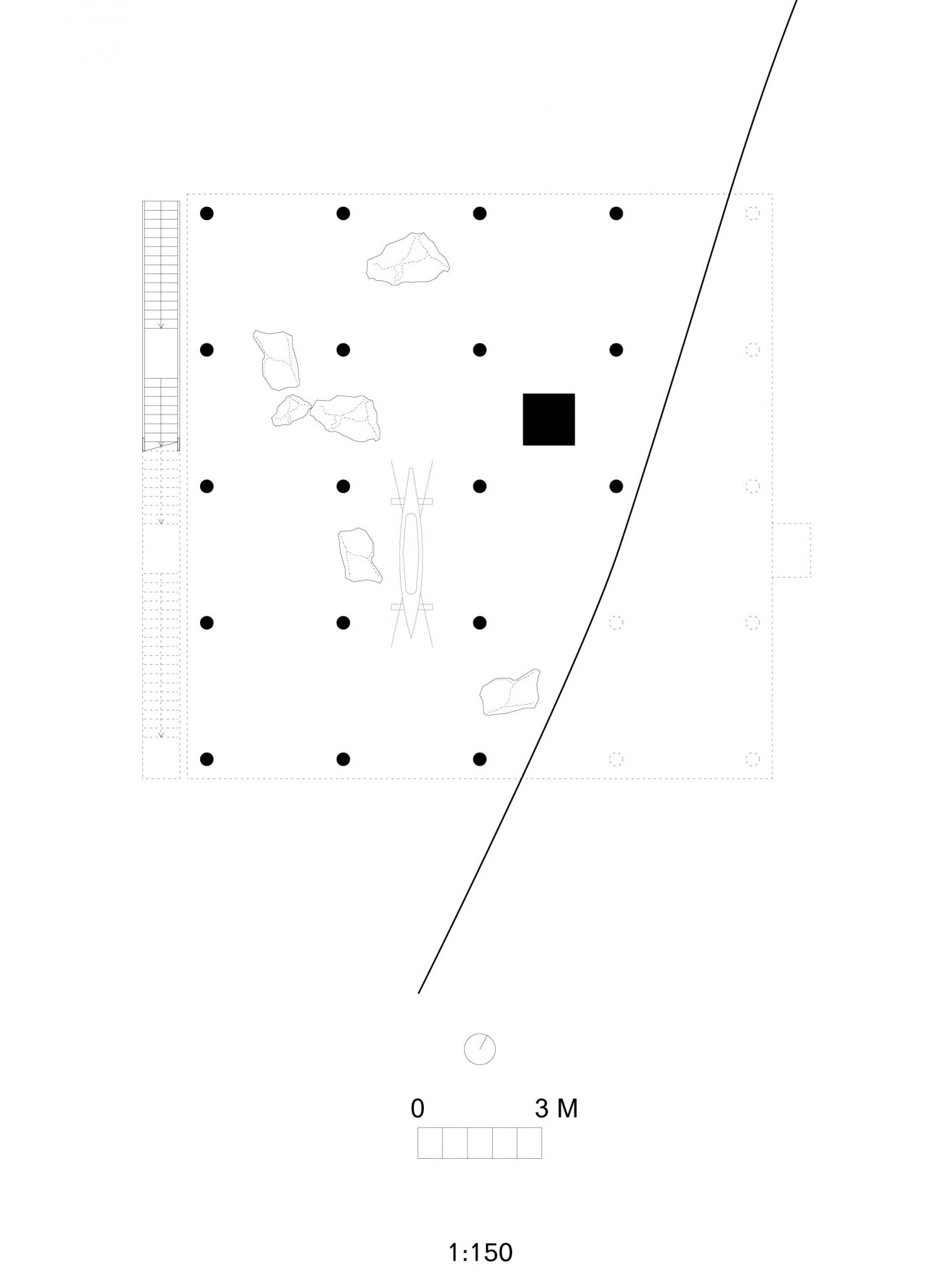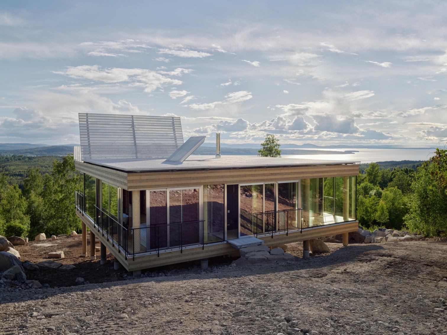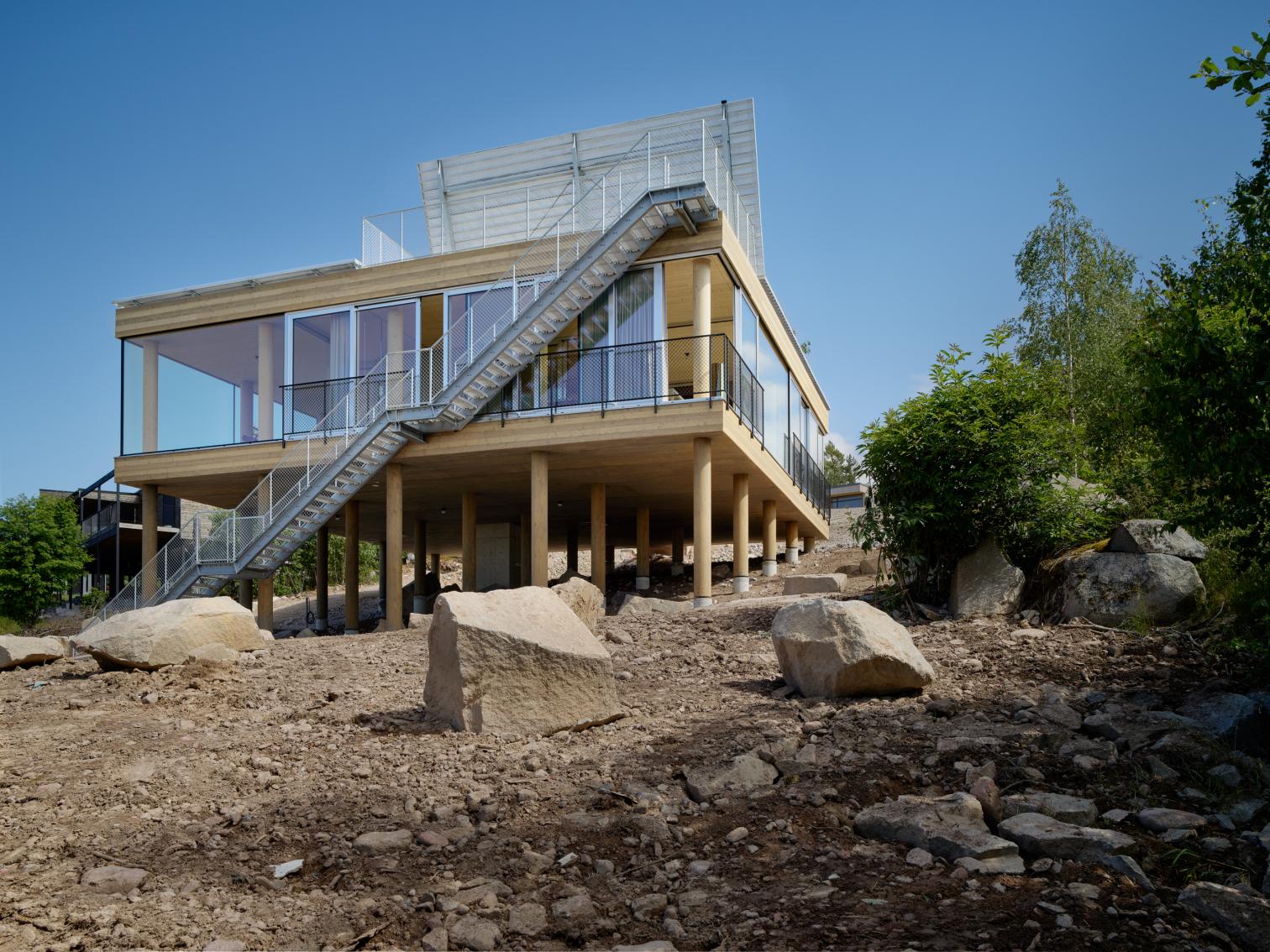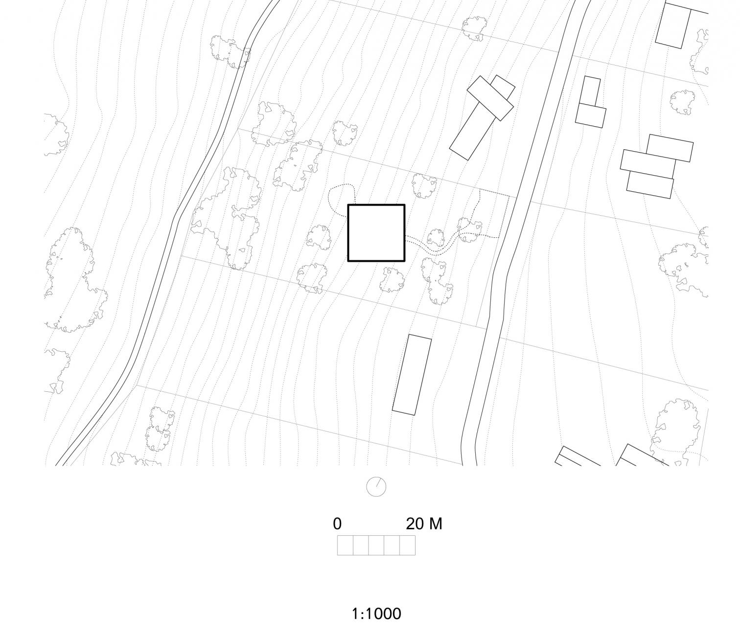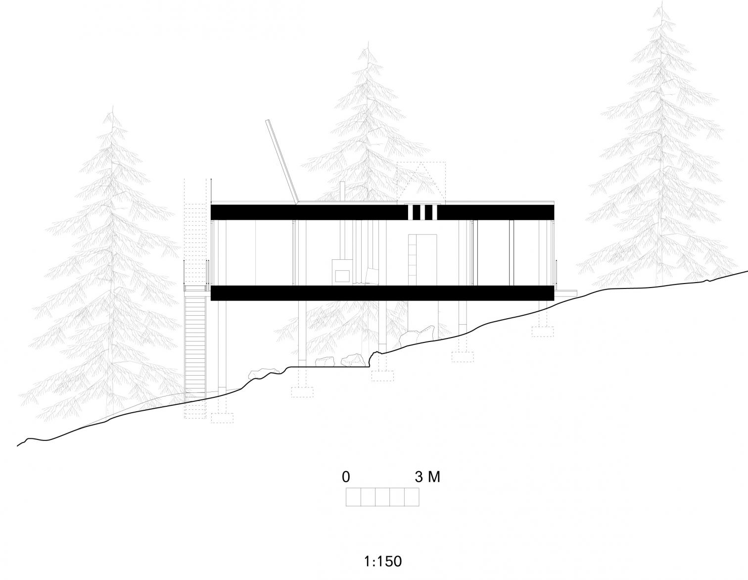 A vacation house rises on a slope as a simple prism propped up by ‘pilotis’ in order to alter the terrain as little as possible and give the occupants good views of a nearby lake.