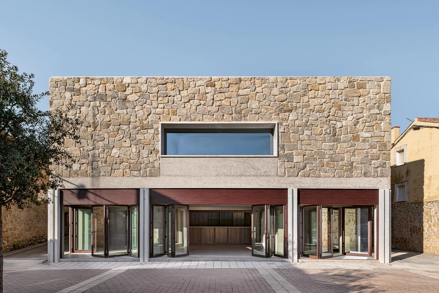 The quintessential space for socializing in small municipalities, the bar takes up an entire uninterrupted ground floor that can be extended to the open air by means of large sliding windows on three facades.