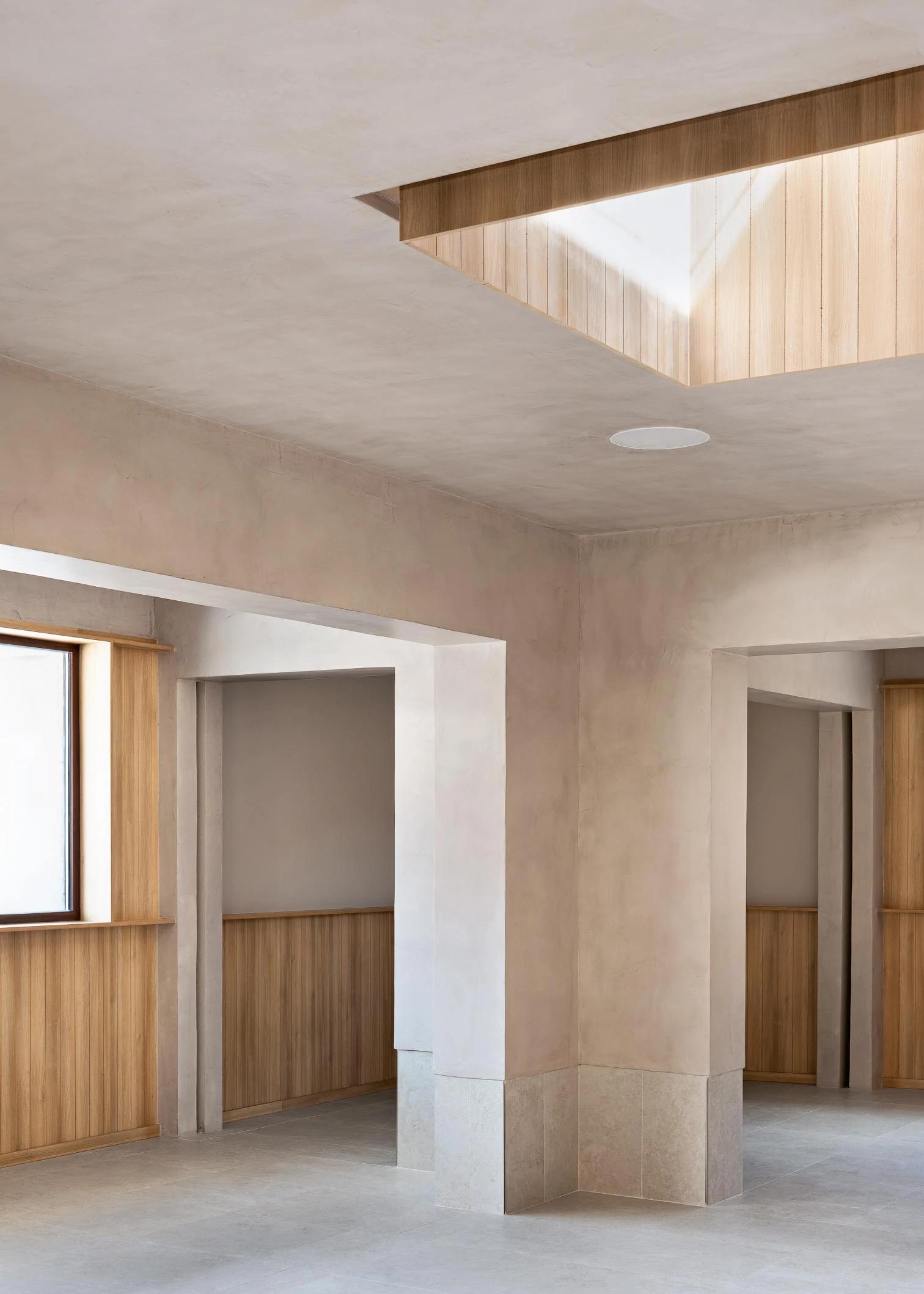 As happens at street level, four vigorous cross-shaped pillars subdivide the first-floor restaurant, which is imbued with an earthy tone giving the concrete structure an arid echo of nearby landscapes.