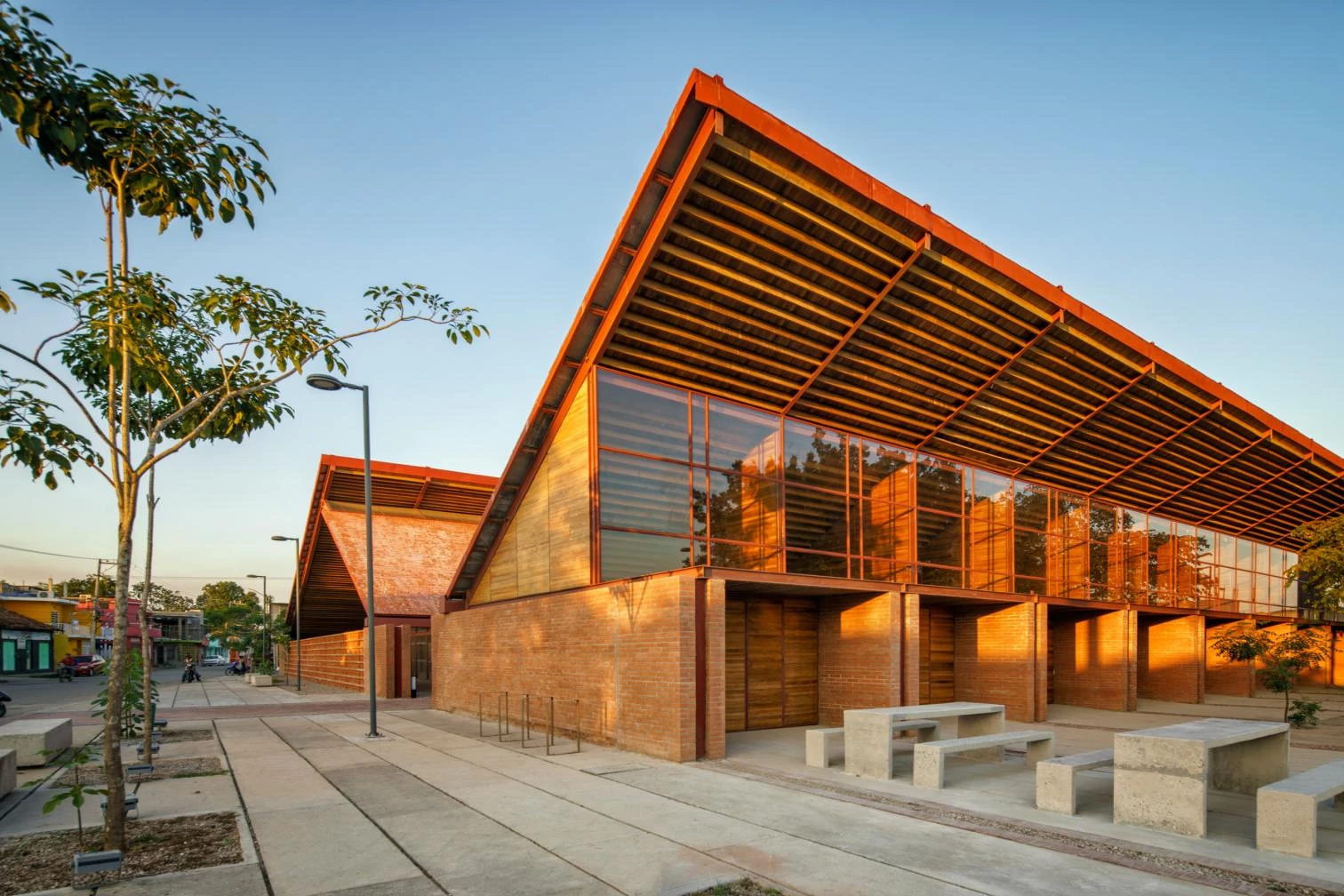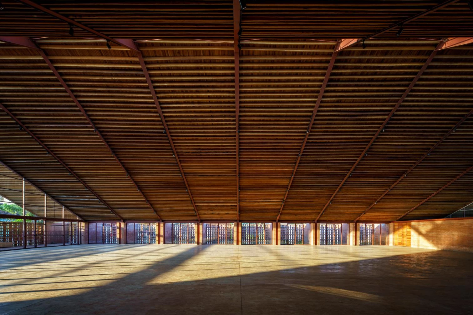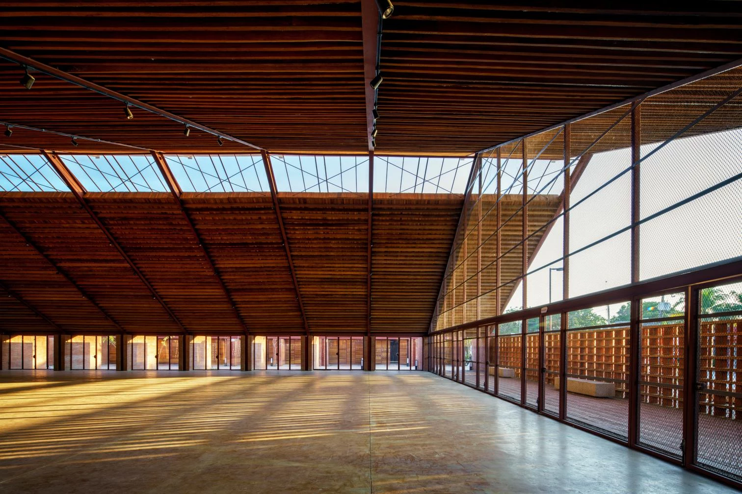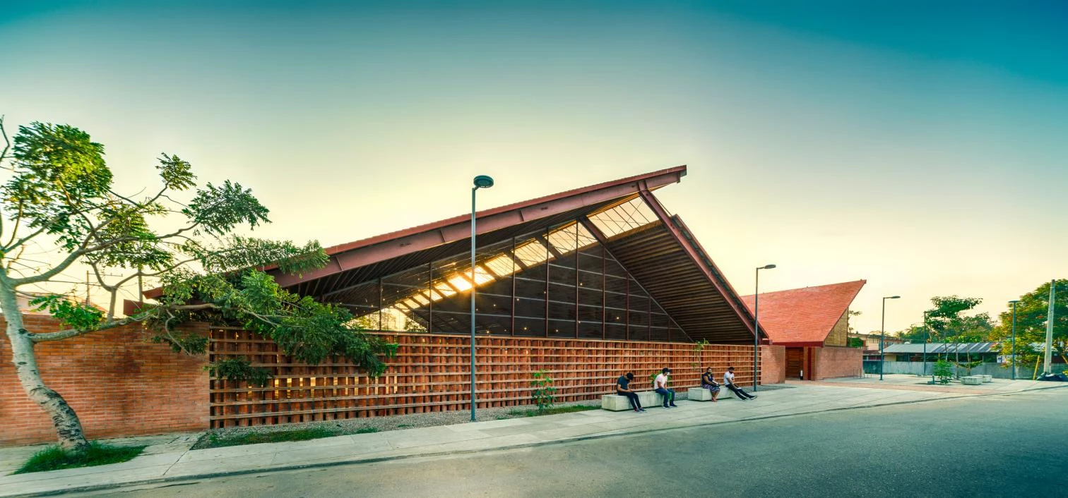 Cross ventilation is harnessed, as is the warmth of local materials: coconut wood and clay tiles, which besides ensuring good acoustics are an incentive to artisanal production. In addition, the building discharges clean water into the rivers, through a system that culminates in a series of treatment wetlands.