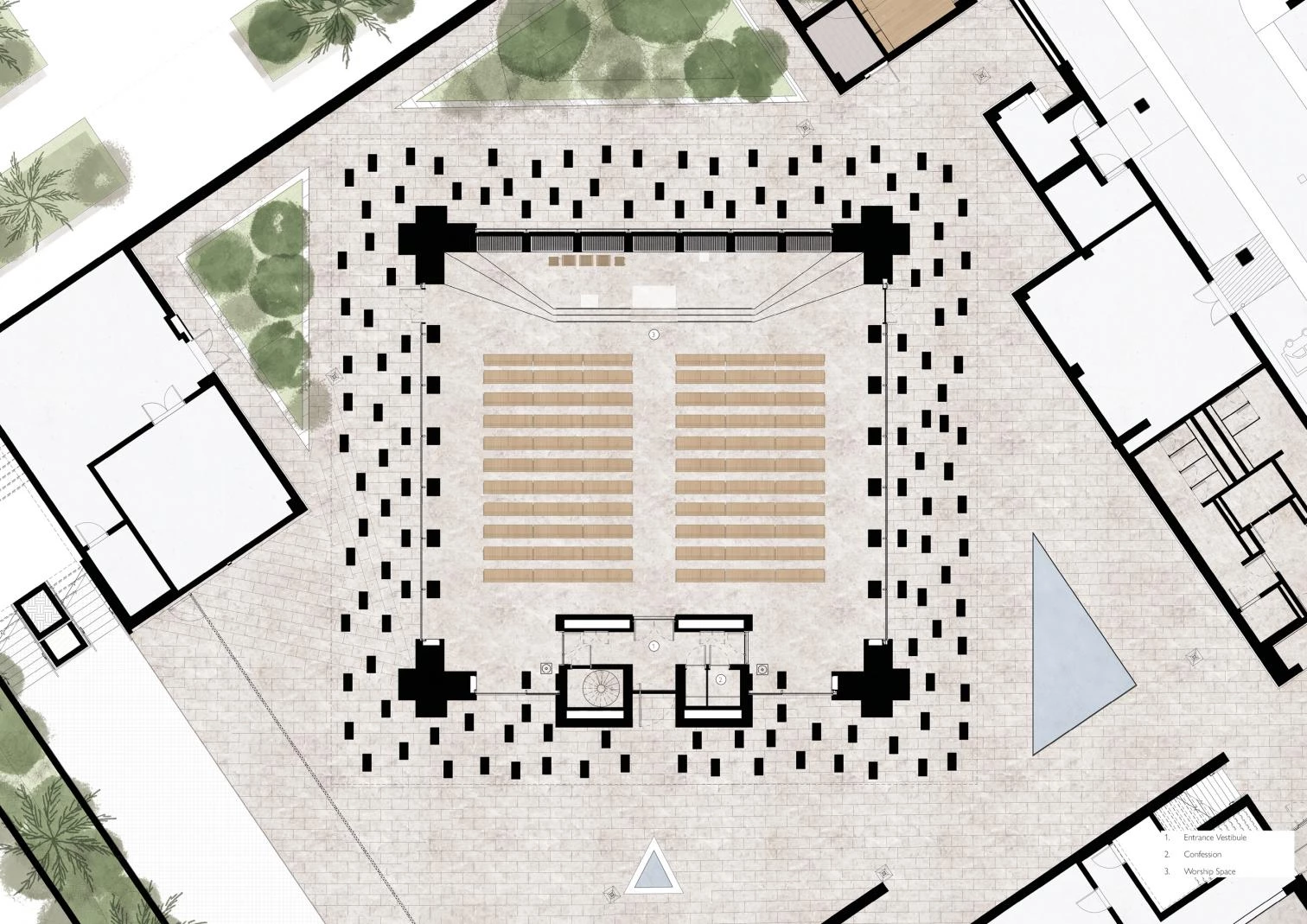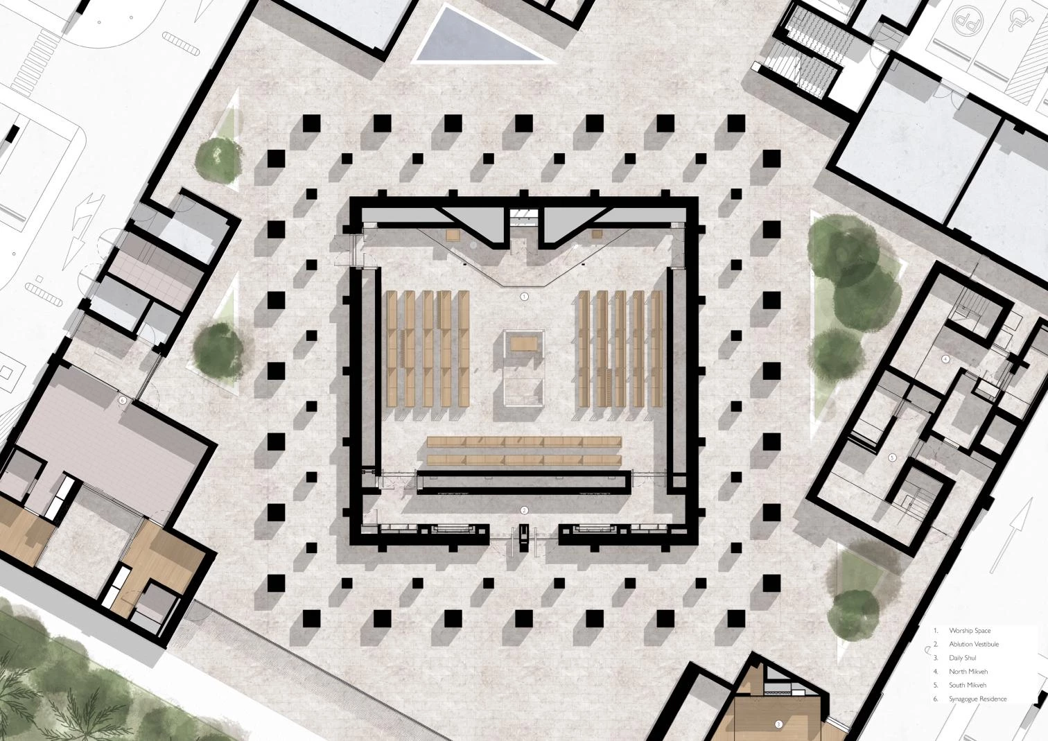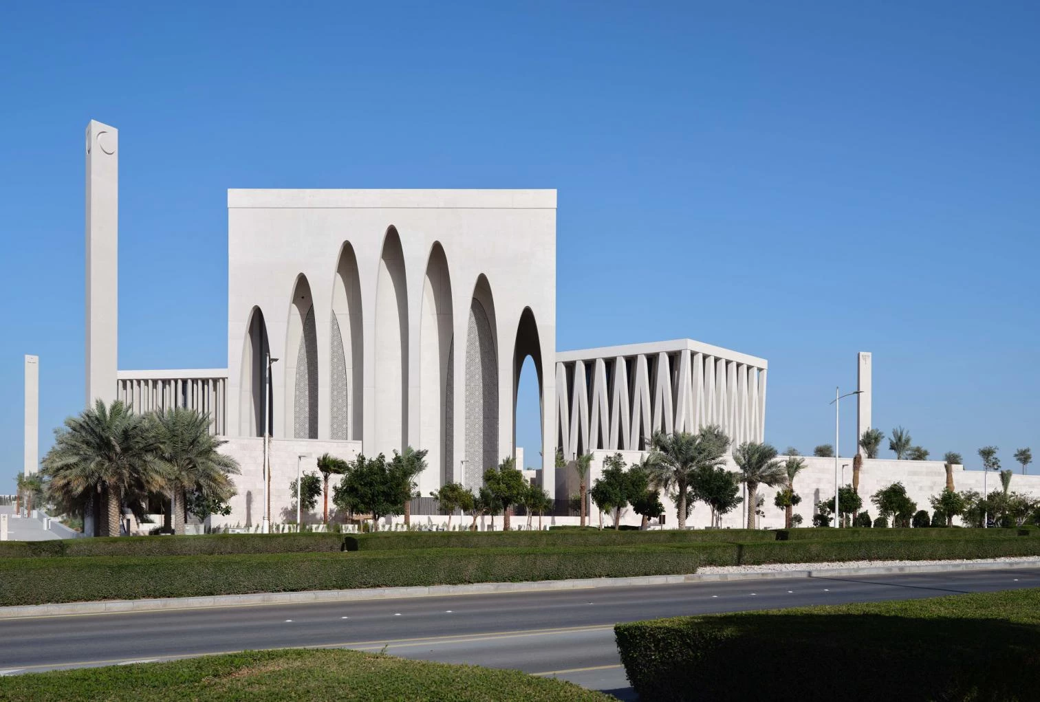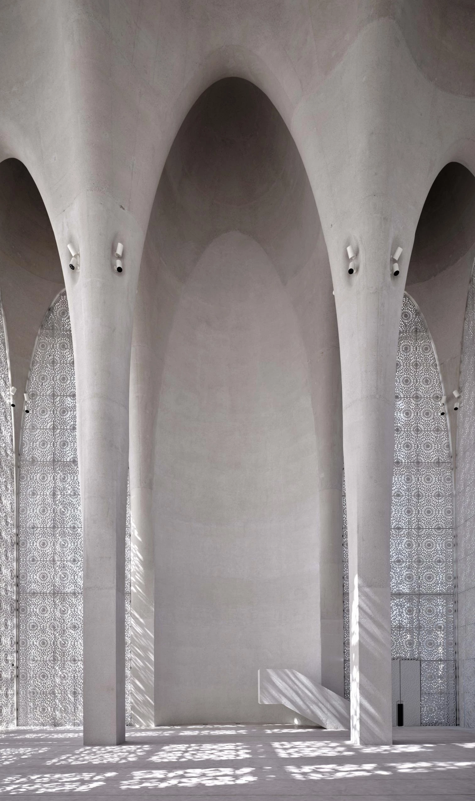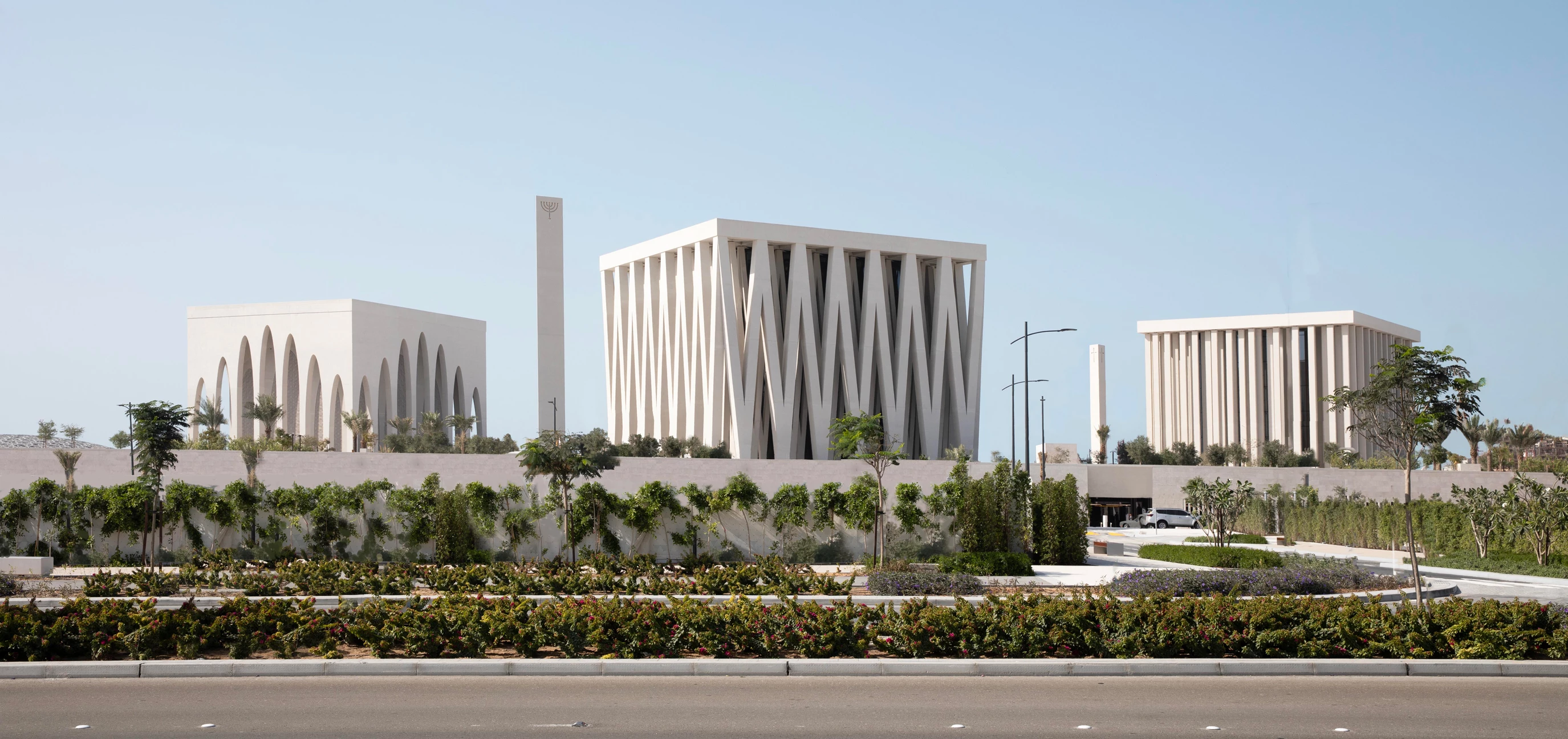 On Saadiyat Island in Abu Dhabi, the Abrahamic Family House headquarters has been inaugurated. It embodies the historical bonds linking three Abrahamic religions – Judaism , Christianity, and Islam – and provides a platform for dialogue and coexistence. The complex embraces a church, a mosque, and a synagogue on a one-level plinth that contains a library and exhibition galleries. Despite a seeming simplicity, each of the three cubes is defined by its own orientation and its use on the outside of a particular construction element: limestone pilasters in the church, elongated arches in the mosque, and V-shaped columns in the synagogue.