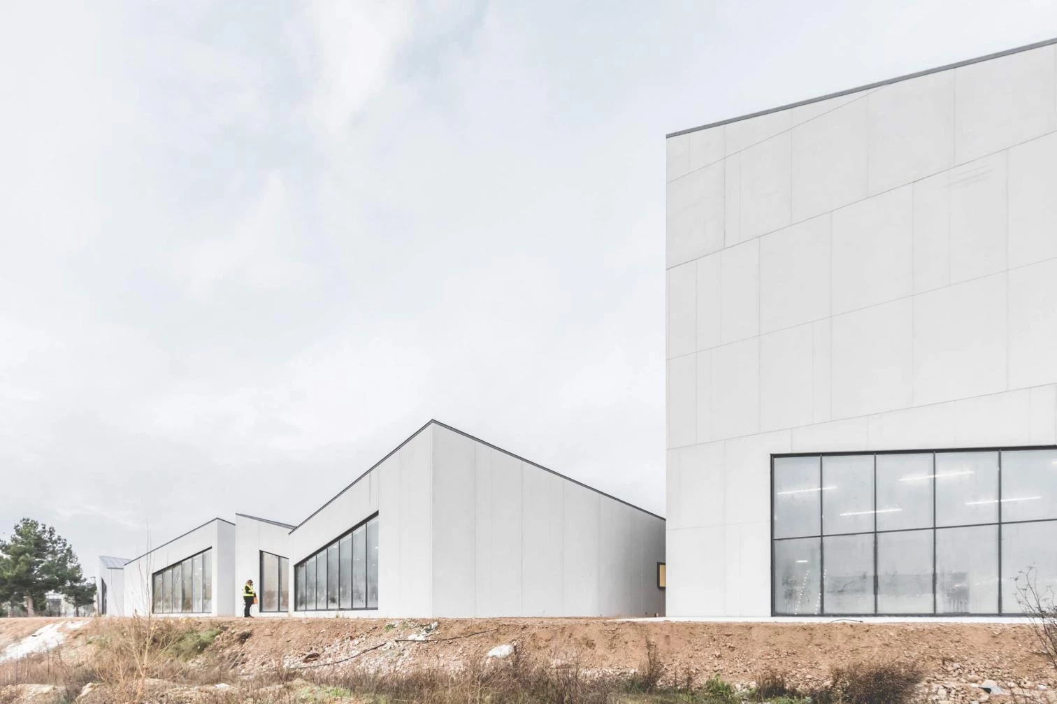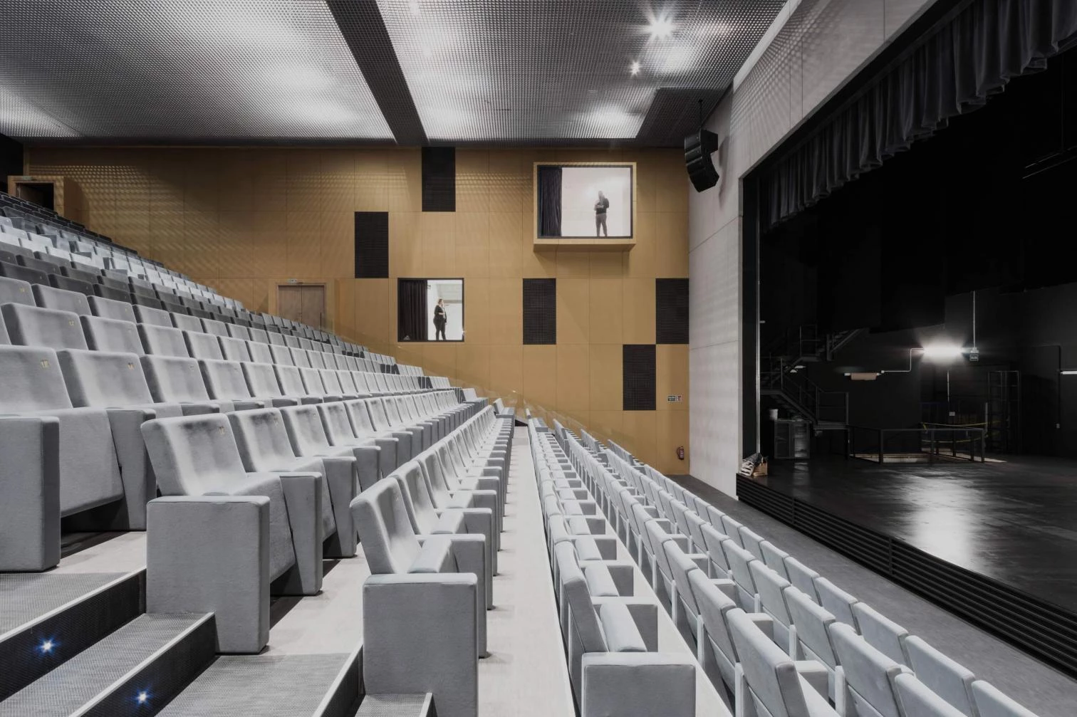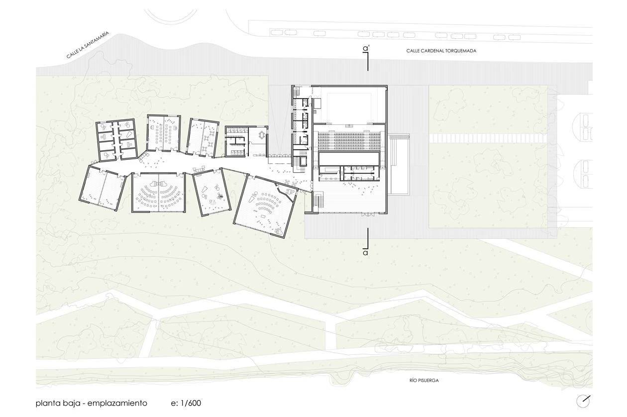 Addressing two different programs, the complex breaks up into interconnected separate volumes on the banks of the Pisuerga River. The largest, at the site’s north end, harbors the auditorium seating 608. The smaller ones contain the music school’s classrooms.