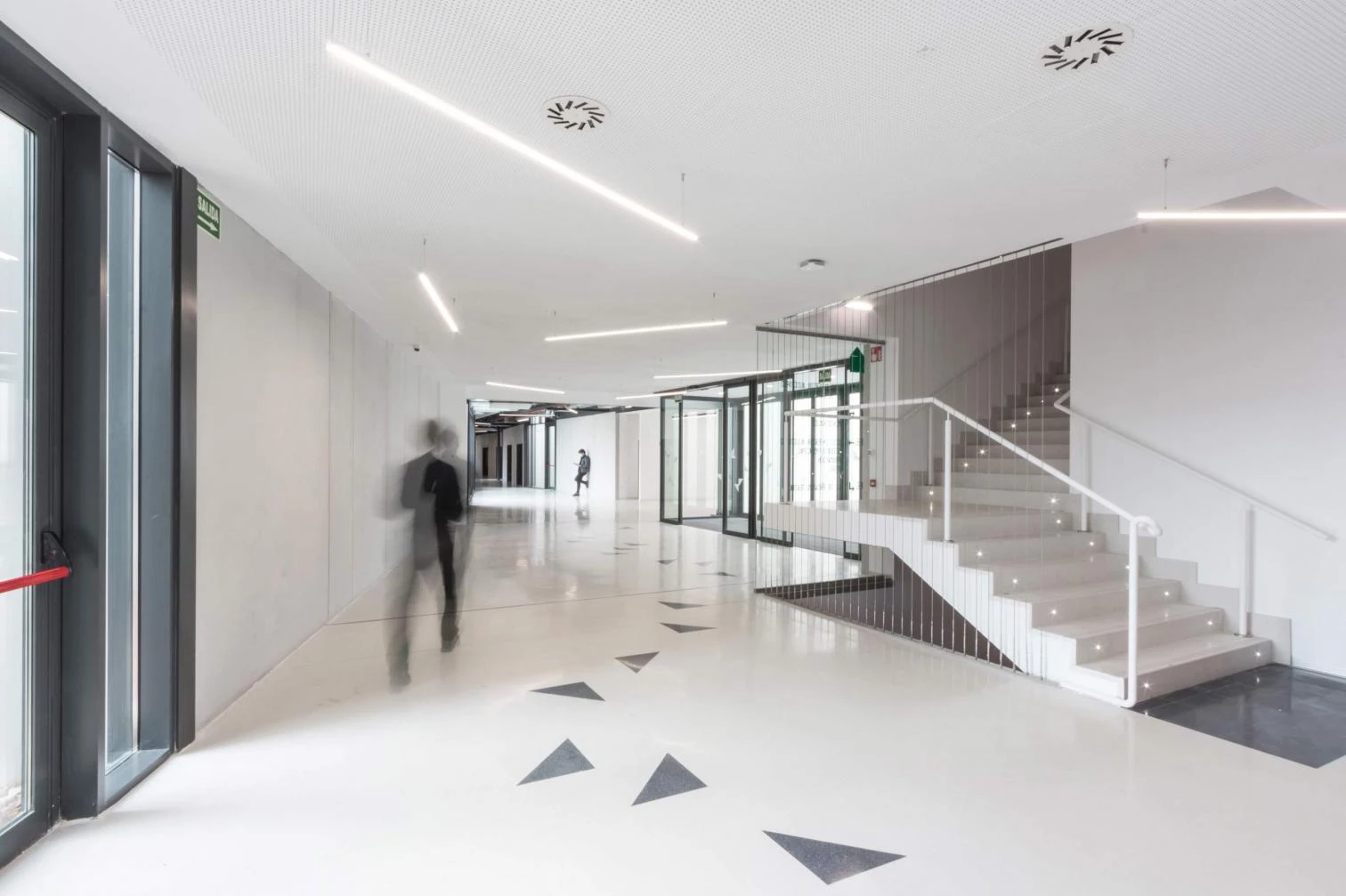 This ‘atomization’ avoids a visually massive building and results in a better blending with the natural environs as well as better acoustics – so that sounds produced in different spaces do not mix, a must in facilities of this kind. It also creates open courtyards that are thought of as an extension of the surrounding park. The classroom ceilings are likewise fragmented into triangular pieces made of different materials, forming an irregular geometry that disperses sound homogeneously.