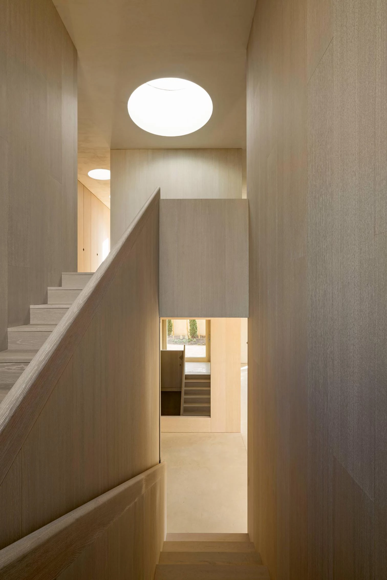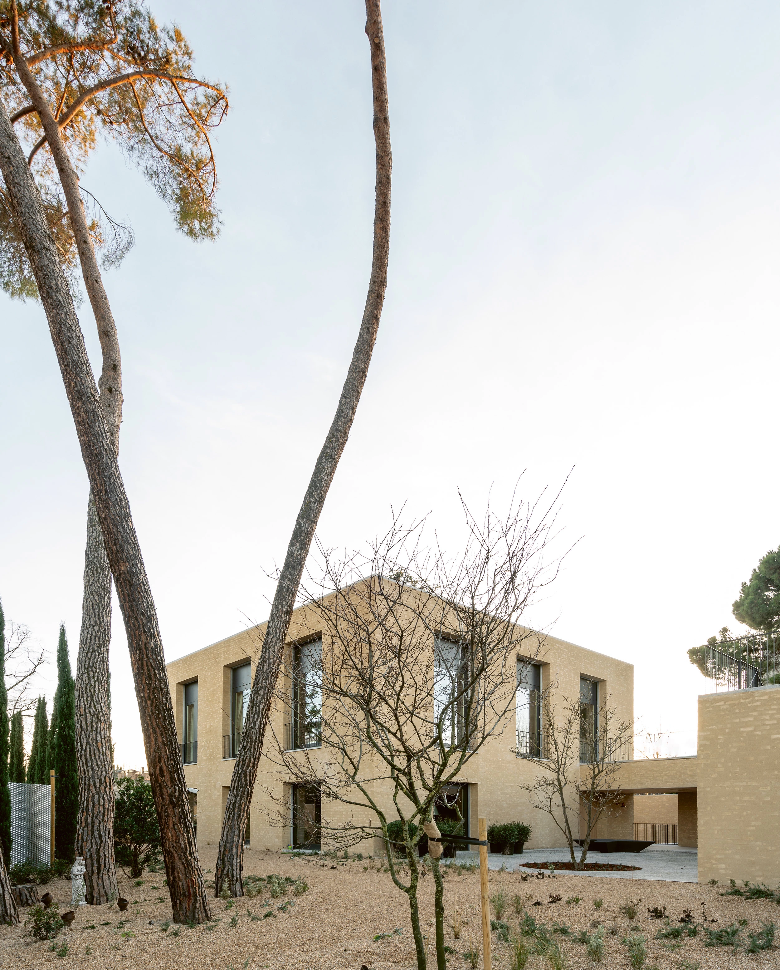The brick house is built on a plot qualified by a group of tall pine trees, located at its northeast corner, and by the silent proximity of Monte del Pardo, along its north face.
